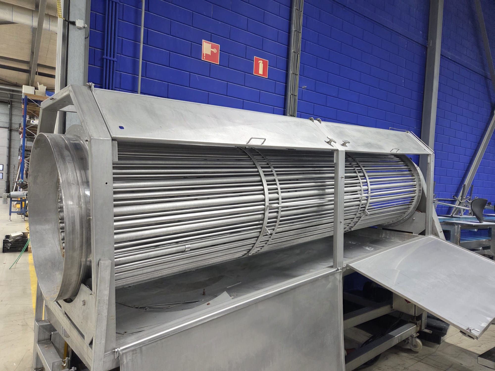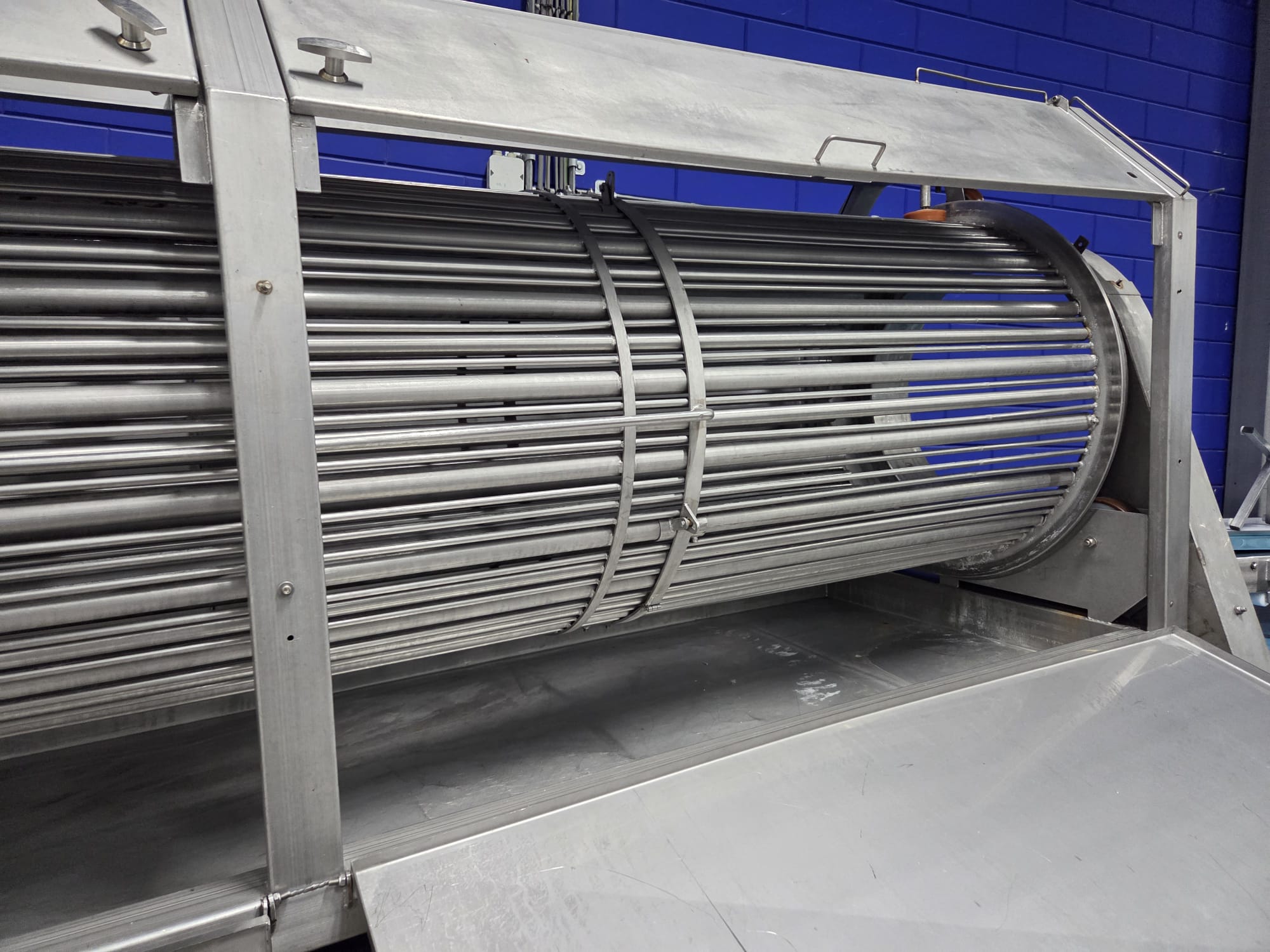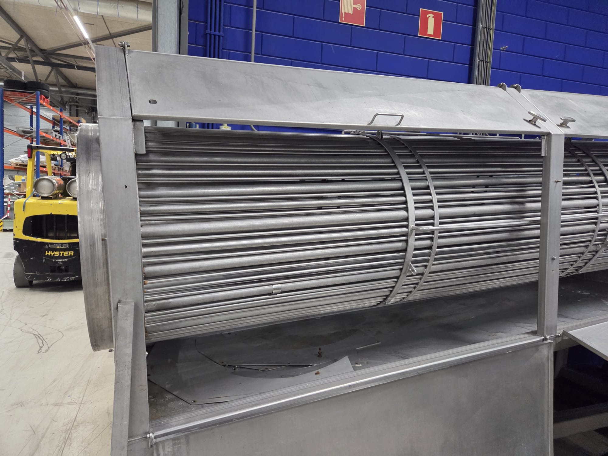 Fomaco s/s mobile continuous tumbler, diameter drum: 830 mm, total dimensions: 3750 mm x 1400 mm x 2400 mm. Including motor. Incomplete, missing hydraulic cylinder and pump.