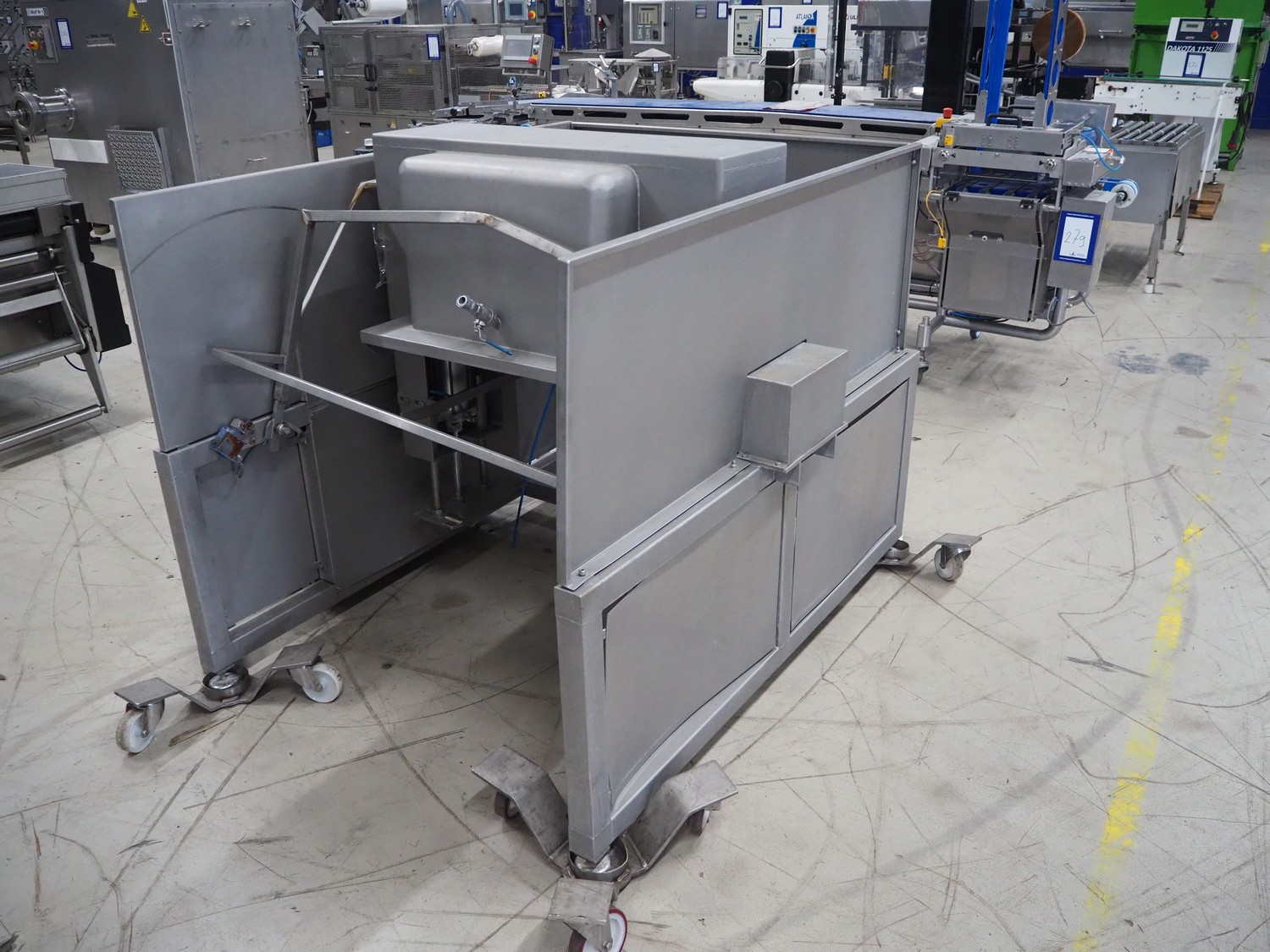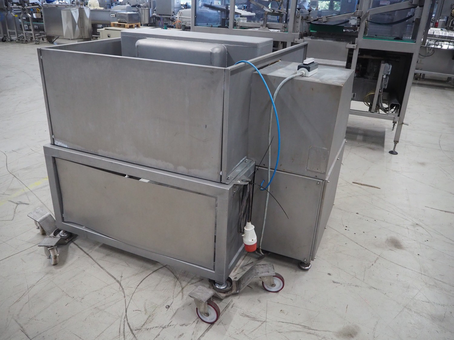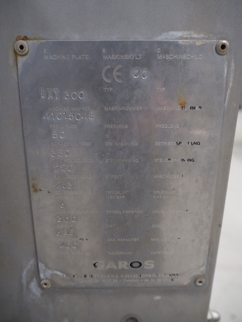 Garos tumbler for 200 liter meat bins, type: GAT 300, machine number: 41015048, year of construction: 2000, 380/220 V, 50 Hz, 2.3 A, weight: 685 kg, capacity: 400 kg, dimensions: 1750 mm x 1600 mm x 1300 mm. Without rollies.