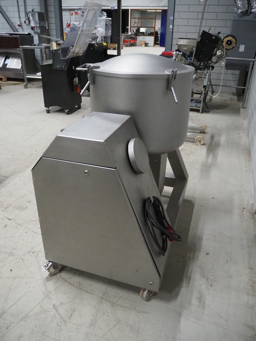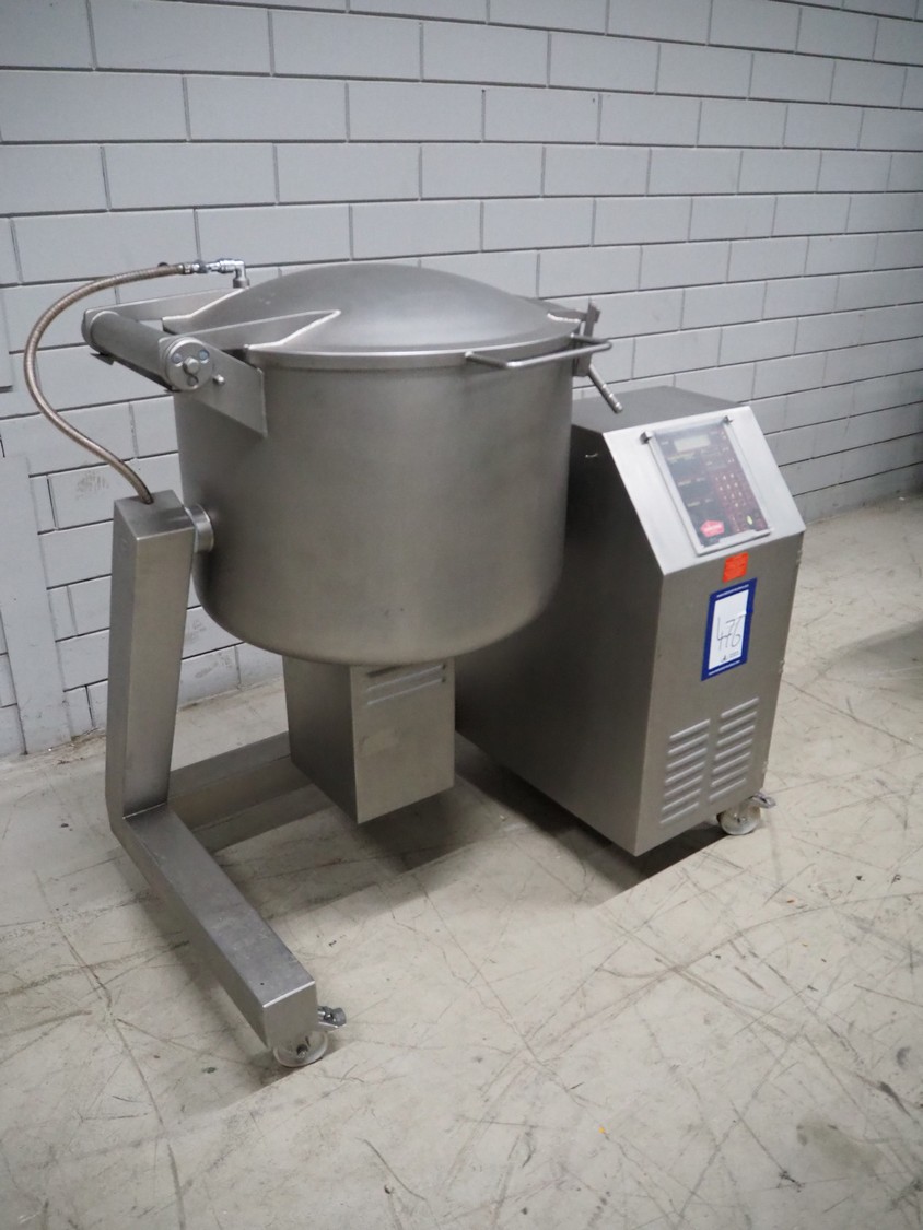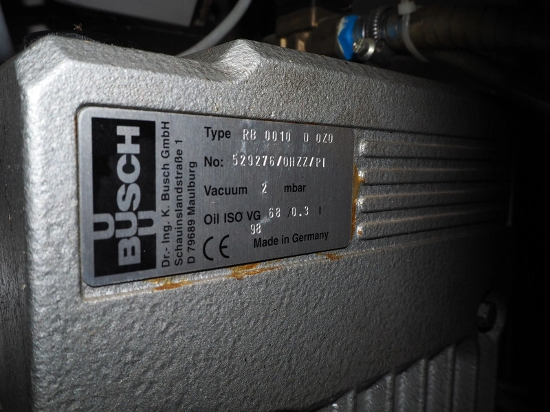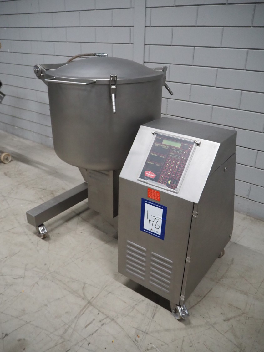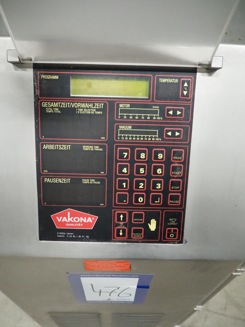 Vakona GmbH cooled vacuum tumbler, type: 125ESKSTL, number: 8065, year of construction: 1999, 230/400 V, 50 Hz, 1.6 A, 1.9 kW, volume: 125 liter, Busch vacuum pump, type: RB 0010 D OZO, year of construction: 1998, capacity: 10 m³ per hour, total dimensions: 1330 mm x 600 mm x 1330 mm.