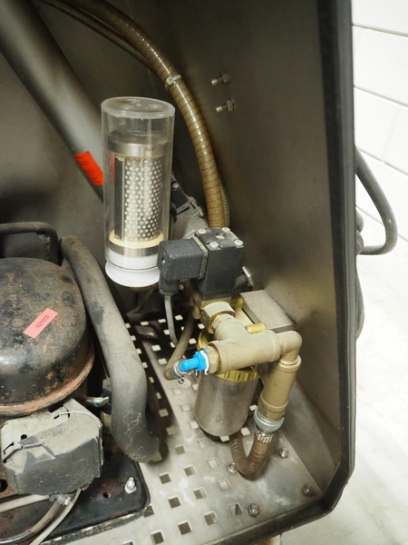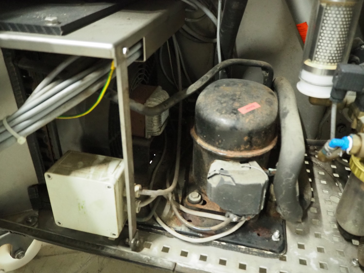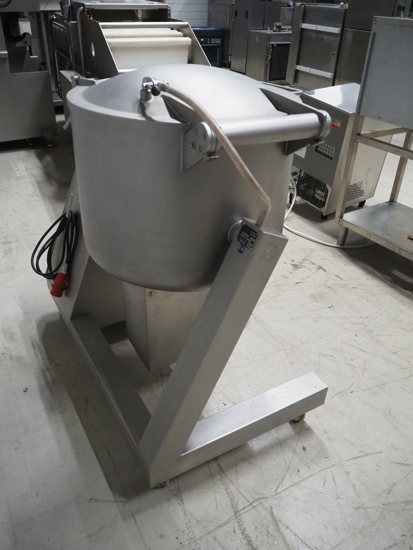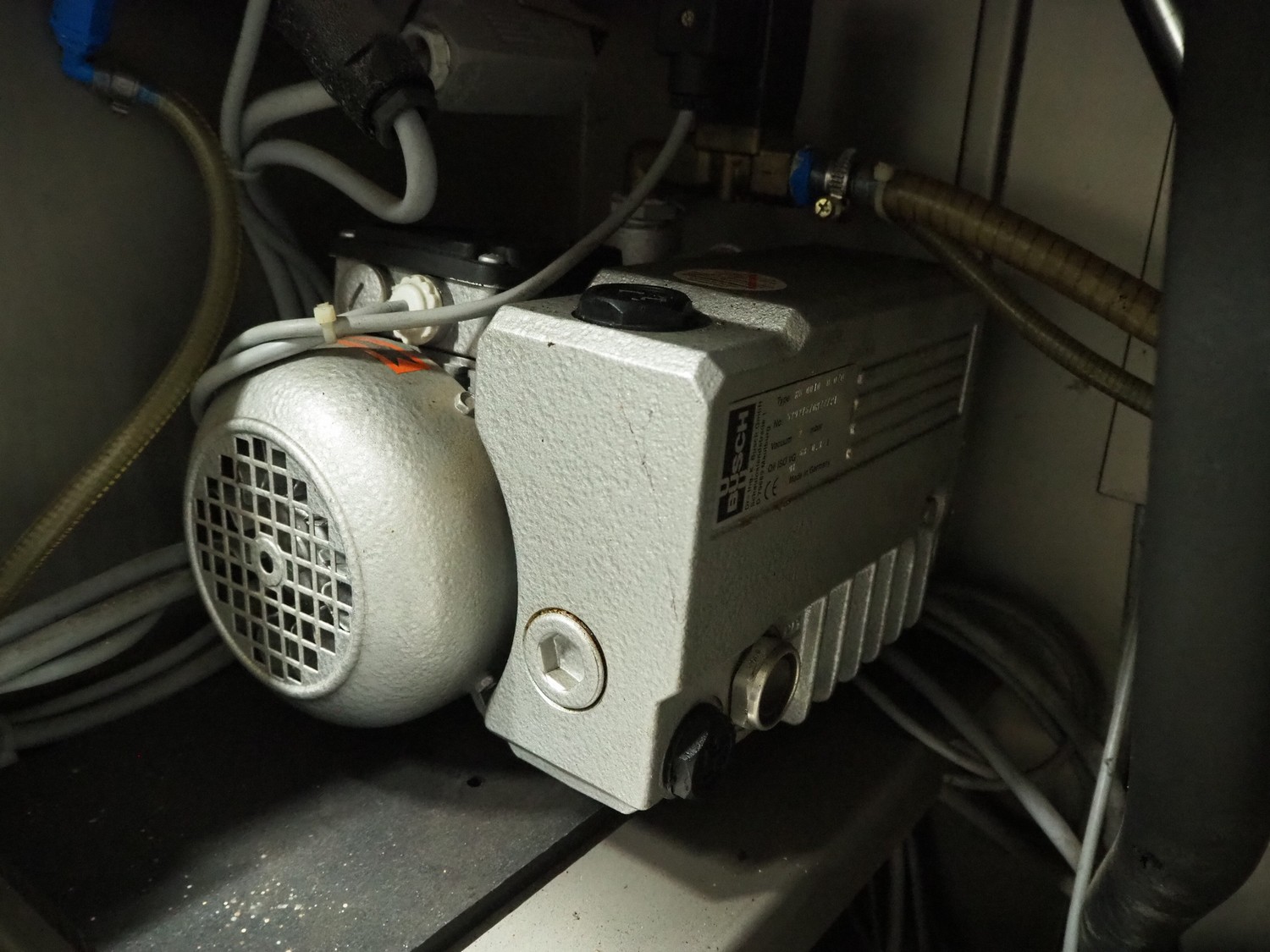 Vakona GmbH cooled vacuum tumbler, type: 125ESKSTL, number: 8065, year of construction: 1999, 230/400 V, 50 Hz, 1.6 A, 1.9 kW, volume: 125 liter, Busch vacuum pump, type: RB 0010 D OZO, year of construction: 1998, capacity: 10 m³ per hour, total dimensions: 1330 mm x 600 mm x 1330 mm.