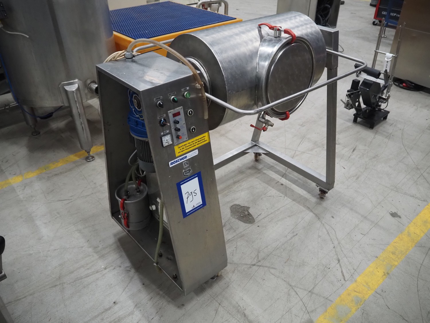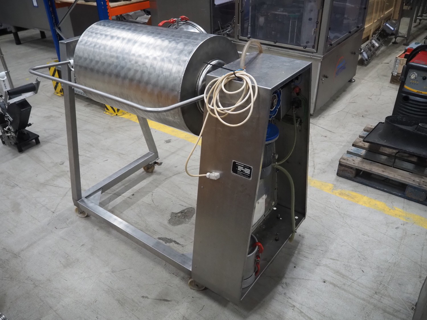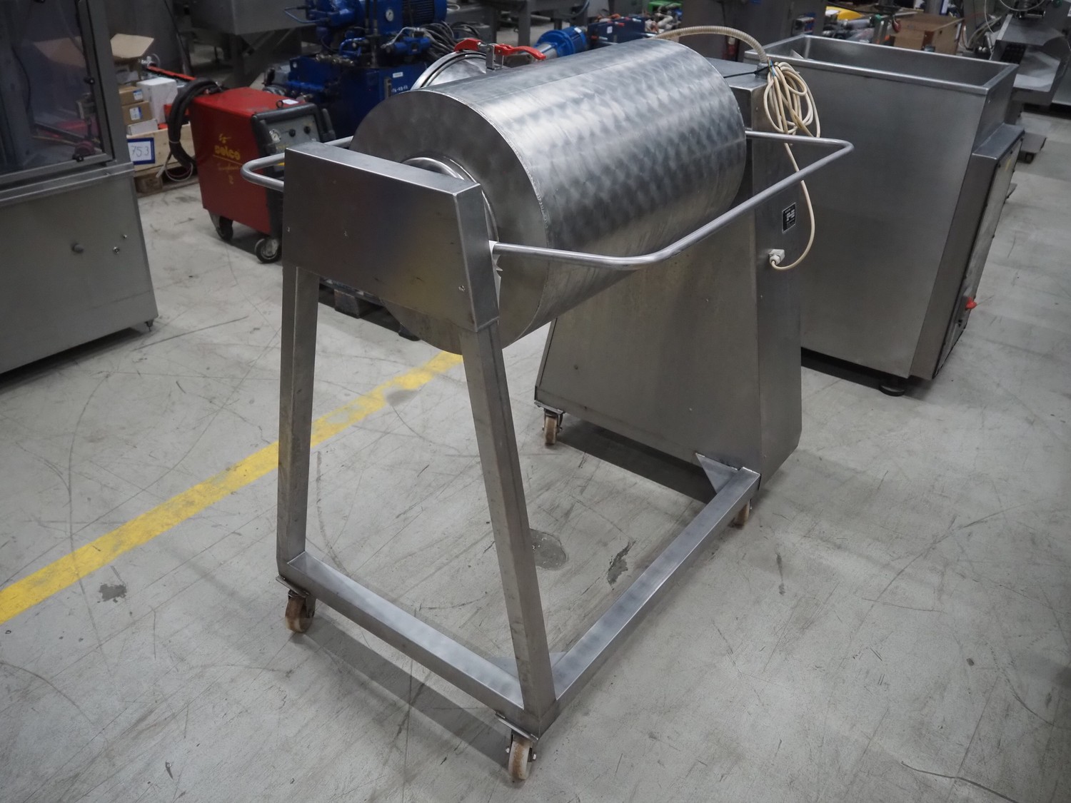 Röschermatic mobile vacuum tumbler, type: TU-E150, number: 7270018, 220 V, 1 Ph, 50 Hz, 0.87 kW, volume: 150 liter, total dimensions: 1420 mm x 970 mm x 1330 mm.