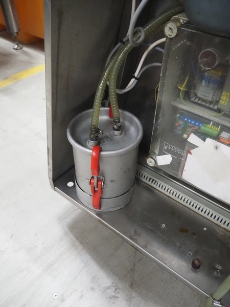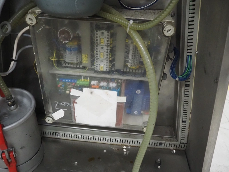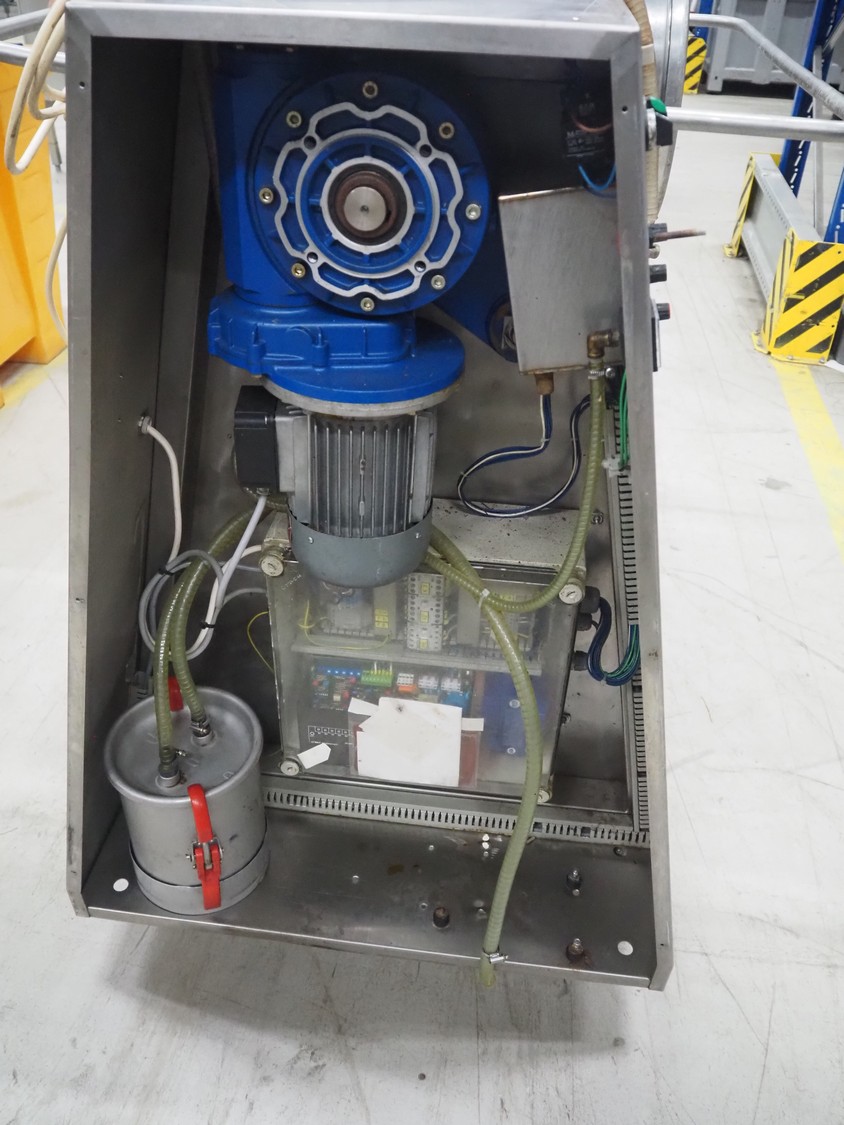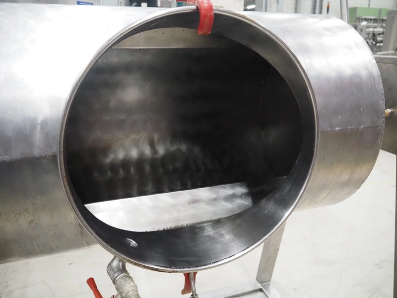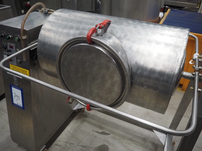 Röschermatic mobile vacuum tumbler, type: TU-E150, number: 7270018, 220 V, 1 Ph, 50 Hz, 0.87 kW, volume: 150 liter, total dimensions: 1420 mm x 970 mm x 1330 mm.