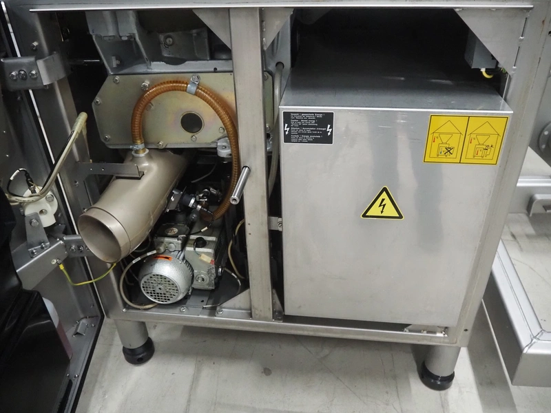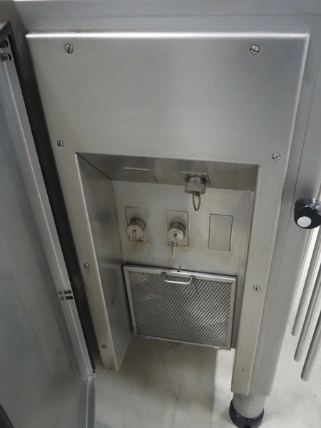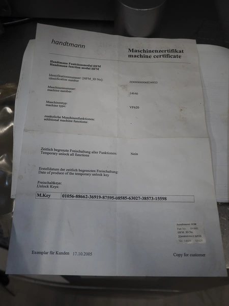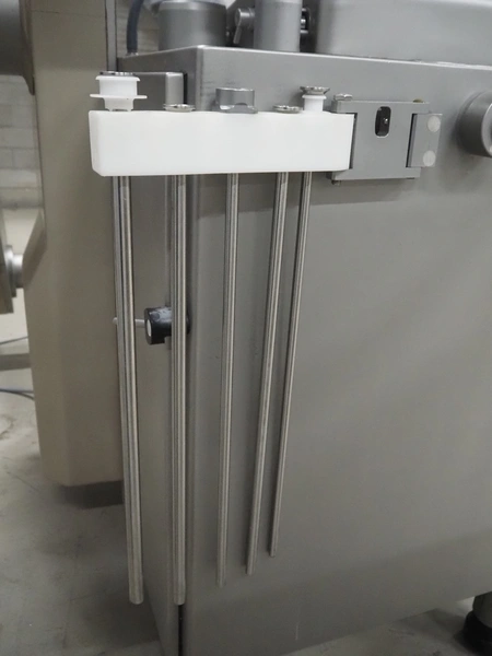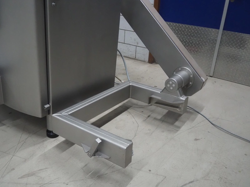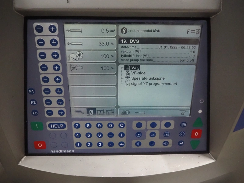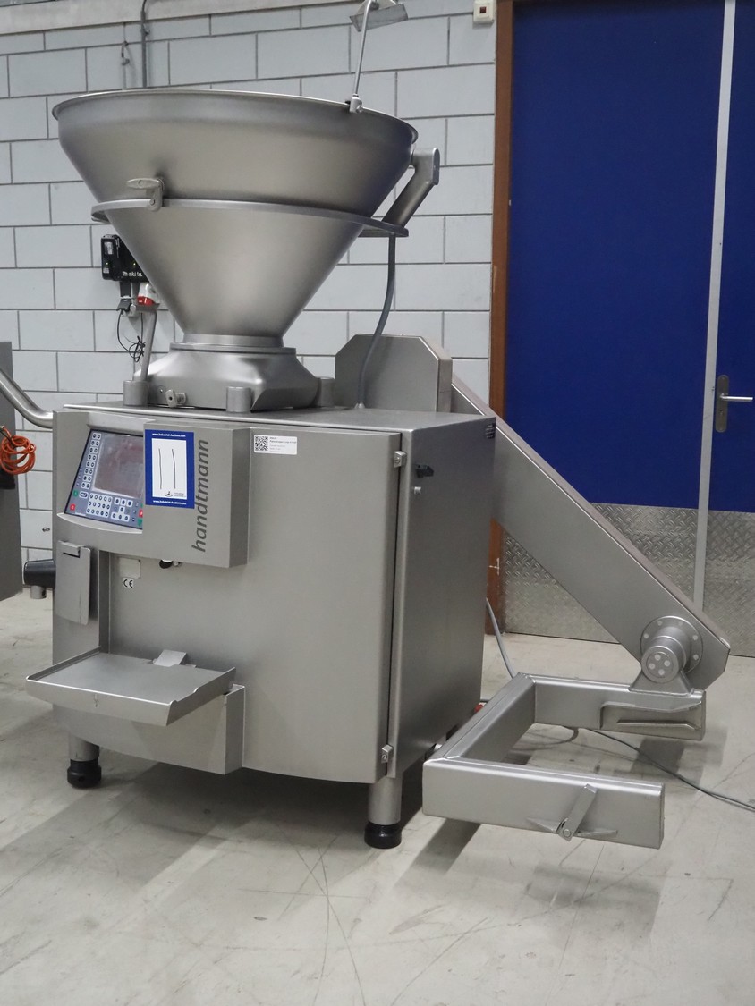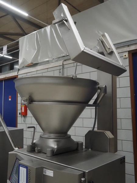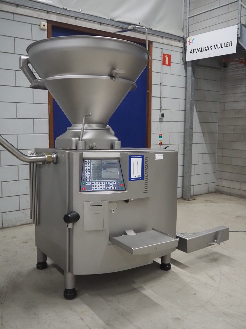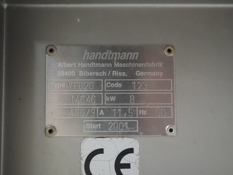 Handtmann vacuum filling machine with lifter for meat bins, type: VF620, number: 14646, year of construction: 2001, 400 V, 3 Ph, 50 Hz, 11.5 A, 8.0 kW, Busch vacuum pump, type: KB 0016, capacity: 16 m³ per hour, dimensions: 2130 mm x 1360 mm x 1950 mm.