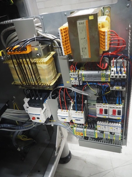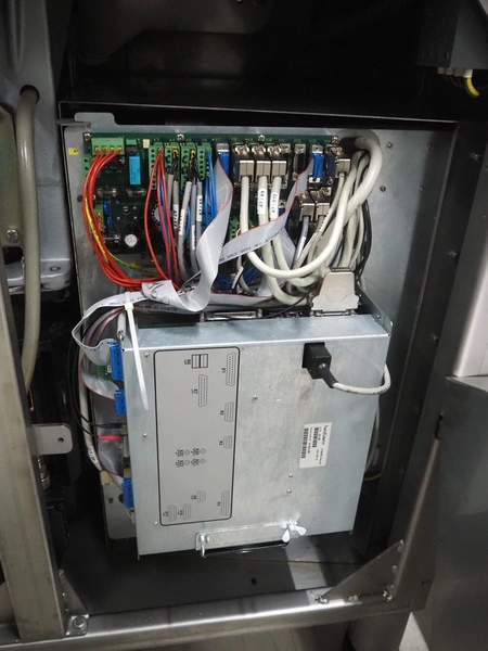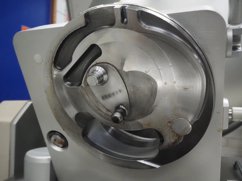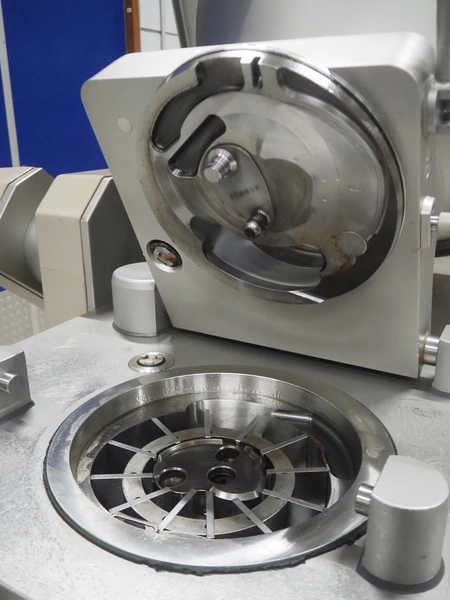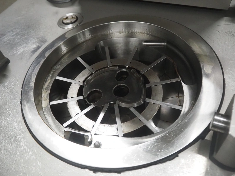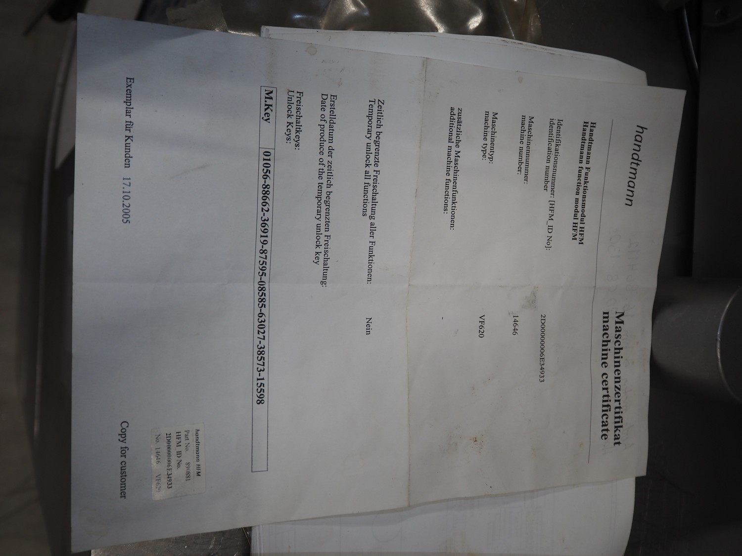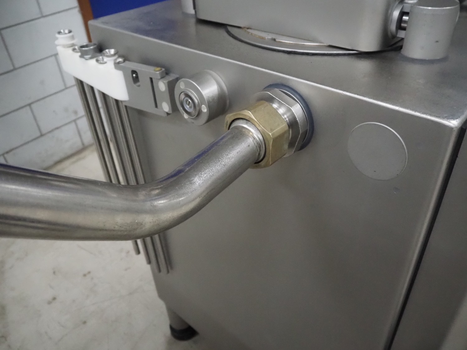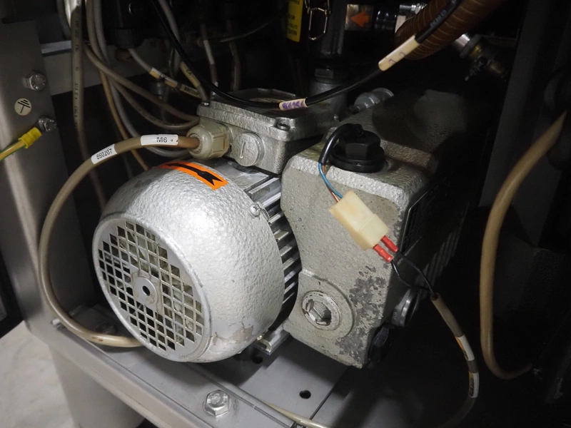 Handtmann vacuum filling machine with lifter for meat bins, type: VF620, number: 14646, year of construction: 2001, 400 V, 3 Ph, 50 Hz, 11.5 A, 8.0 kW, Busch vacuum pump, type: KB 0016, capacity: 16 m³ per hour, dimensions: 2130 mm x 1360 mm x 1950 mm.