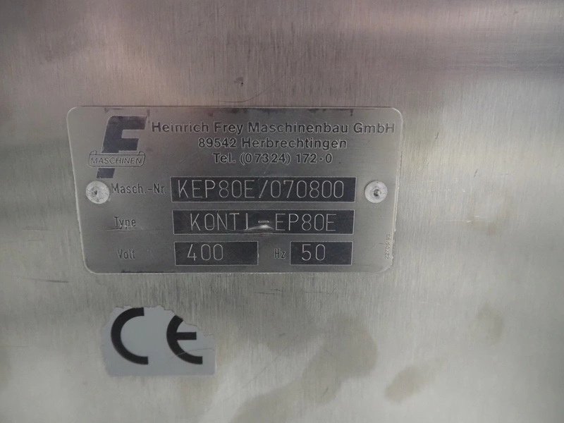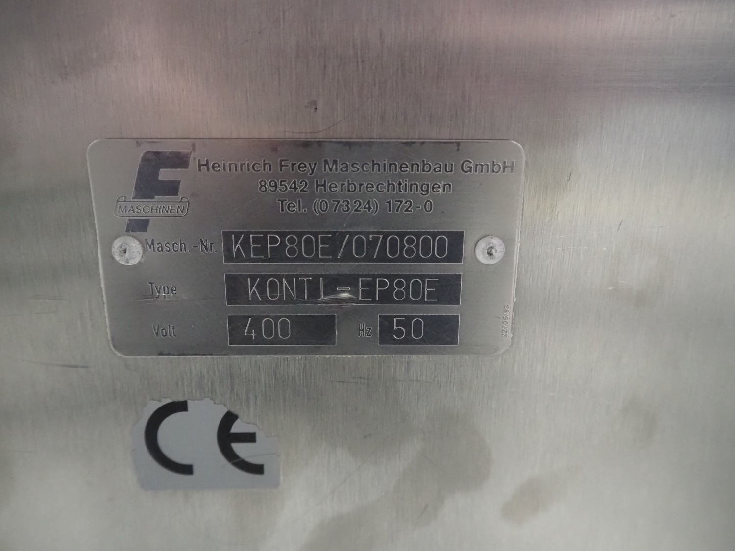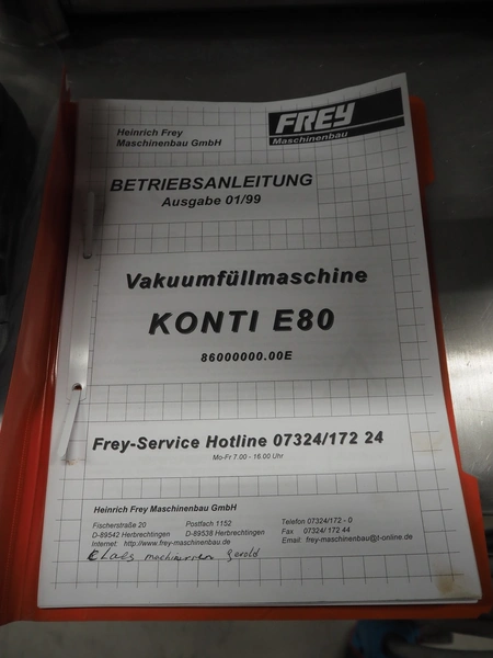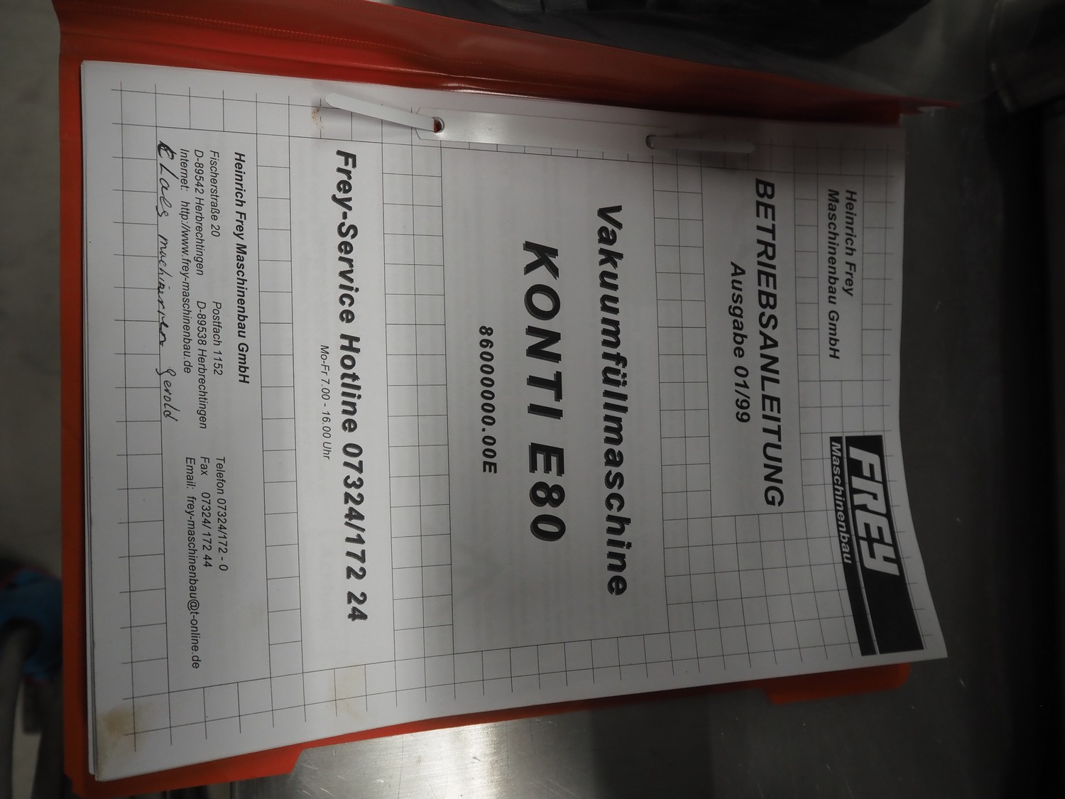 Frey vacuum filling machine, type: KONTI-EP80E, machine number: KEP80E/070800, 400 V, 50 Hz, dimensions: 950 mm x 700 mm x 1620 mm. Without rotor and vanes.