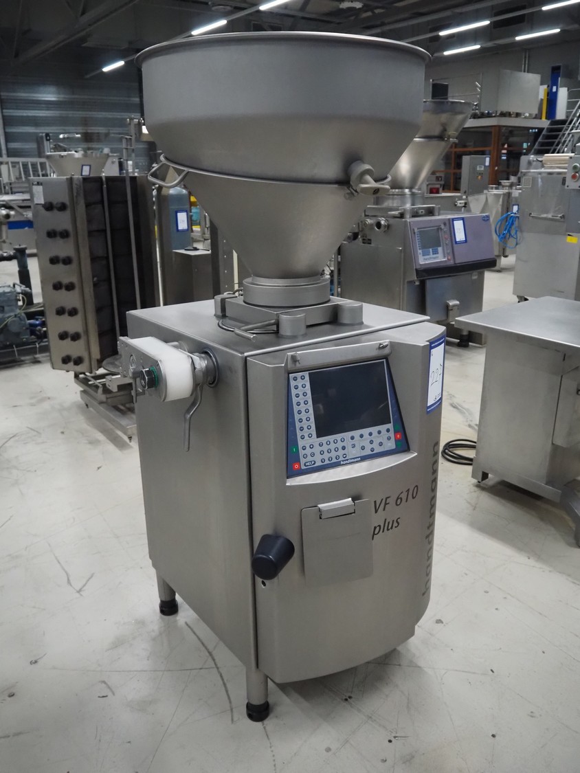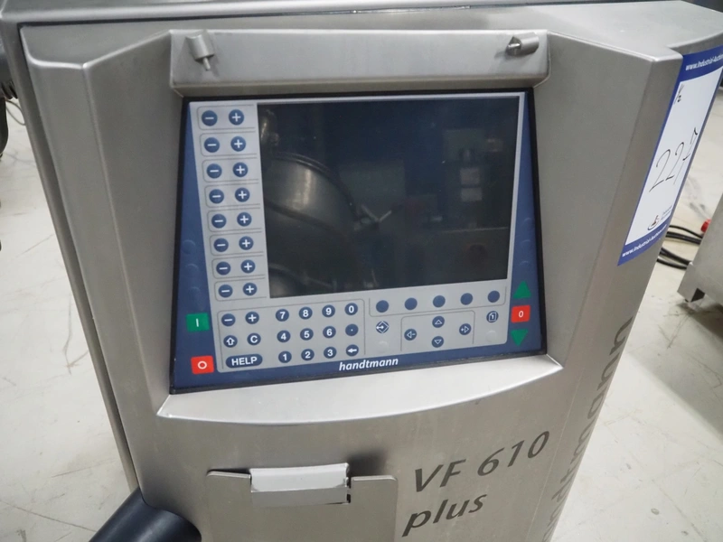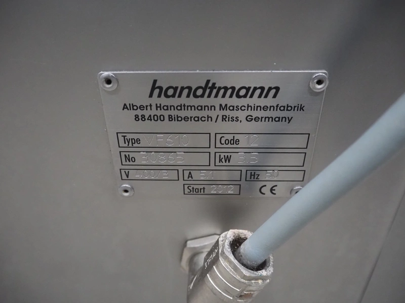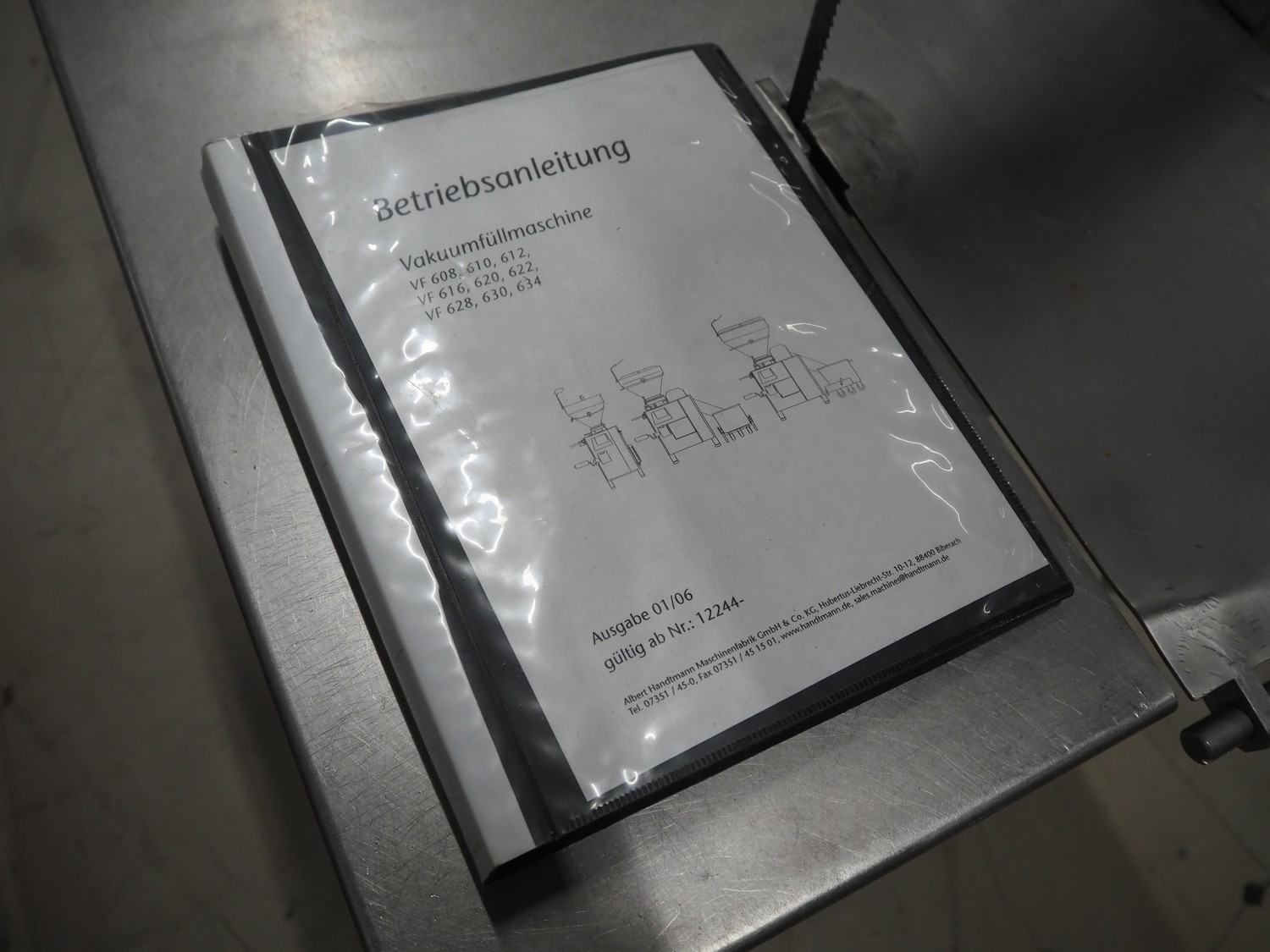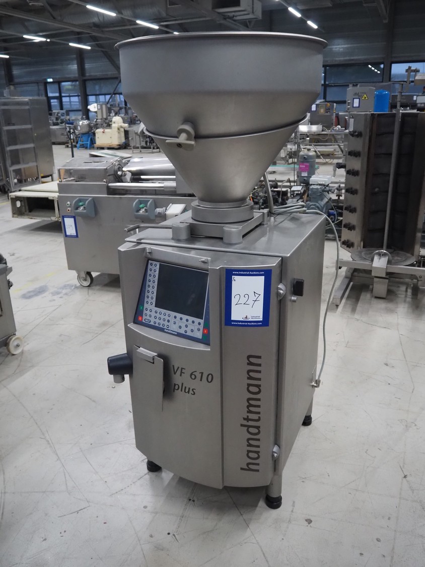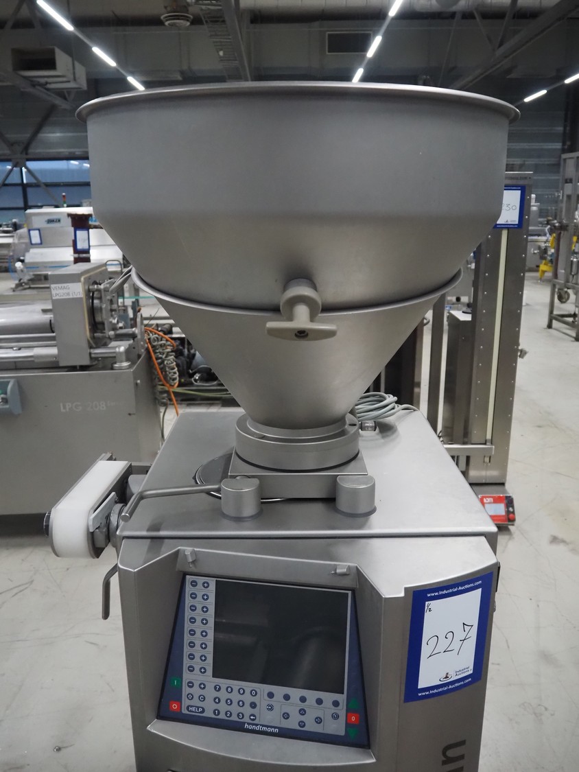 Handtmann vacuum filling machine with linking attachment, type: VF610, number: 30865, year of construction: 2012, 400 V, 3 Ph, 50 Hz, 3.5 kW, number attachment: 34-5/13325773, Busch vacuum pump, type: KC 0016 E 3Z0, number: 120001169, year of construction: 2011, capacity: 16 m³ per hour, dimensions: 870 mm x 780 mm x 1770 mm.
