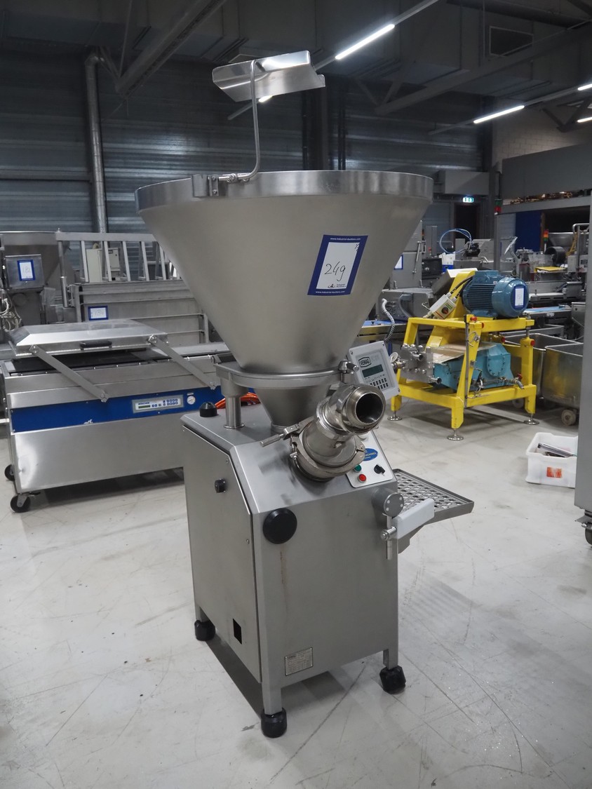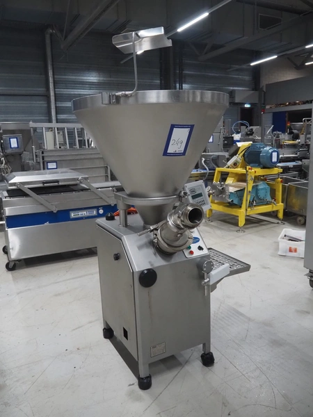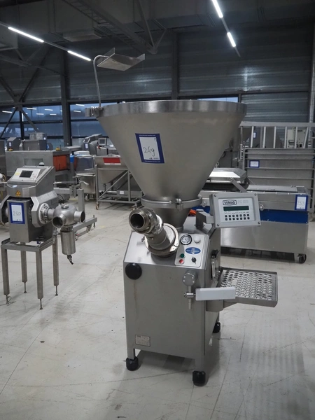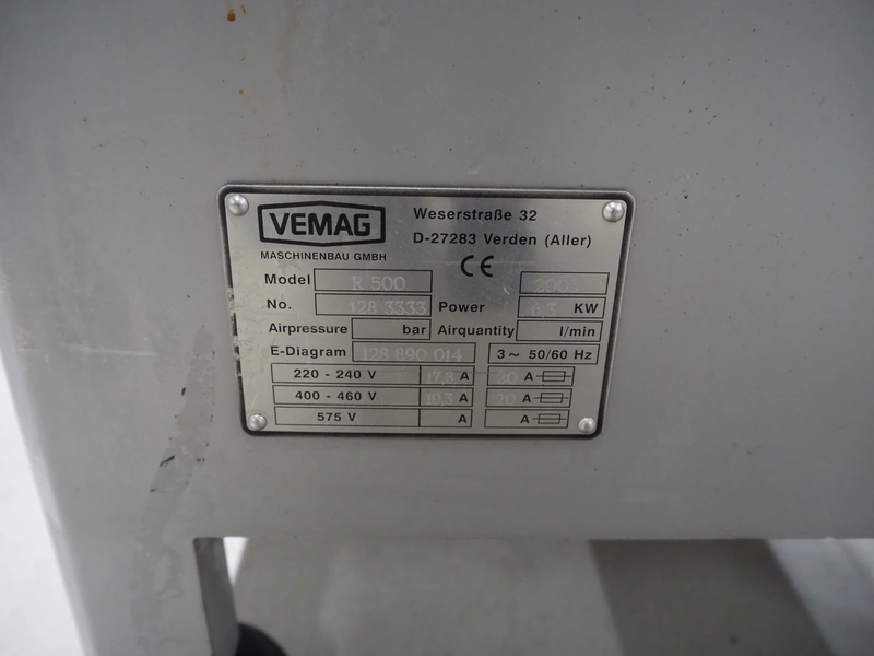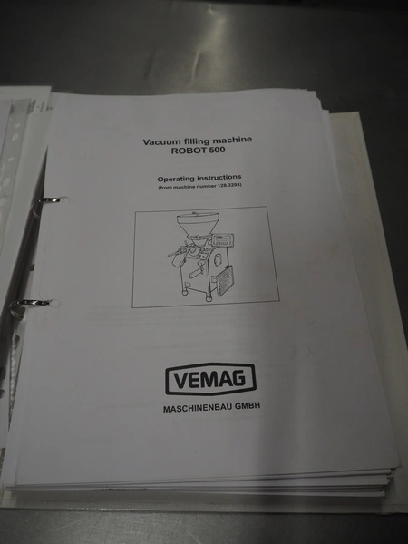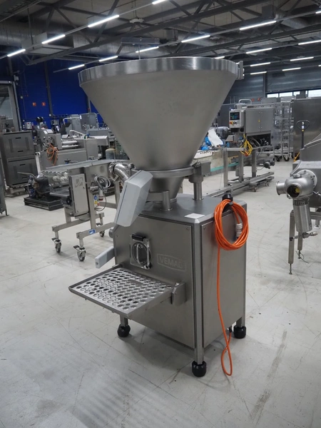 Vemag vacuum filling machine with grinding head, model: R 500, number: 128 3333, year of construction: 2005, 220-240/400-460 V, 3 Ph, 50/60 Hz, 17.8/20 A, dimensions: 1000 mm x 800 mm x 1830 mm. Including crate with parts.