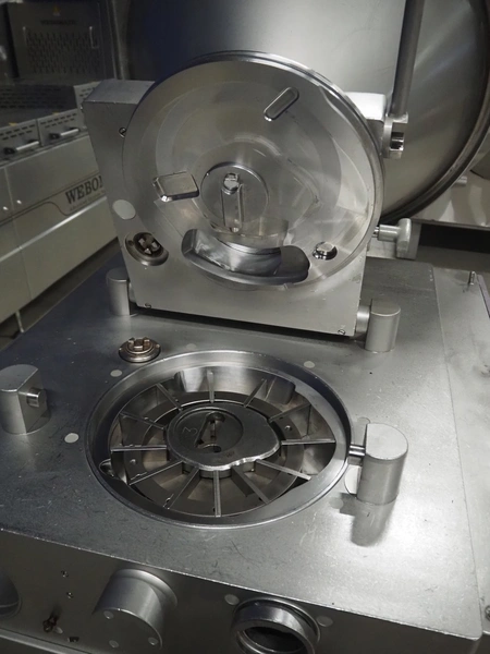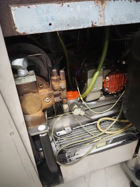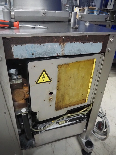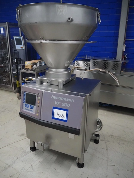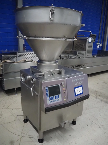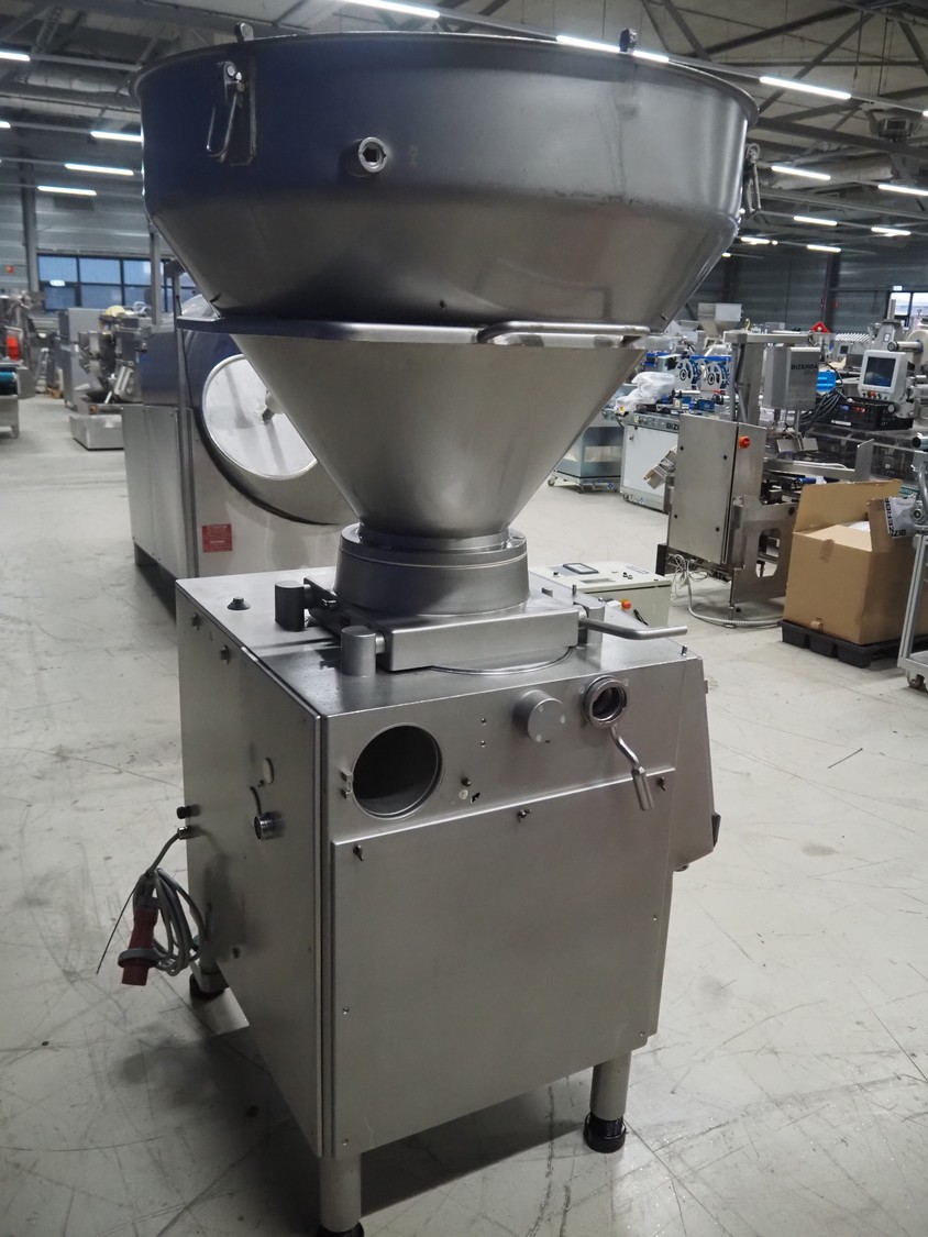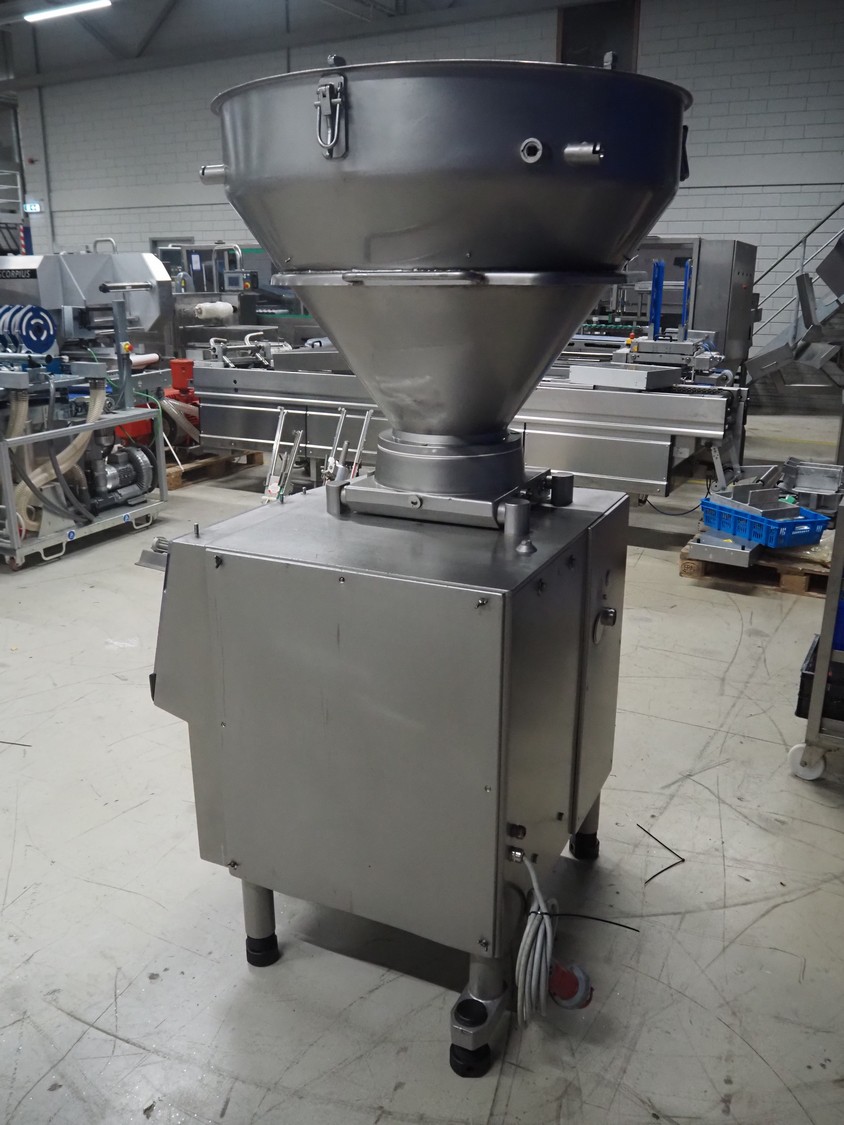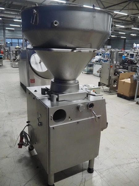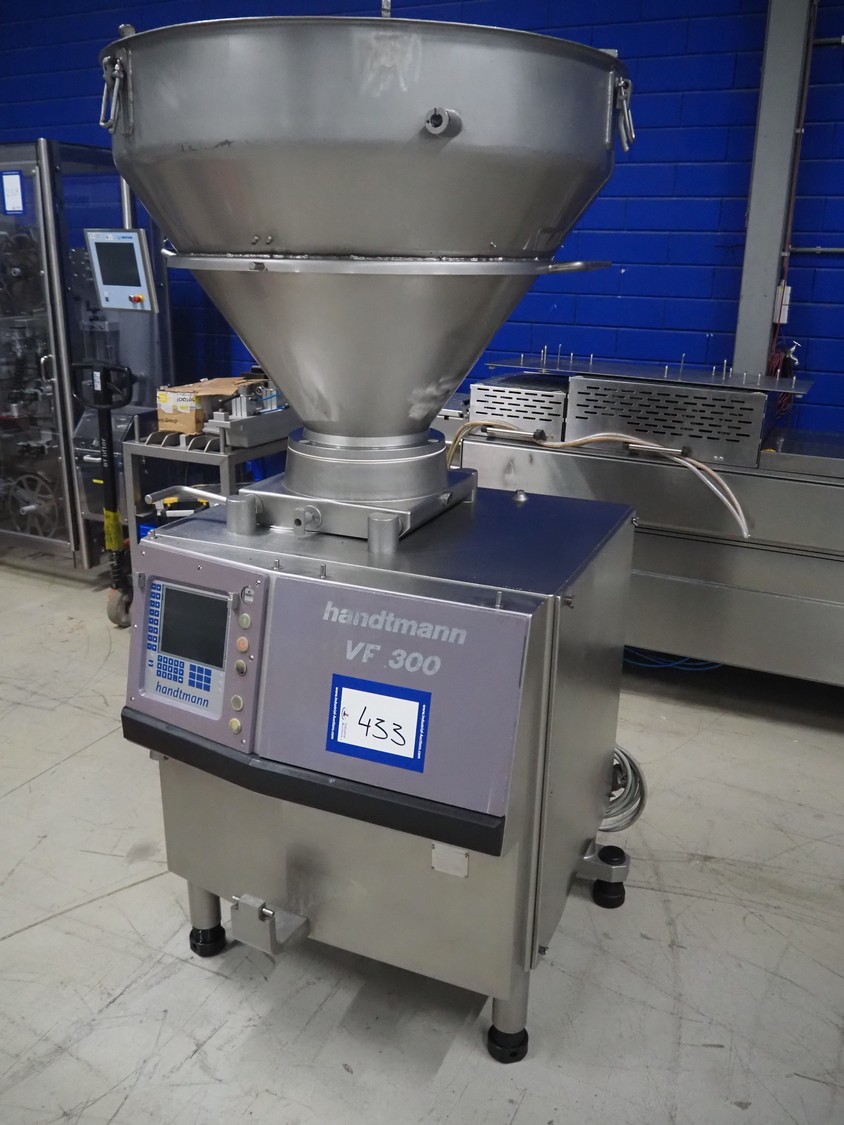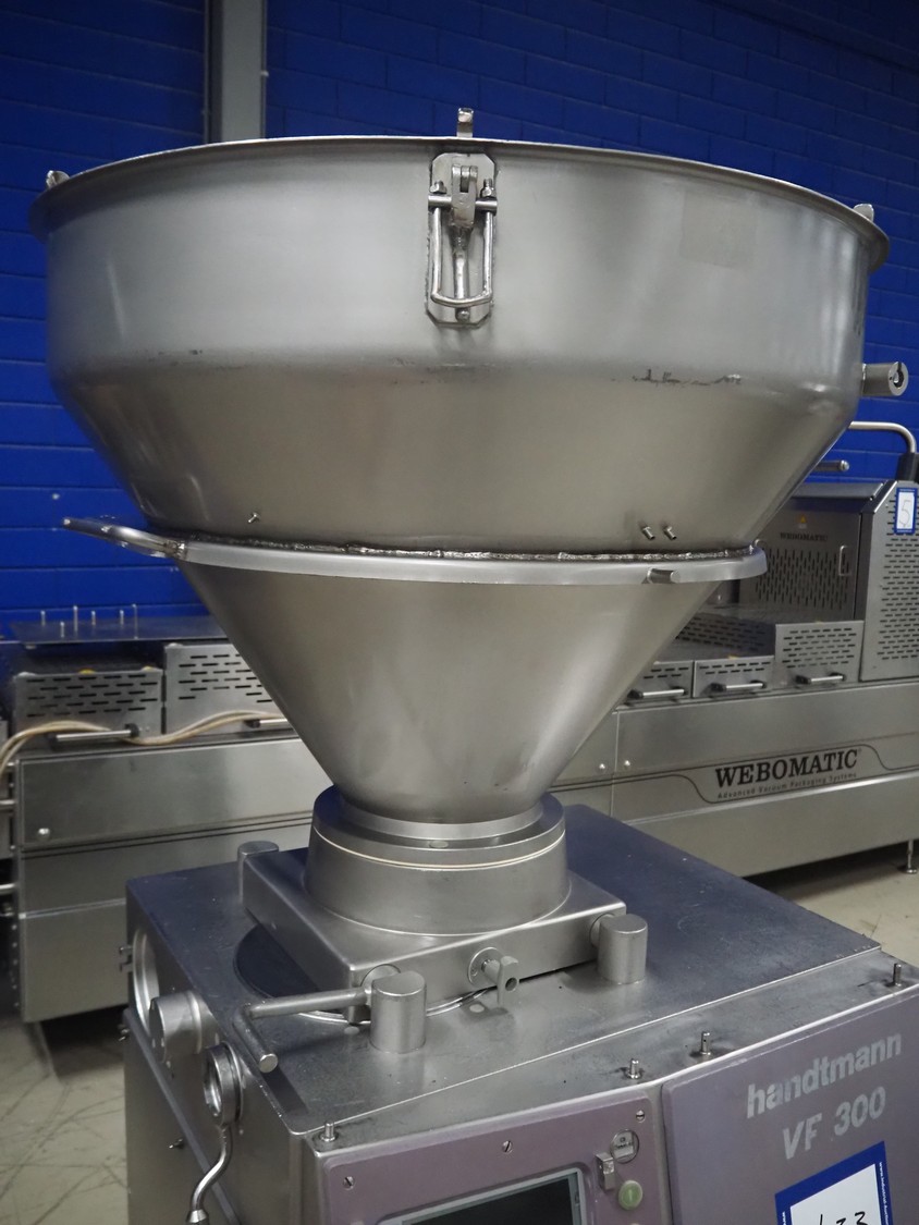 Handtmann vacuum filling machine, type: VF300, number: 15015, year of construction: 2001, 440 V, 3 Ph, 60 Hz, 21.8 A, 9 kW, dimensions: 950 mm x 920 mm x 2020 mm.