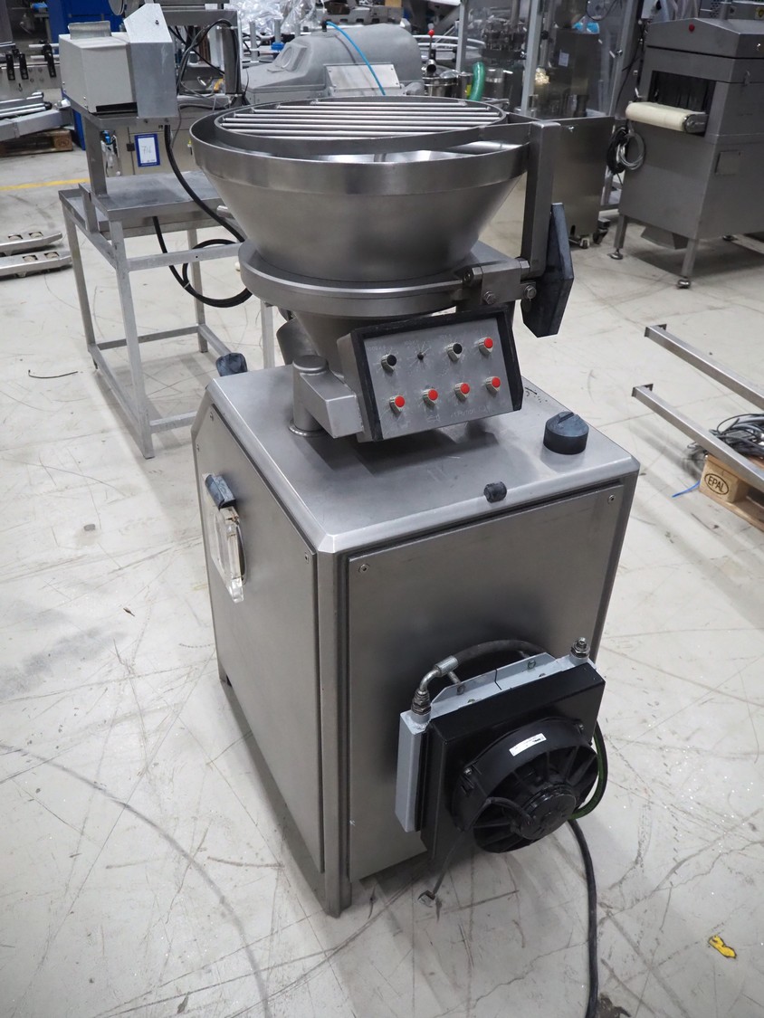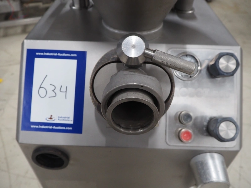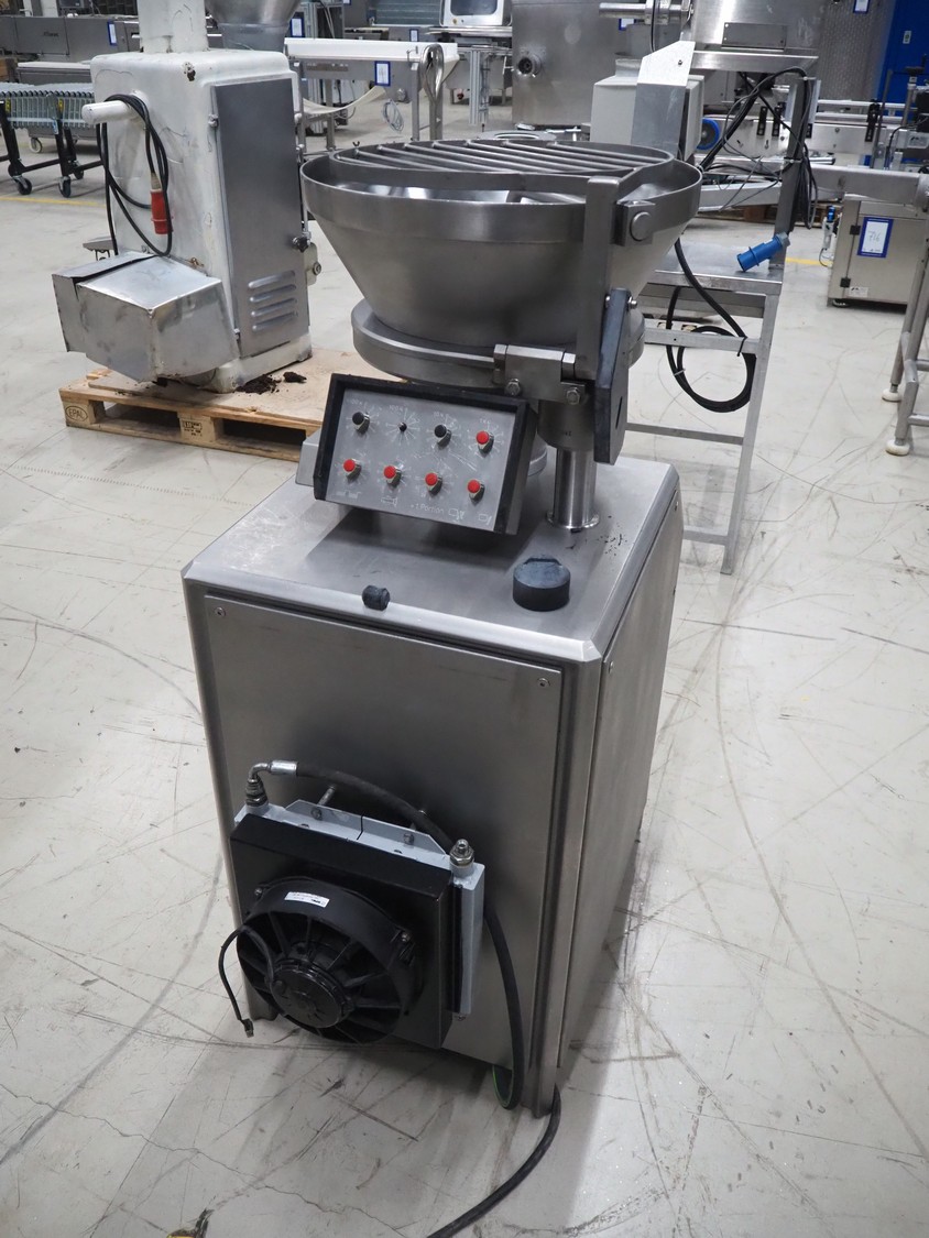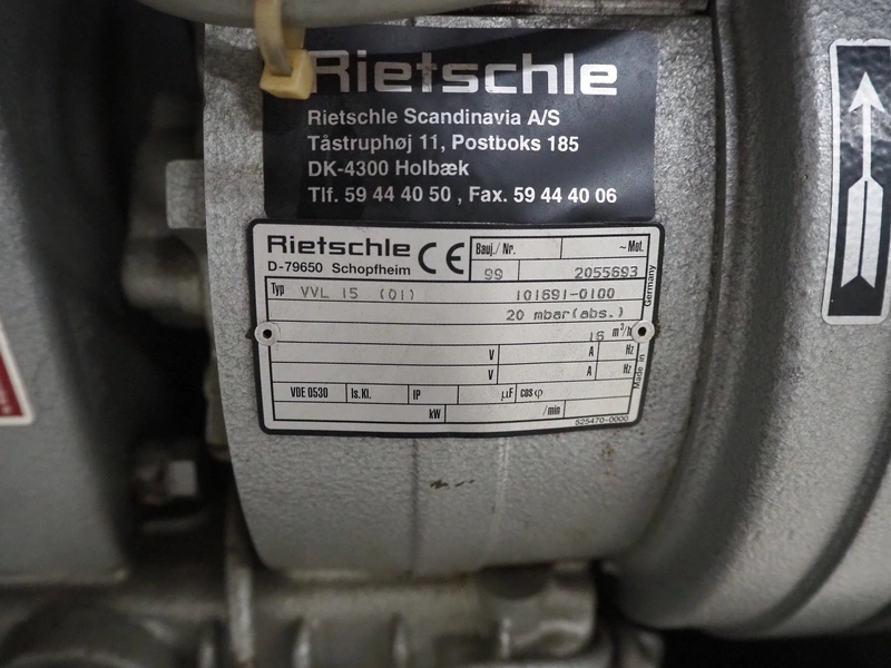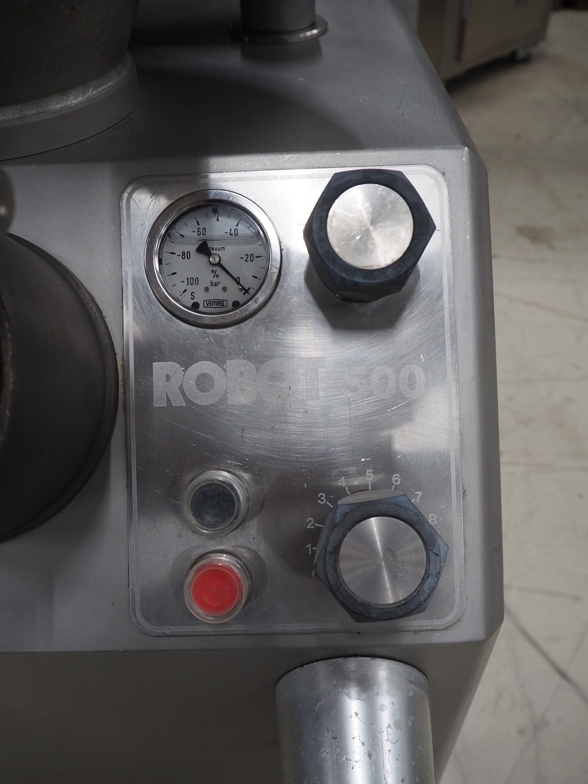 Vemag vacuum filling machine, model: Robot 500, type: 128/40, number: 128.1087-1, 380/280 V, 50 Hz, 25 A, Rietschle vacuum pump, type: VVL I5 (01), capacity: 15 m³ per hour, dimensions: 580 mm x 1020 mm x 1320 mm.