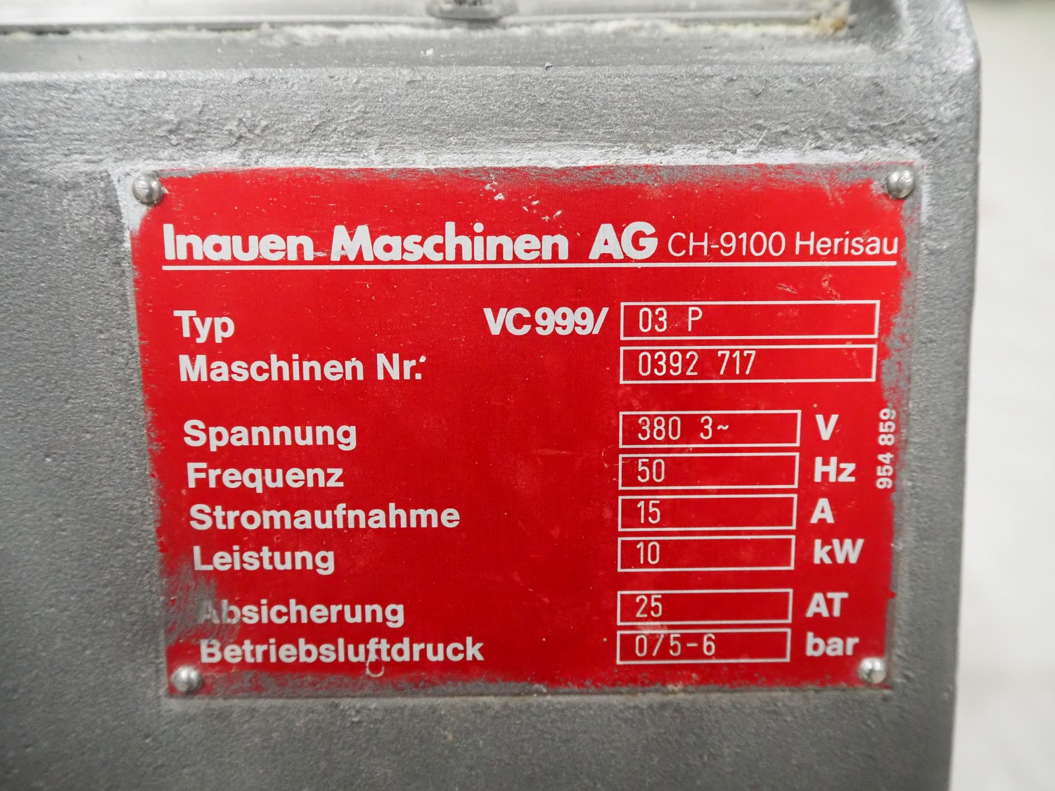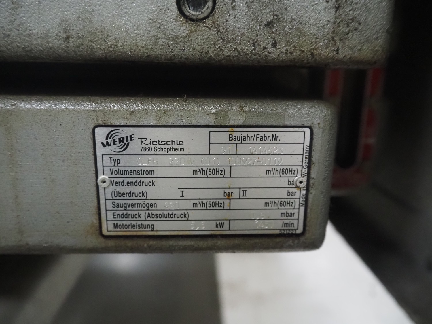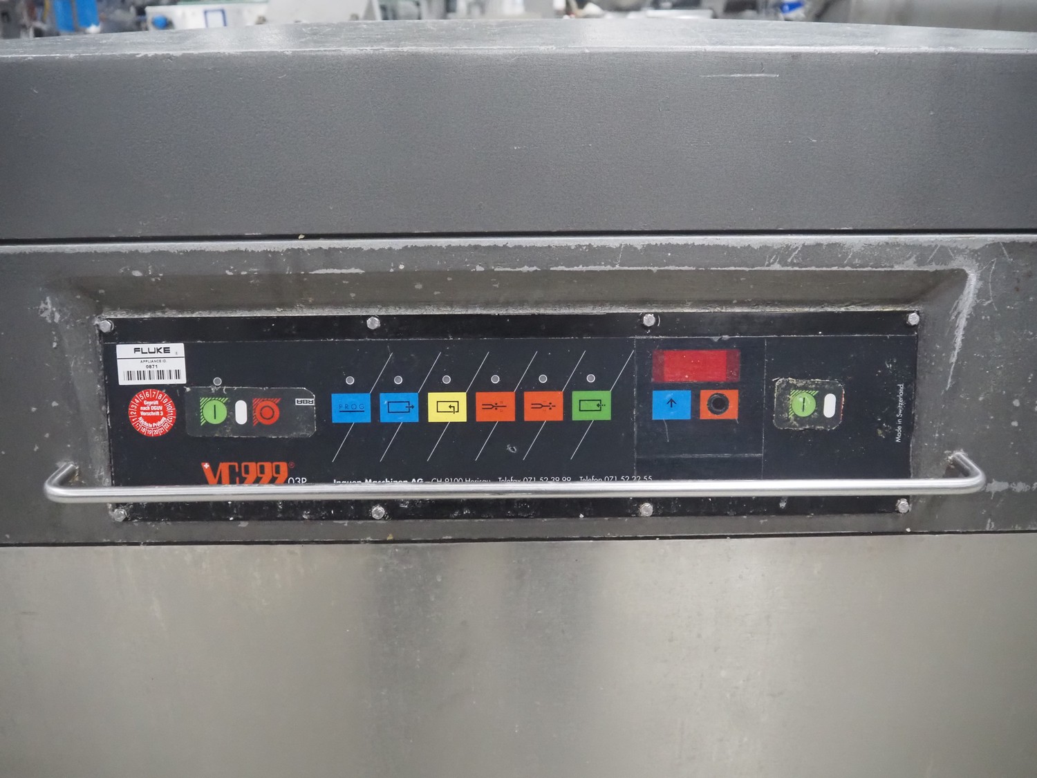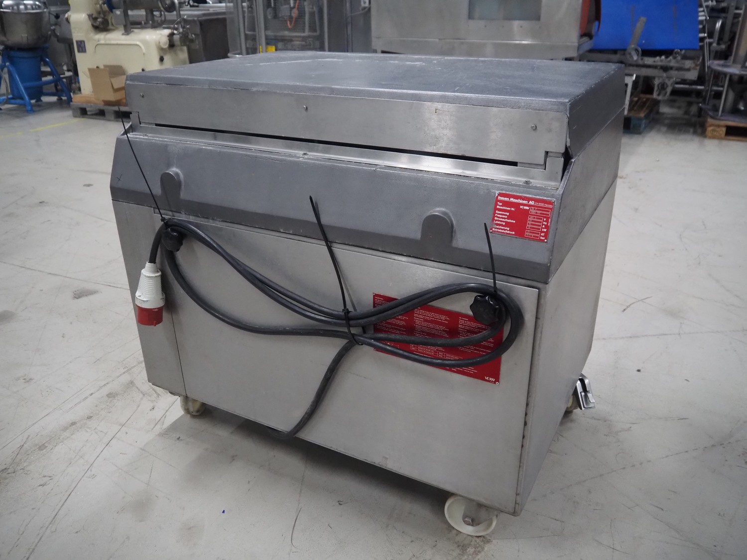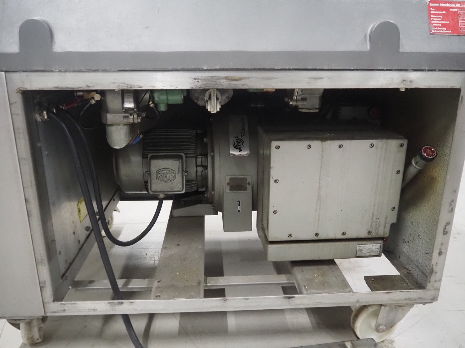 Inauen Maschinen AG mobile vacuum machine, type: VC999/03 P, machine number: 0392 717, 380 V, 3 Ph, 50 Hz, 15 A, 10 kW, seal width: (1x) 1000 mm and (2x) 450 mm, Rietschle vacuum pump, type: CLFH 220 V (01), fabrication number: 1414623, year of construction: 1991, capacity: 220 m³ per hour, total dimensions: 1130 mm x 750 mm x 1030 mm.