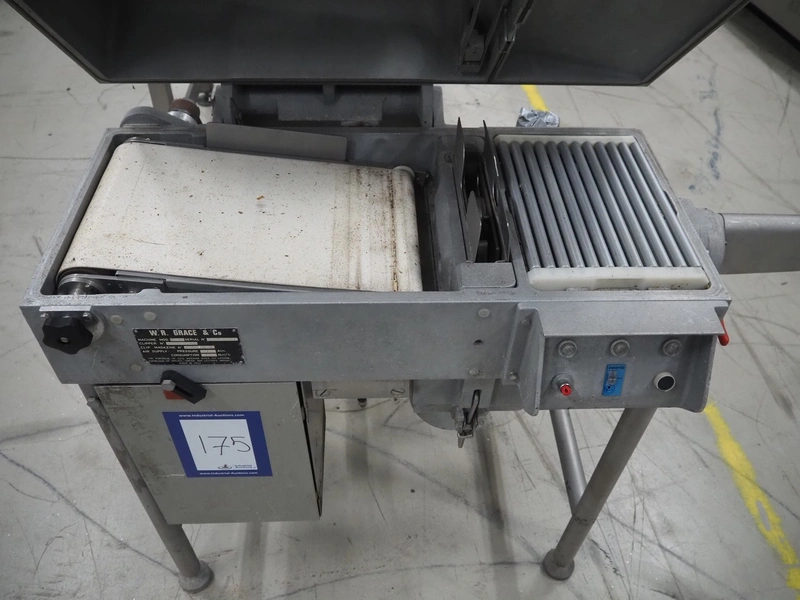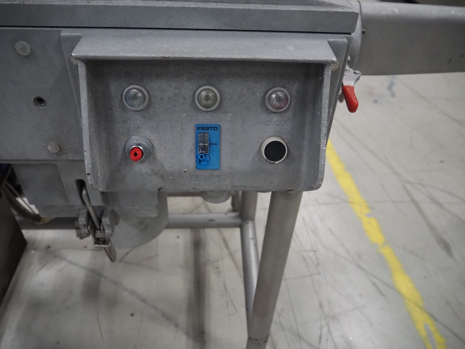 Cryovac / W.R. Grace & Co belt vacuum machine with clipper, model: VC10, number: AS 116 RH, s/s rollers, roller width: 300 mm, chamber: 530 mm x 370 mm, maximum belt width: 320 mm, total dimensions: 1750 mm x 800 mm x 1300 mm.