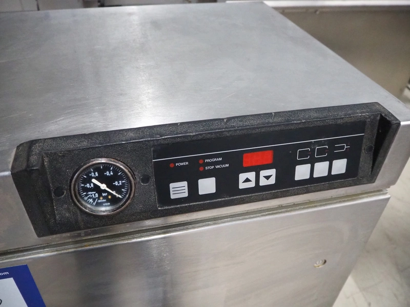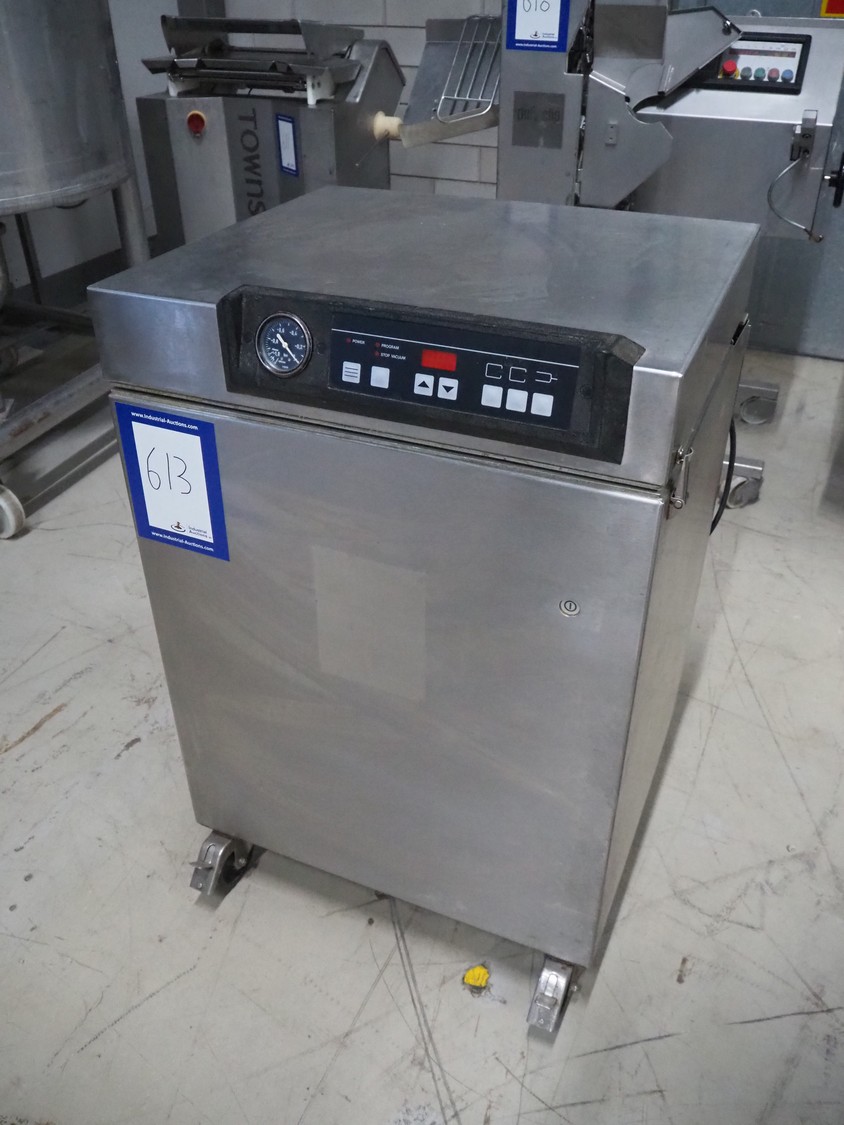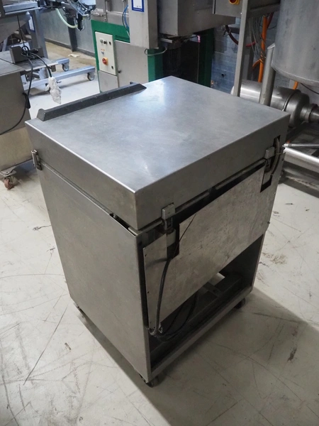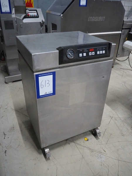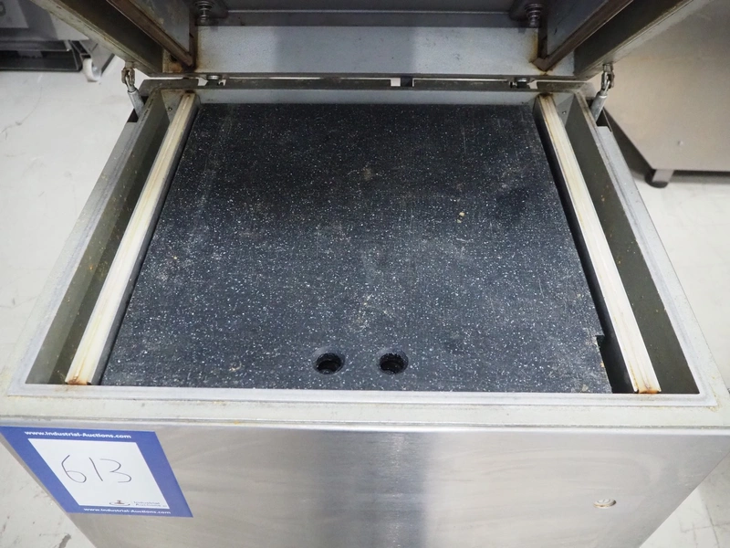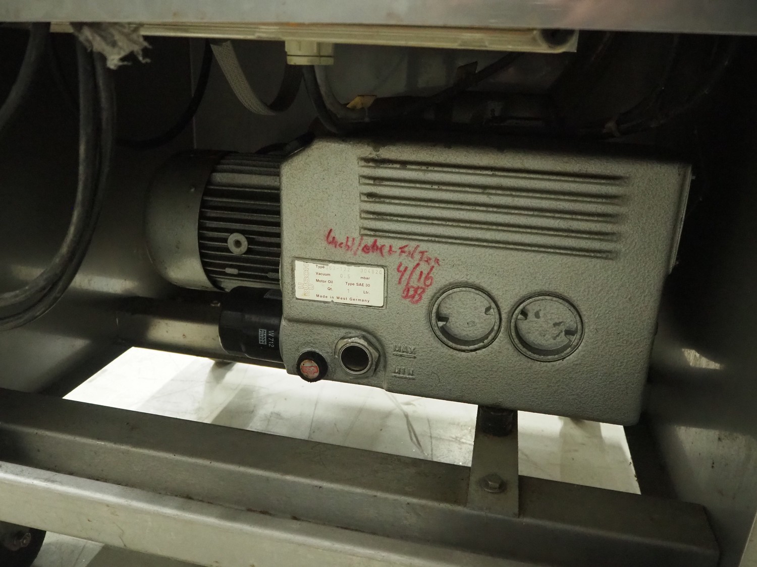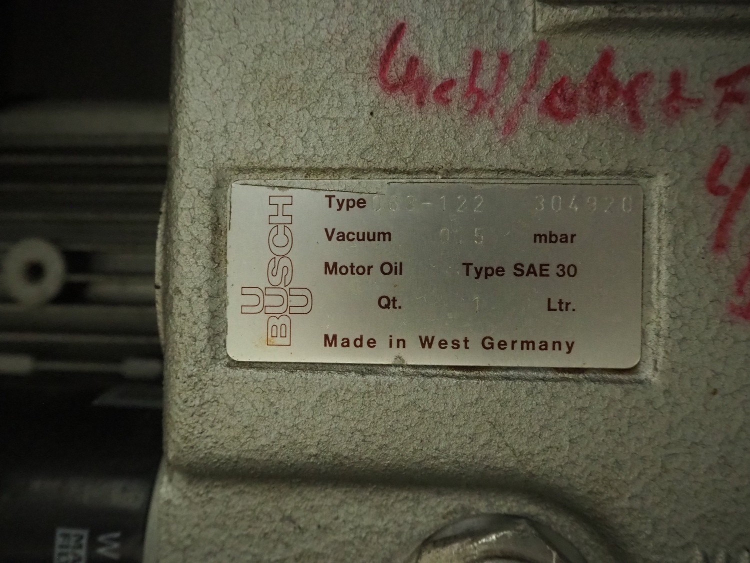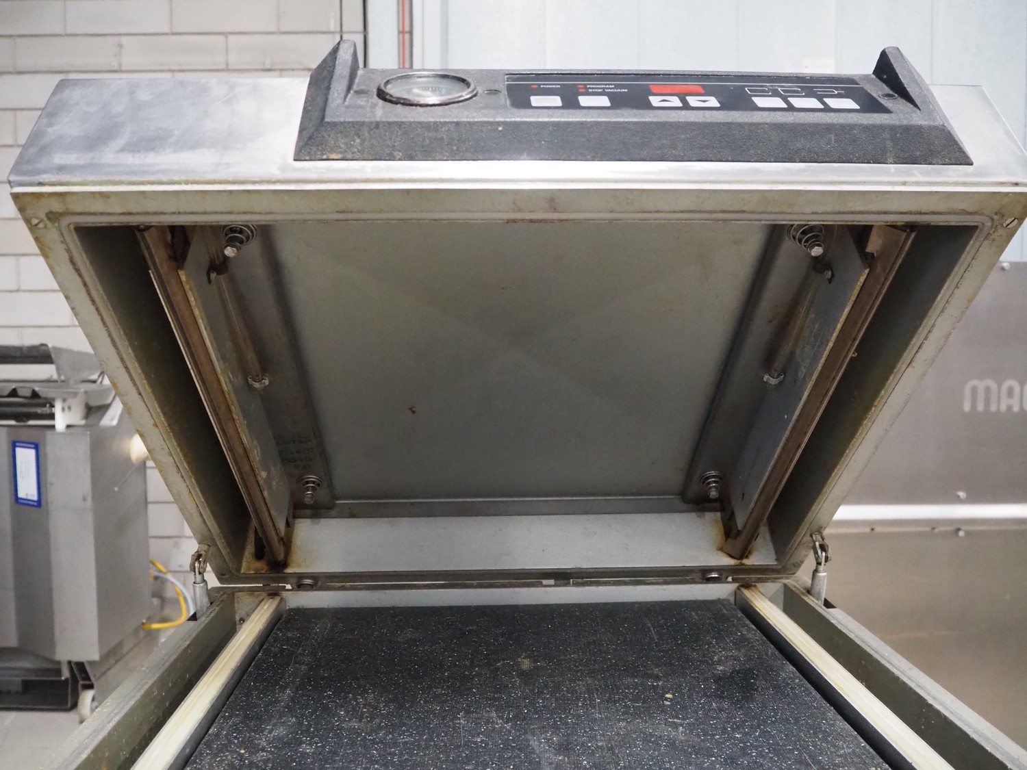 Henkovac mobile vacuum machine, type: H-2000, machine number: 208089165, 220/380 V, 3 Ph, 50 Hz, seal length: (2x) 505 mm, chamber dimensions: 510 mm x 610 mm, Busch vacuum pump, type: 063-122, capacity: 63 m³ per hour, total dimensions: 650 mm x 680 mm x 1080 mm.