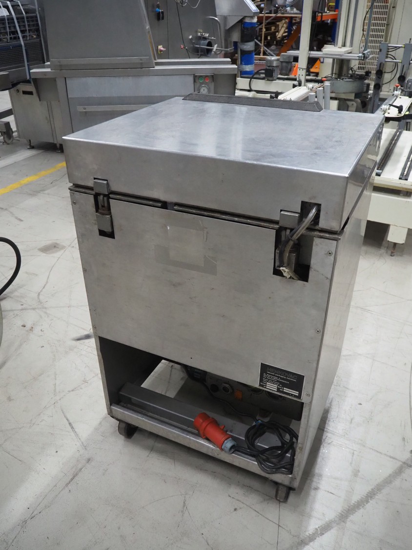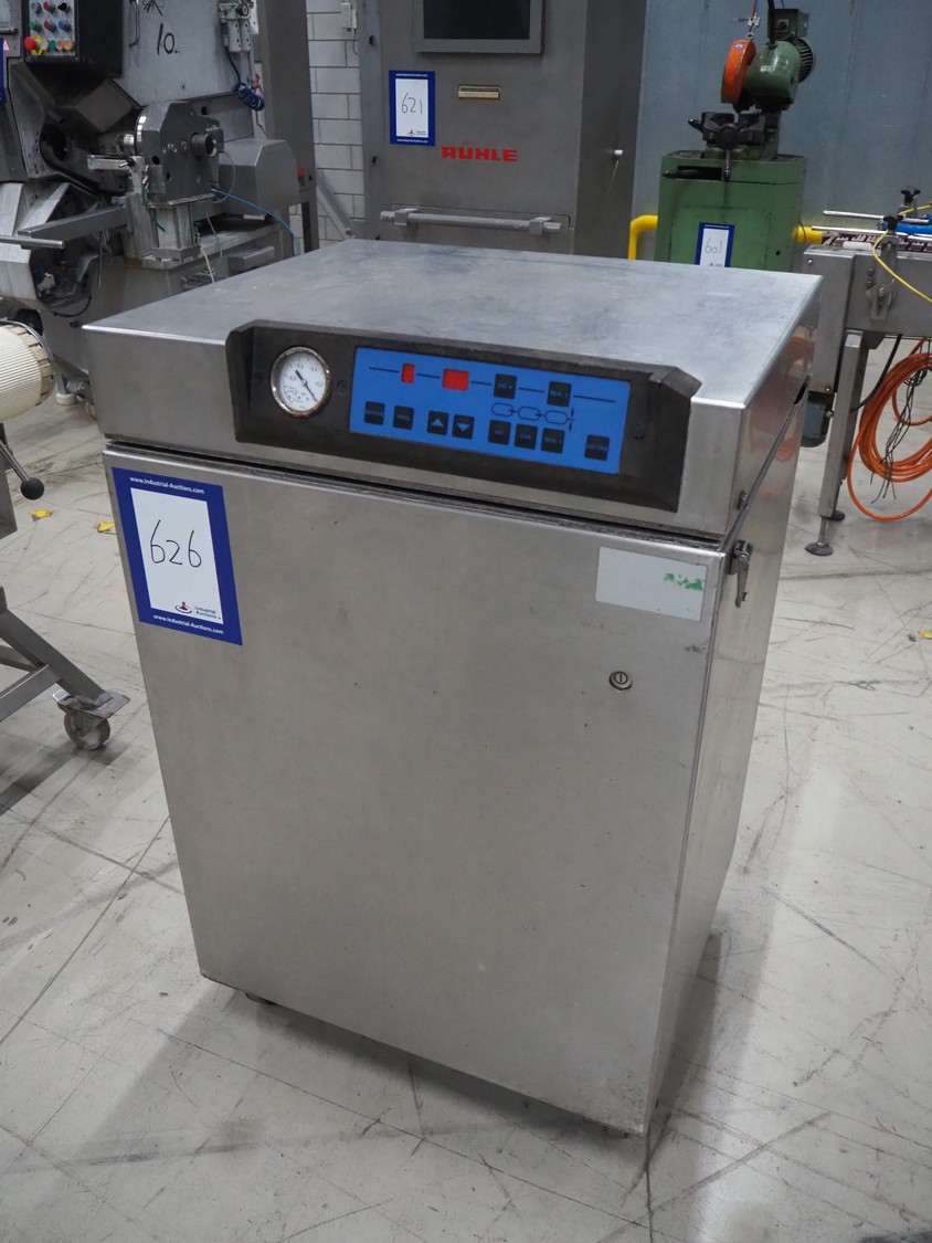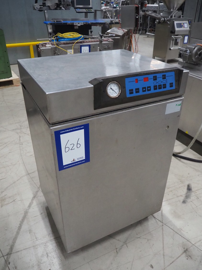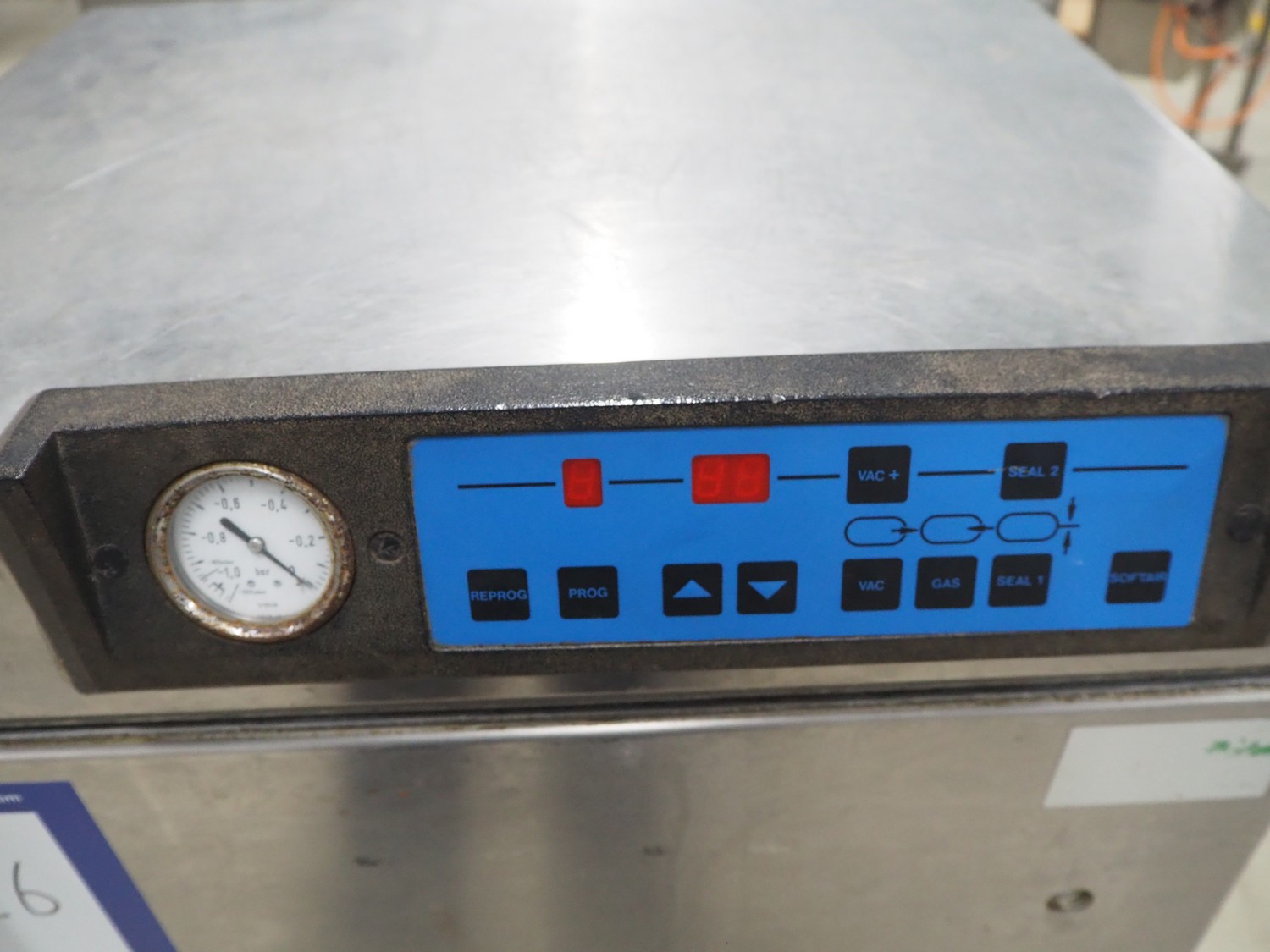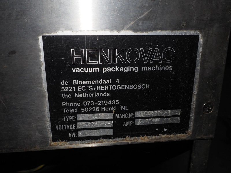 Henkovac mobile vacuum machine, type: H2000, machine number: 208077793, 220/380 V, 3 Ph, 50 Hz, 8.9/8.7 A, 2.5 kW, Busch vacuum pump, type: 063-122, number: 154573, capacity: 63 m³ per hour, seal length: (2x) 500 mm, dimensions chamber: 550 mm x 500 mm, total dimensions: 700 mm x 620 mm x 1100 mm.
