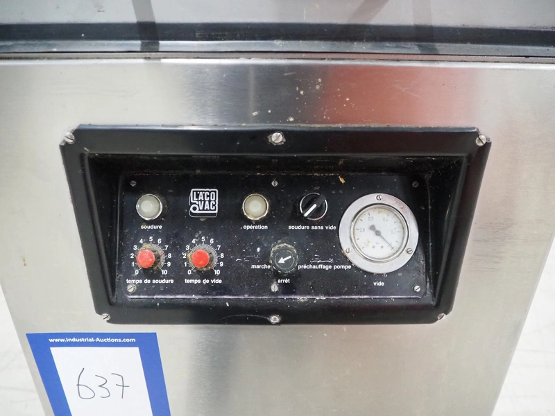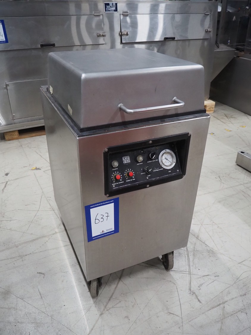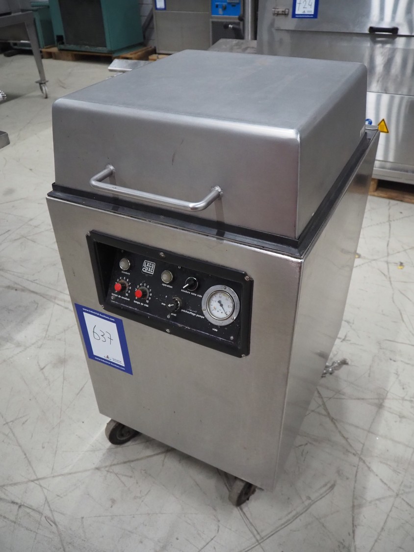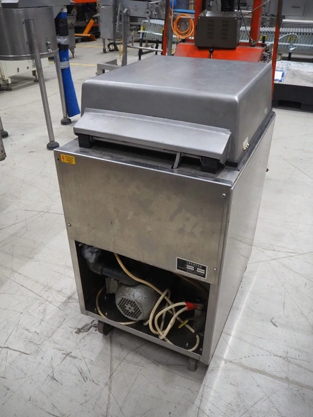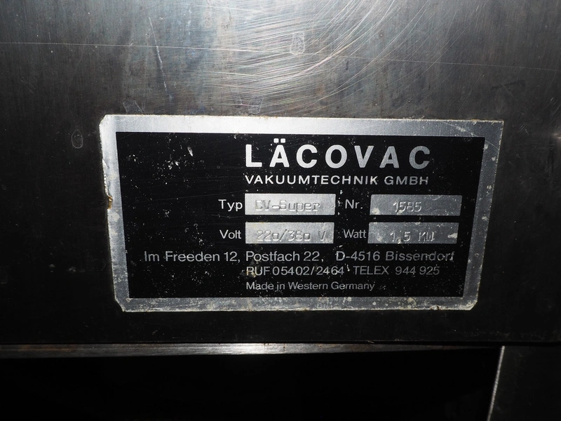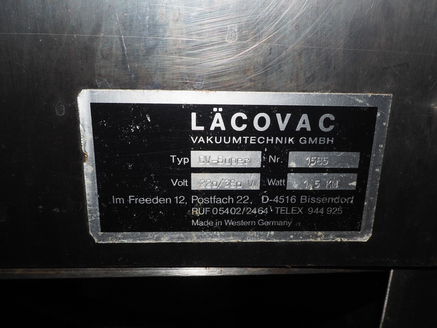 Läcovac mobile vacuum machine, type: CV-super, number: 1585, 220/380 V, 1.5 kW, Busch vacuum pump, seal length: 460 mm, dimensions chamber: 490 mm x 490 mm, total dimensions: 750 mm x 570 mm x 1100 mm.