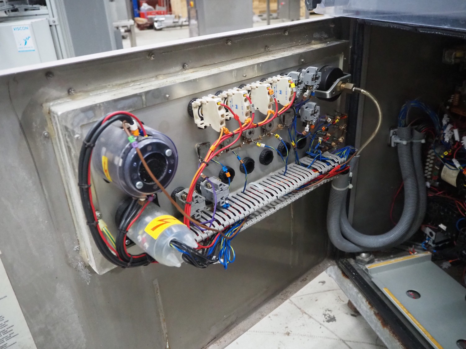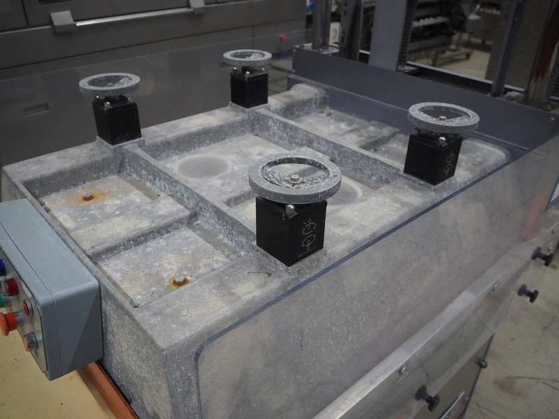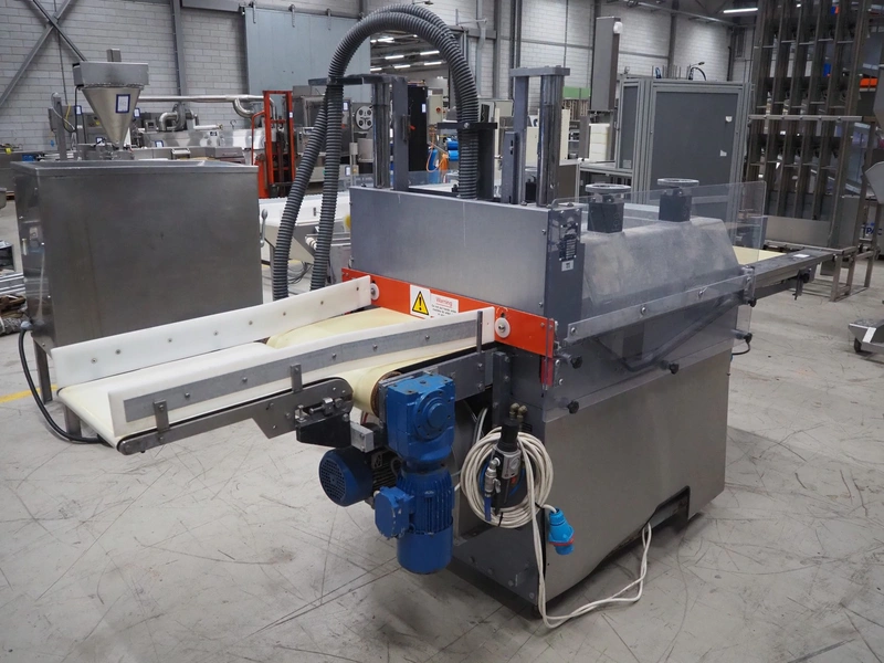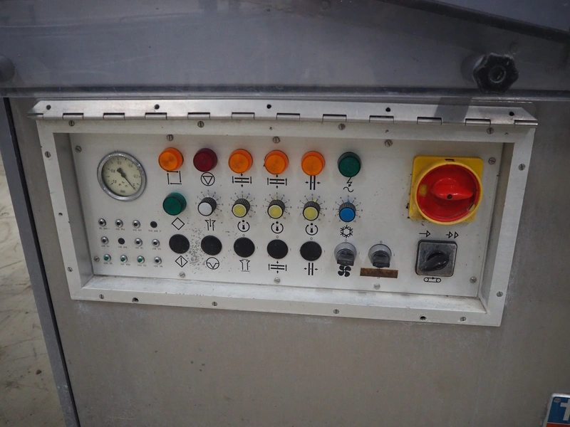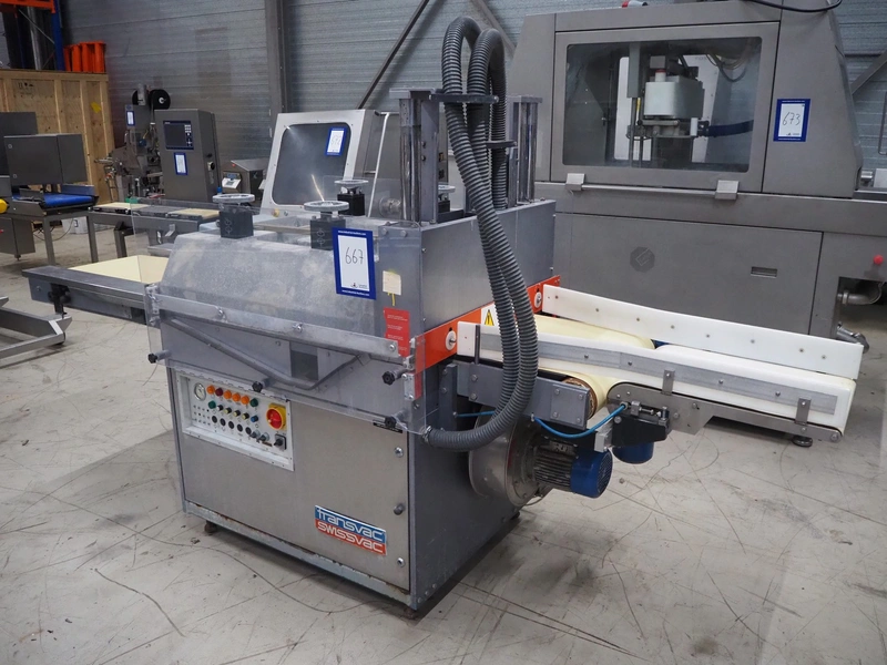 Transvac / Swissvac belt vacuum machine, type: SYSTEMATIC, serial number: 2991, year of construction: 1987, 3x 400 V, 50 Hz, plastic belts, belt width: 535 mm / 410 mm, total dimensions: 3350 mm x 1180 mm x 1950 mm.