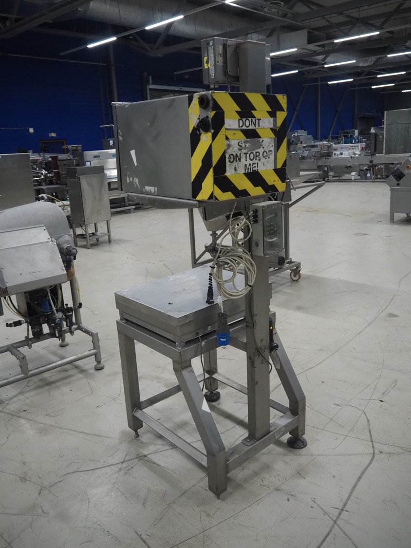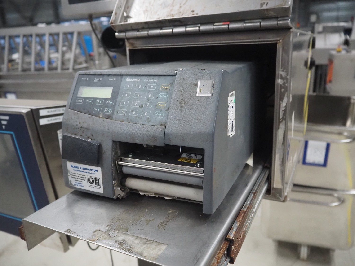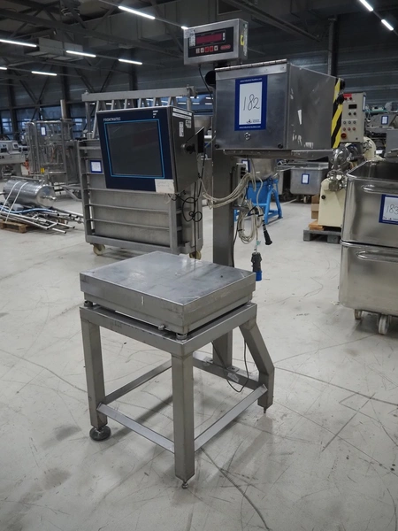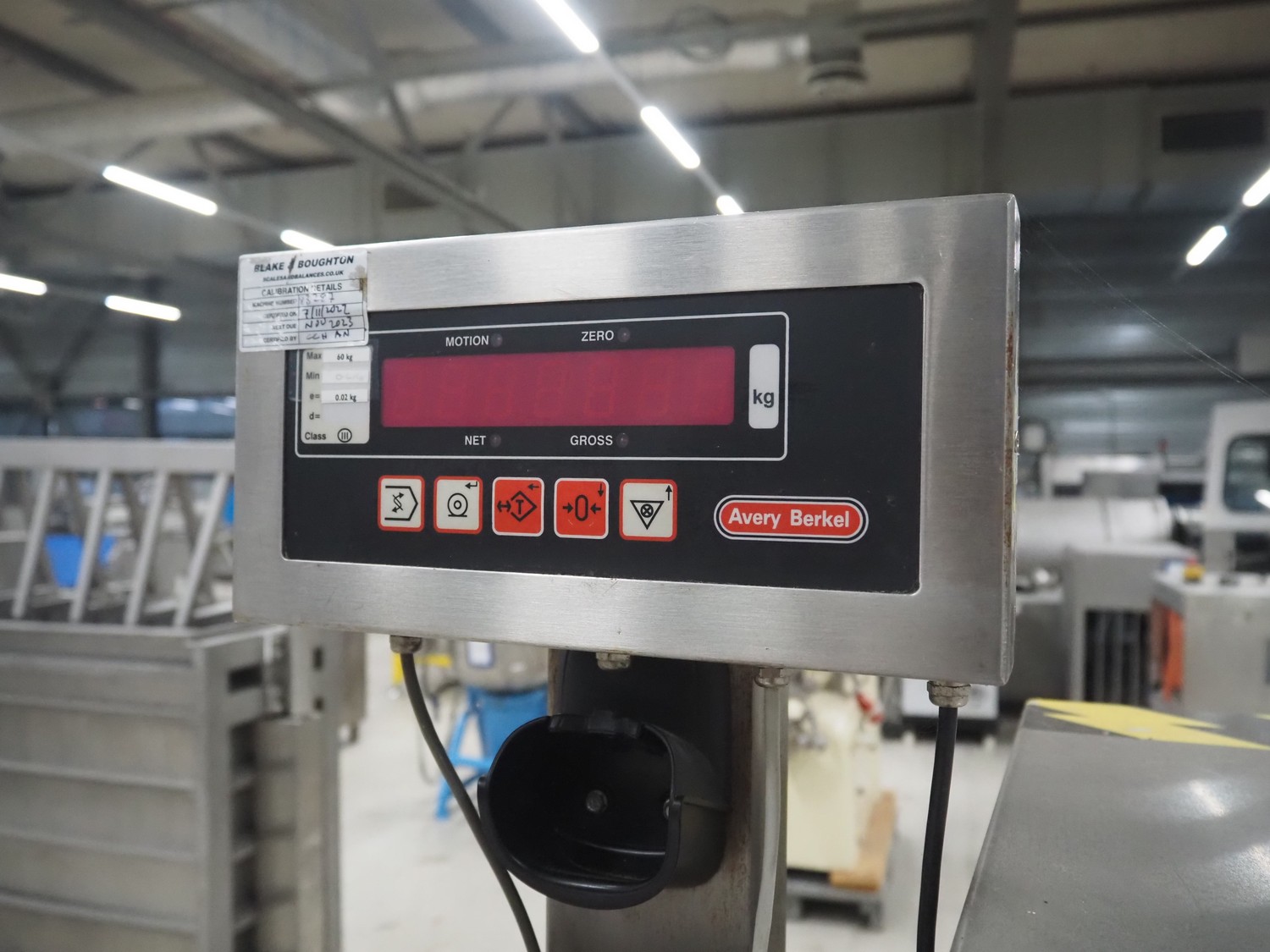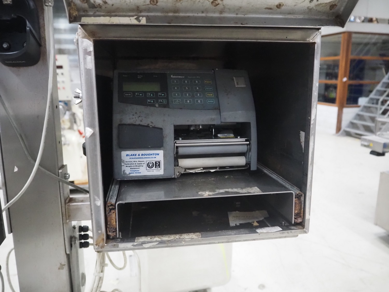 Blake & Boughton weighing station with labelling machine, machine number: 83287, min/max kg: 0.4/60 kg, e= 0.02 kg, scale dimensions: 600 mm x 500 mm, total dimensions: 950 mm x 700 mm x 1880 mm.