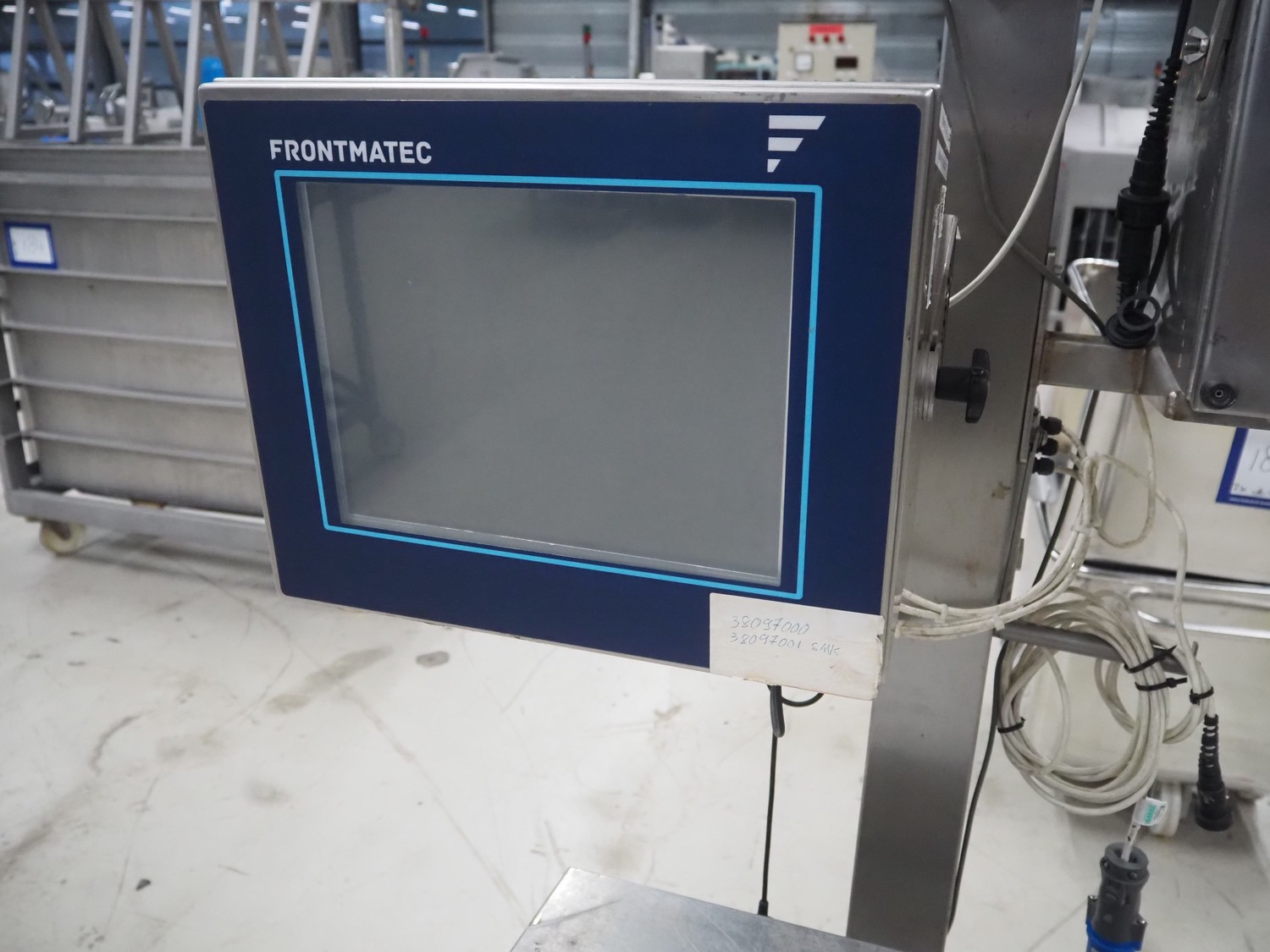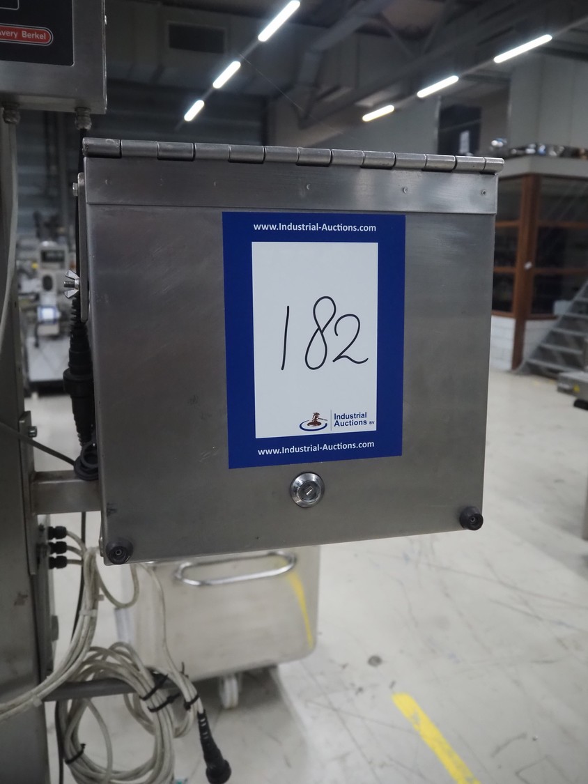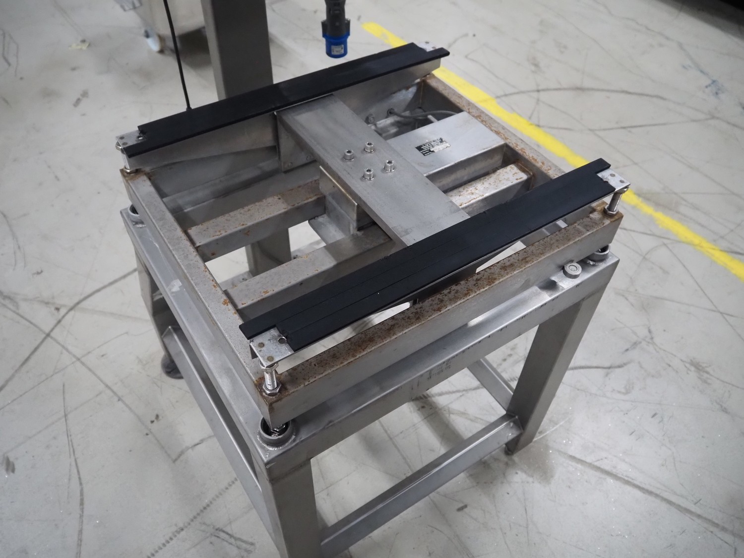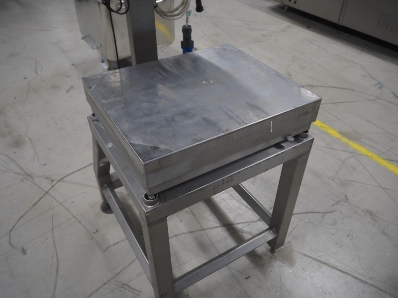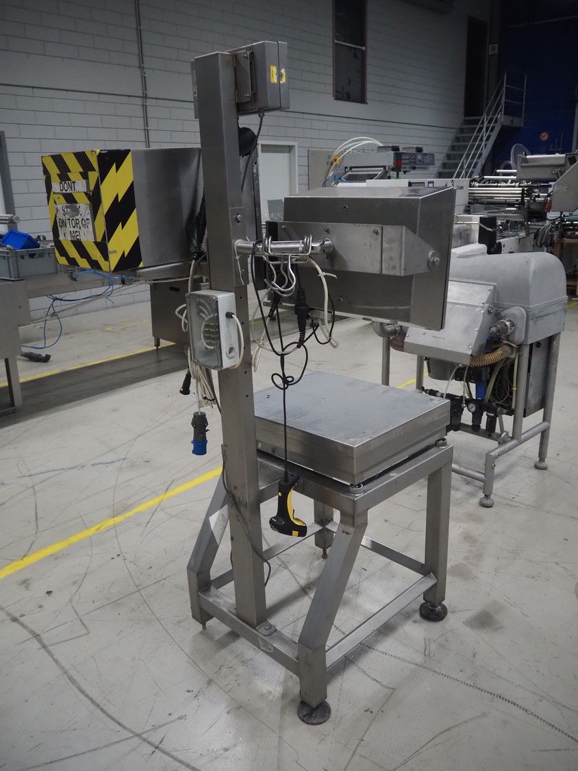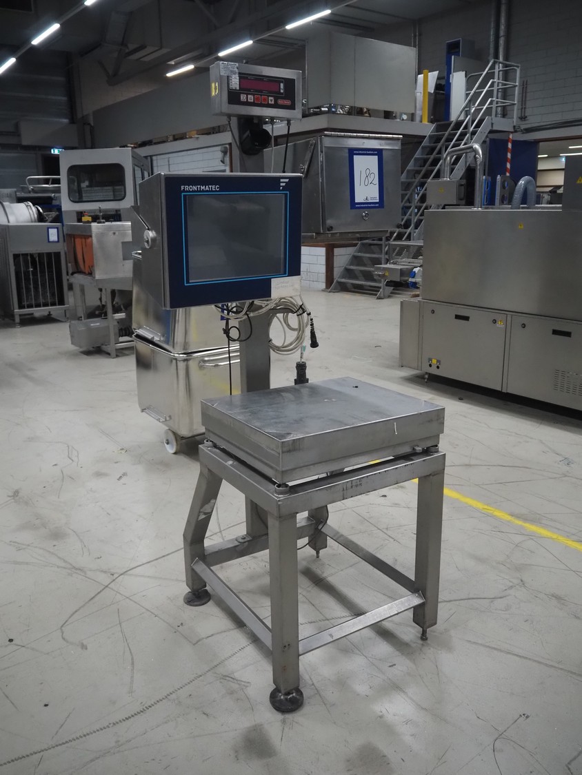 Blake & Boughton weighing station with labelling machine, machine number: 83287, min/max kg: 0.4/60 kg, e= 0.02 kg, scale dimensions: 600 mm x 500 mm, total dimensions: 950 mm x 700 mm x 1880 mm.