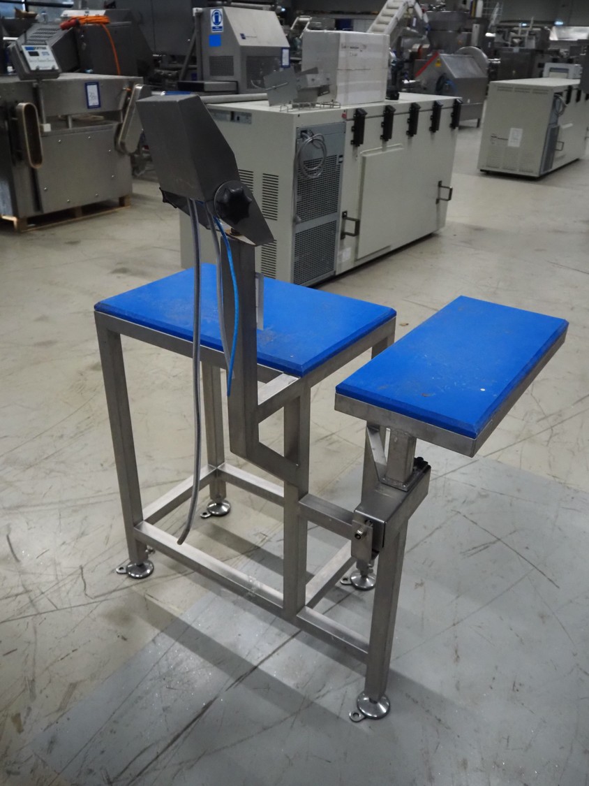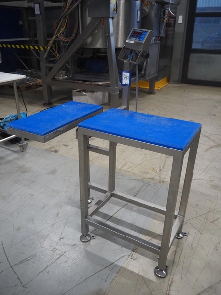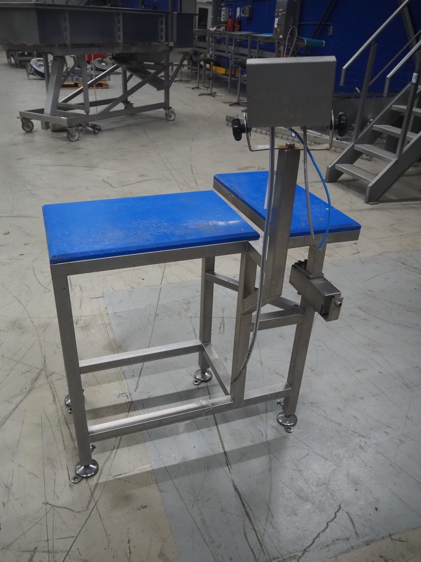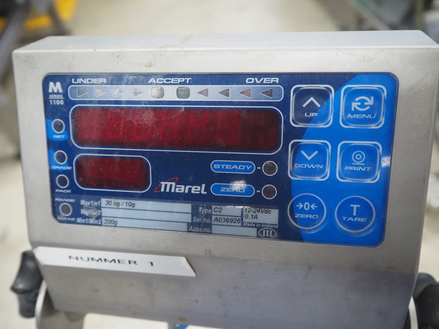 Marel table with weighing scale, type: C2, serial number: A036926, maximum weight: 30 kg, minimum weight: 200 gram, e=: 10 gram, dimensions scale: 600 mm x 275 mm, total dimensions: 960 mm x 850 mm x 1380 mm.