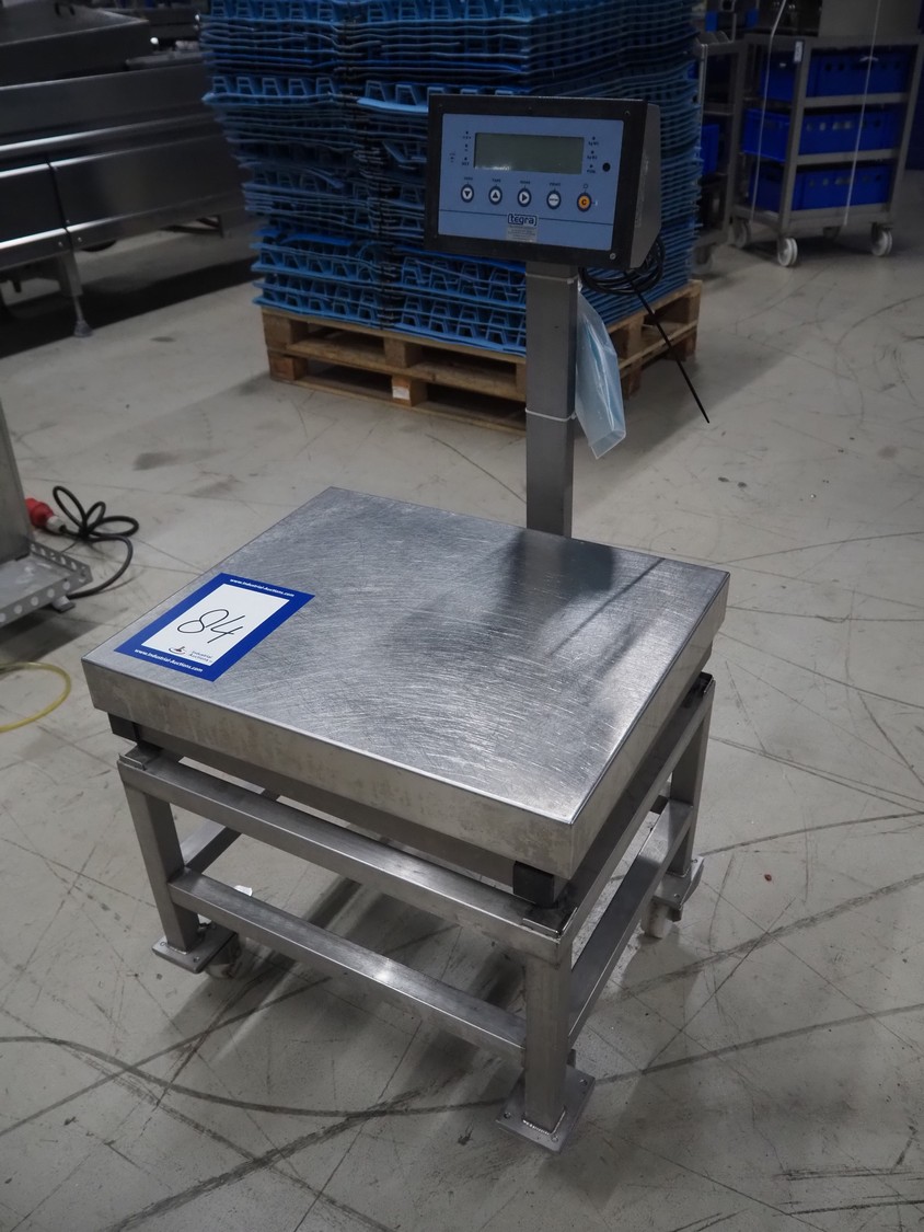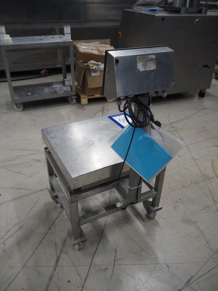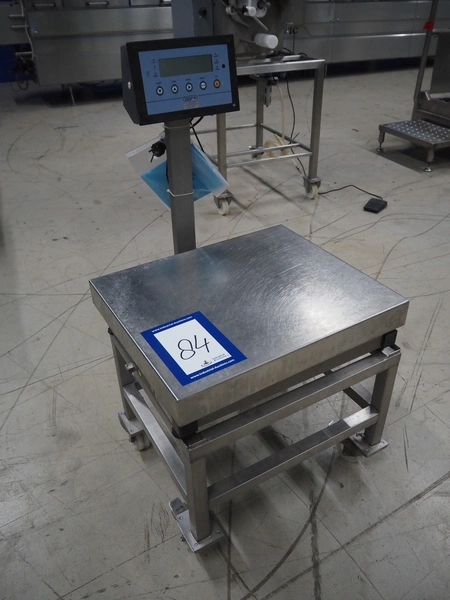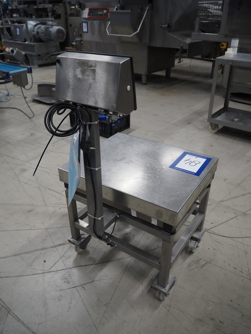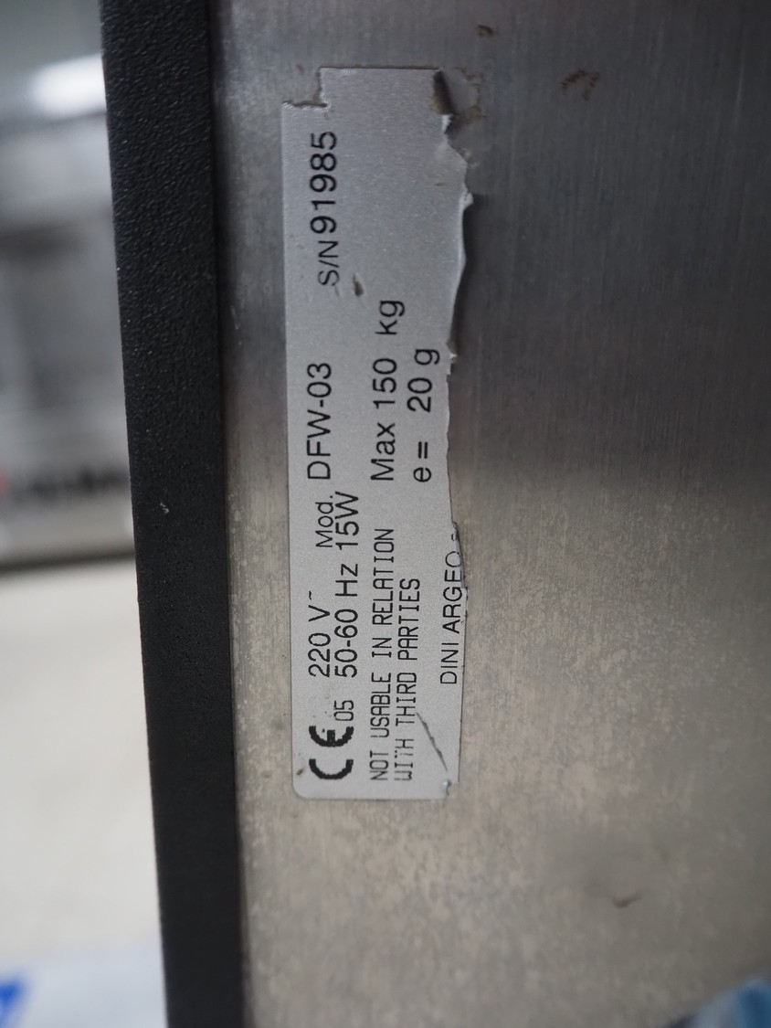 Dini Argeo weighing scale on s/s trolley, model: DFW-03, serial number: 91985, 220 V, 50-60 Hz, 15 W, maximum weight: 150 kg, e= 20 gram, dimensions scale: 500 mm x 600 mm, total dimensions: 600 mm x 600 mm x 1120 mm.