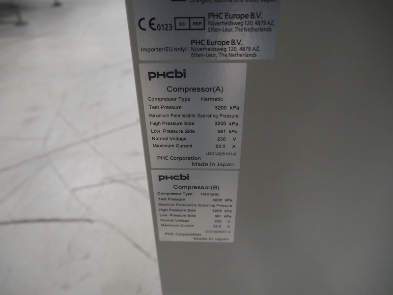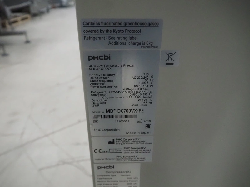 PHCBI ultra-low temperature freezer, model: MDF-DC700VX-PE, serial number: 19100039, year of construction: 2019, 230/240 V, 50 Hz, 4.8/5.0 A, 1070/1130 W, refrigerant: HFC-245fa/R-600/HFC-23/PFC-14, 0.550 kg, volume: 715 liter, dimensions: 2300 mm x 960 mm x 1070 mm.
