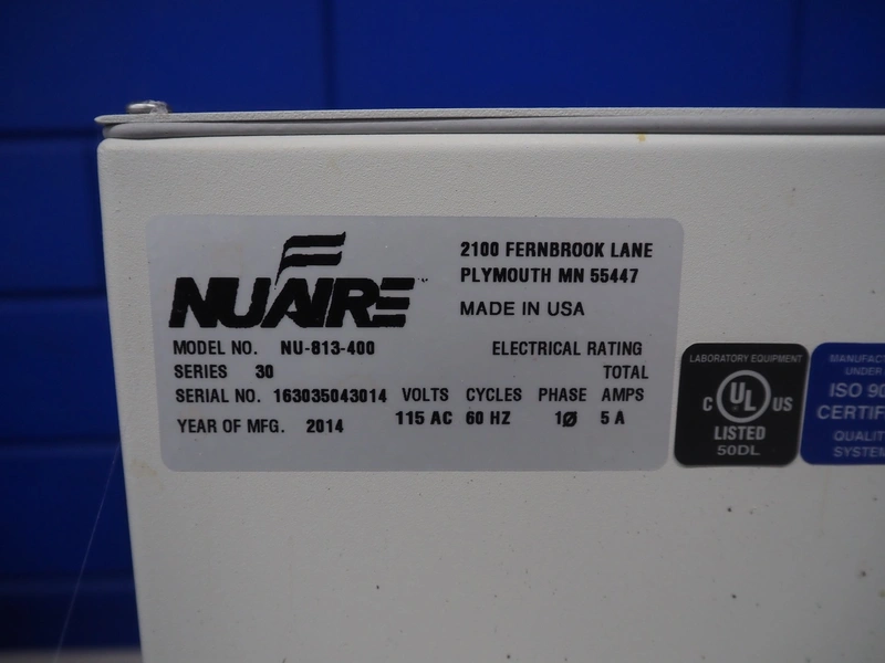 Nuaire containment ventilated enclosure, model: NU-813-400, serial number: 163035043014, year of construction: 2014, 115 VAC, 1 Ph, 60 Hz, 5 A, dimensions: 1200 mm x 700 mm x 1360 mm.