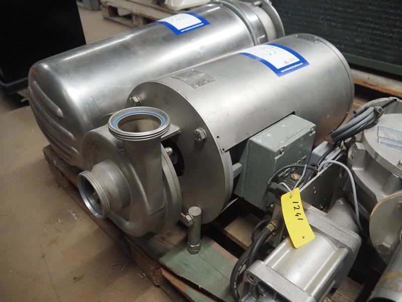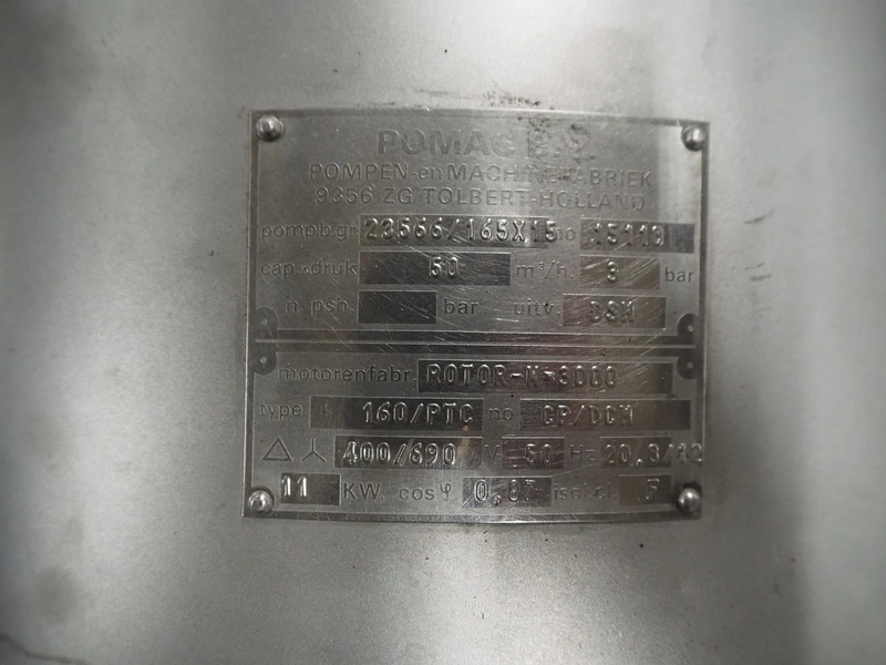 Pomac B.V. centrifugal pump, type: 23566/165X15, number: 15119, 400/690 V, 50 Hz, capacity: 50 m³ per hour, dimensions: 800 mm x 380 mm x 440 mm.
