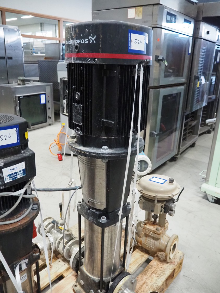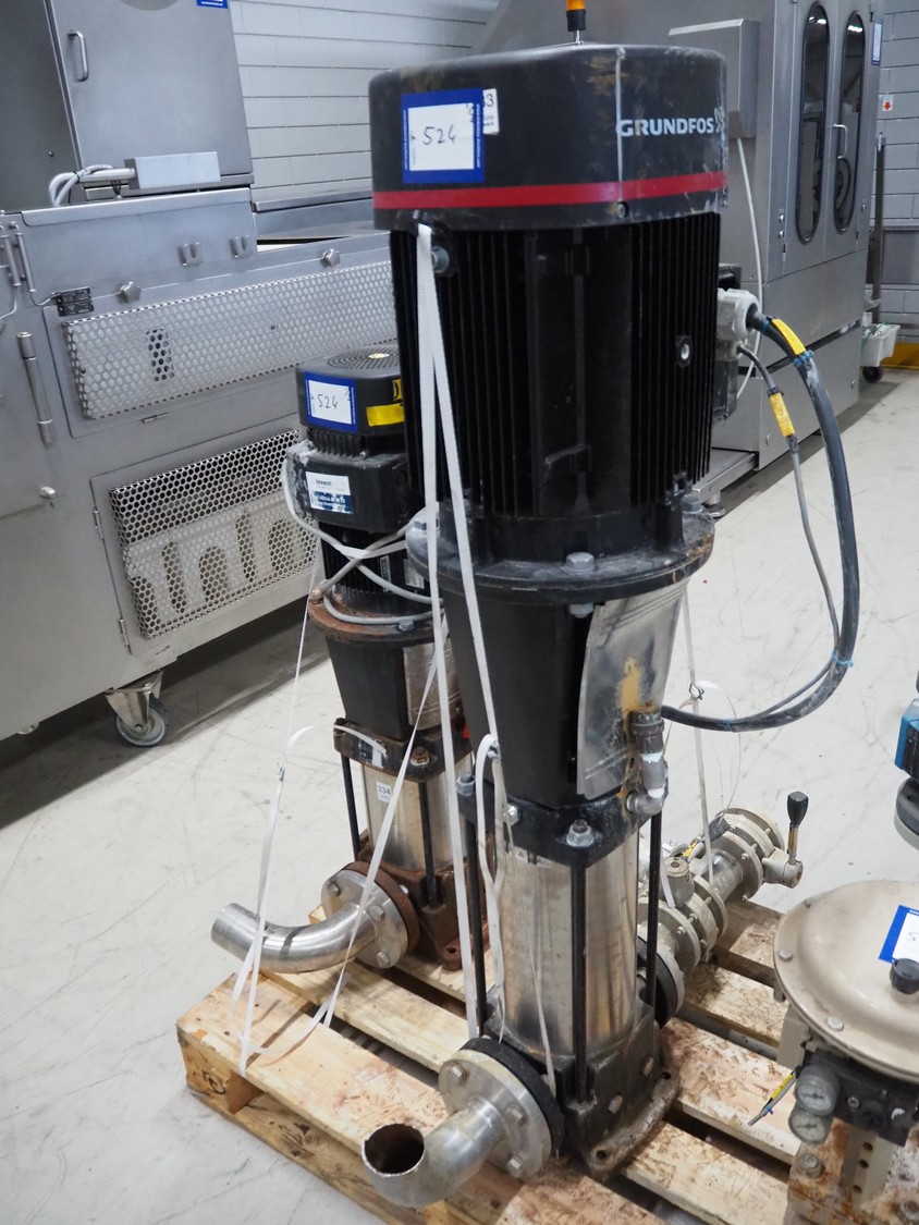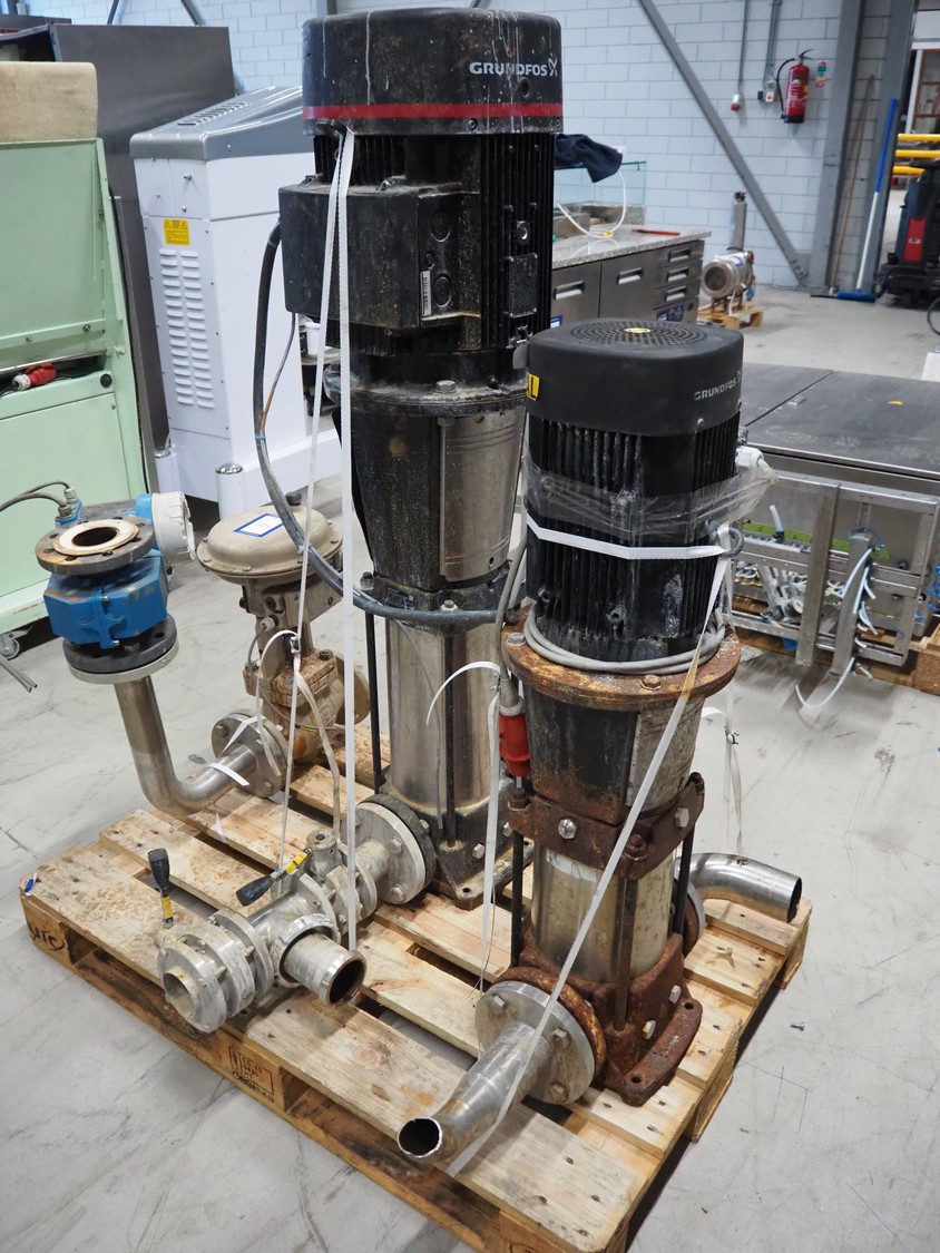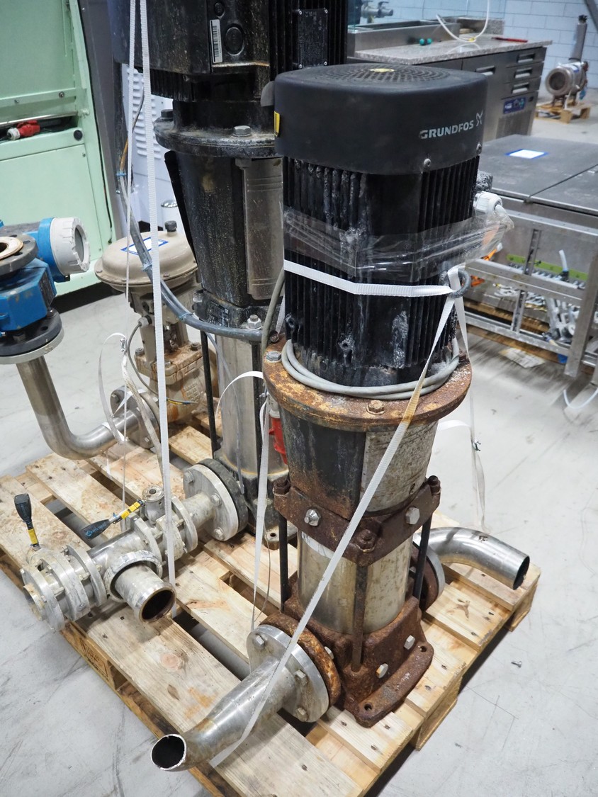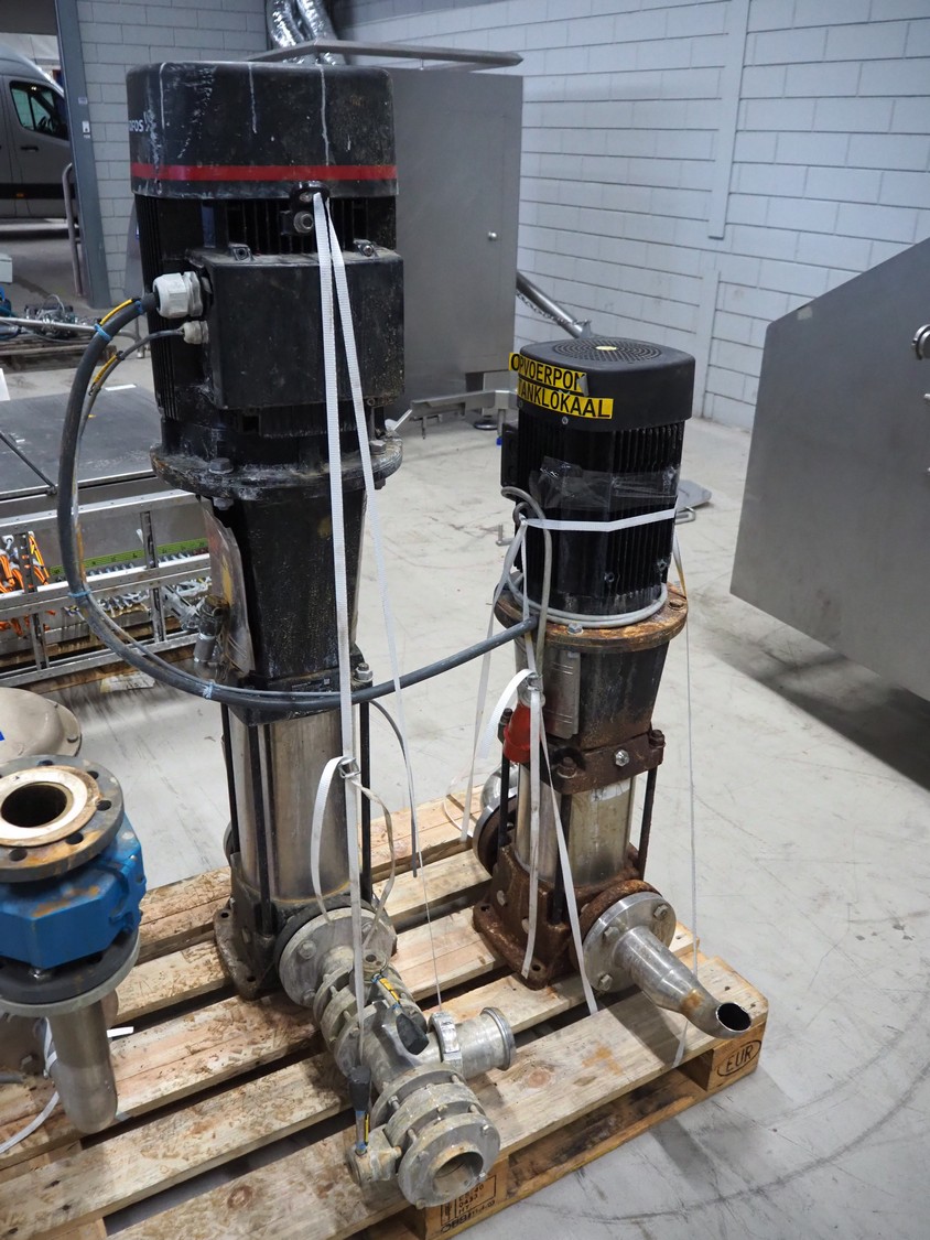 2 Grundfos vertical centrifugal pumps, type: CR32-5 A-F-A-E-HQQE and CR32-3 A-F-A-HQQE, capacity: (2x) 30 m³ per hour, dimensions: 90 mm x 500 mm x 1200 mm & 90 mm x 500 mm x 1650 mm