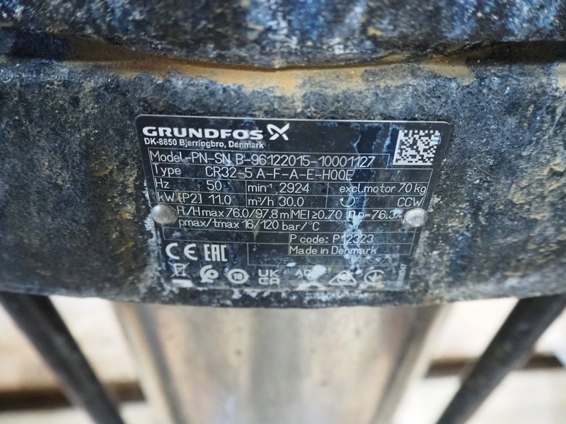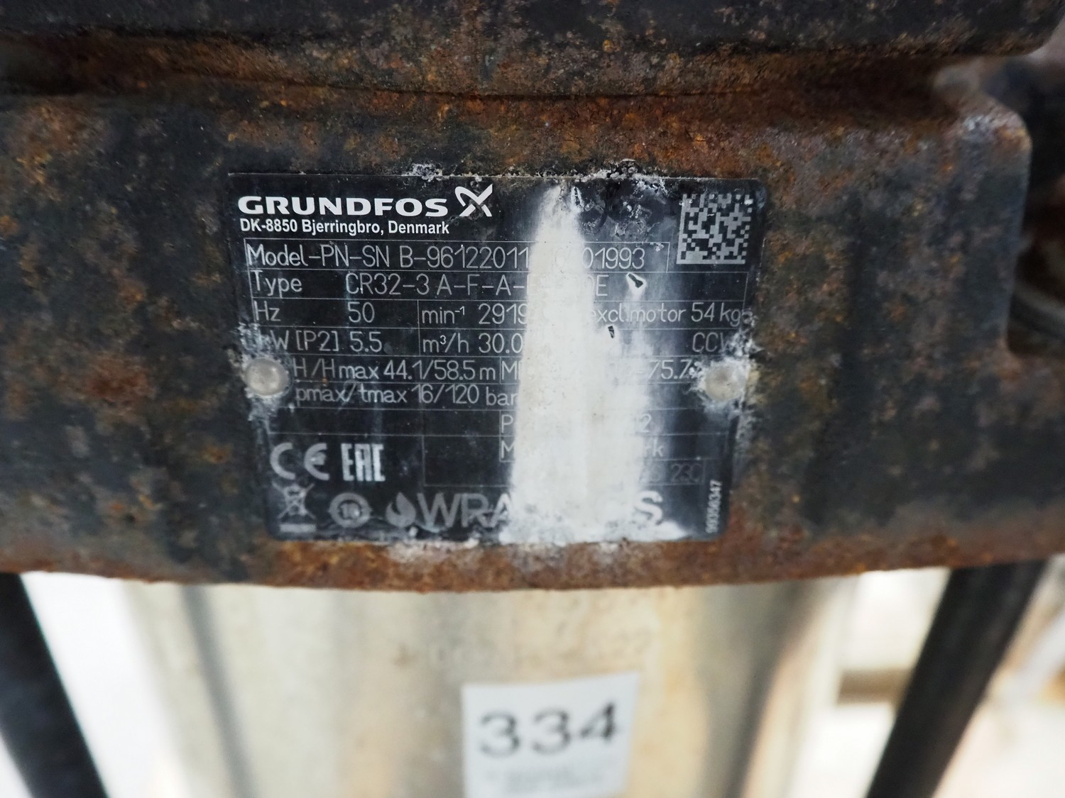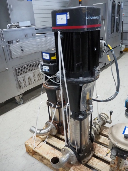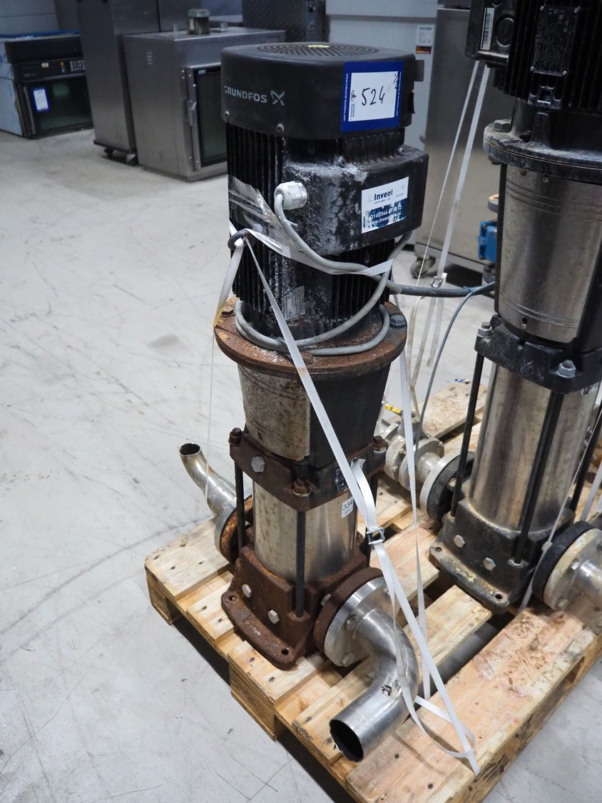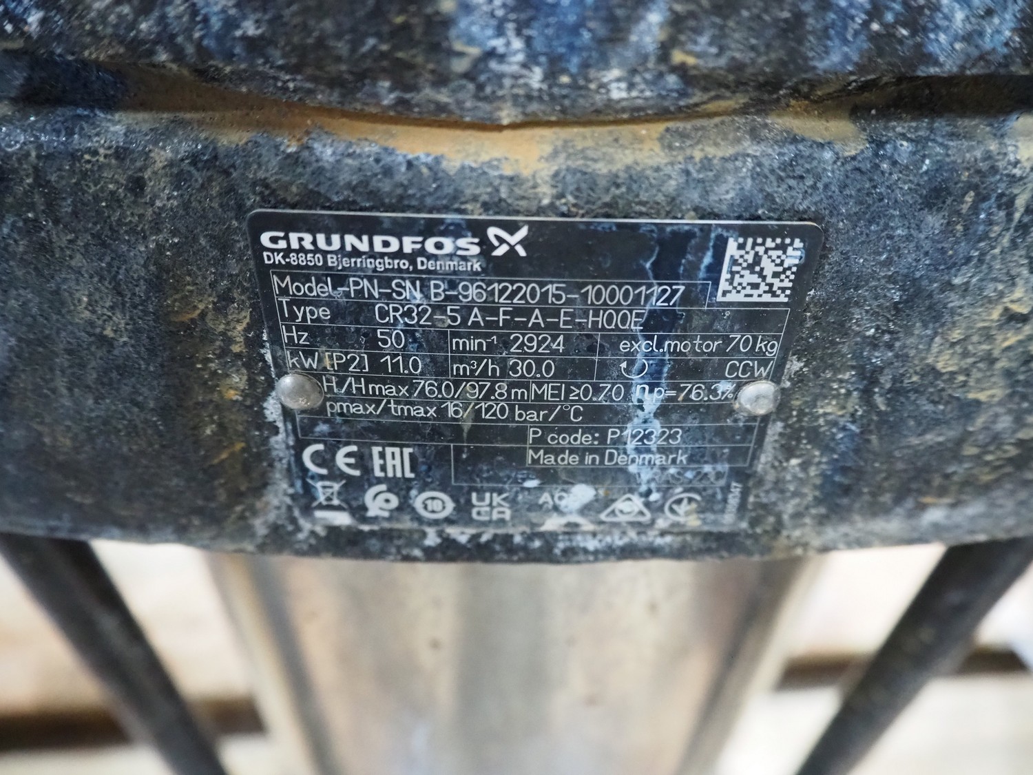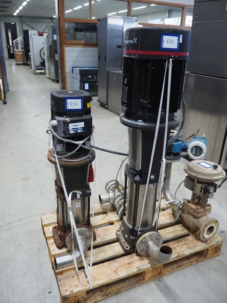 2 Grundfos vertical centrifugal pumps, type: CR32-5 A-F-A-E-HQQE and CR32-3 A-F-A-HQQE, capacity: (2x) 30 m³ per hour, dimensions: 90 mm x 500 mm x 1200 mm & 90 mm x 500 mm x 1650 mm