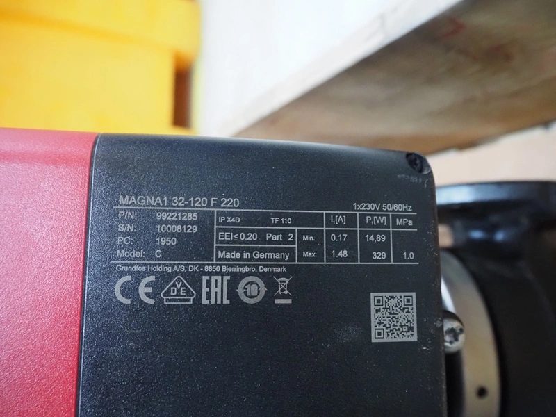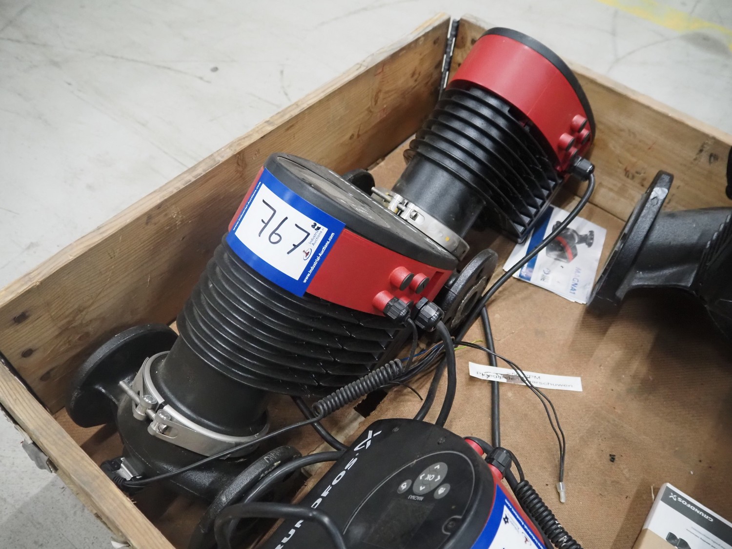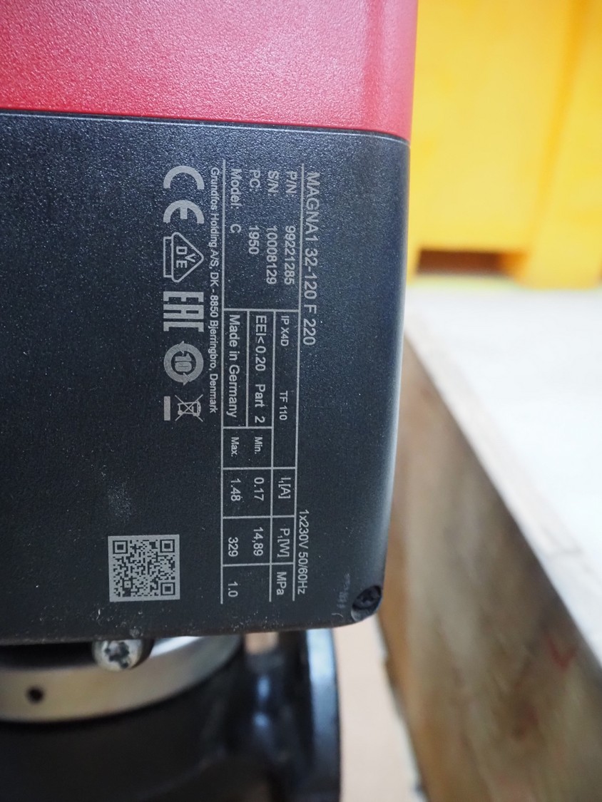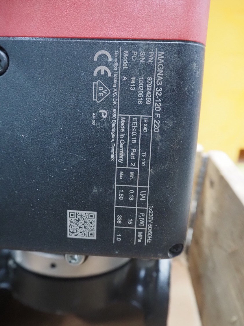 2 Grundfos warm water circulation pump, model: Magna3 32-120 F 220, serial number: 10020516 and 10008129, 230 V, 1 Ph, 50/60 Hz, dimensions: (2x) 375 mm x 230 mm x 230 mm.
