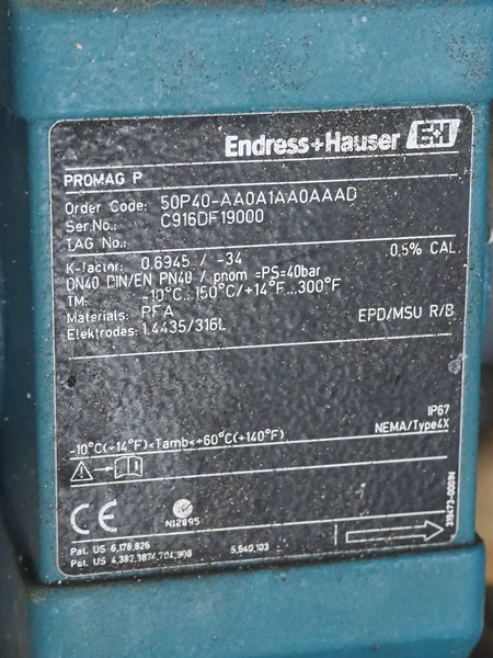 Endress+Hauser flowmeter, type: PROMAG P, serial number: C916DF19000, 40 bar, DN40 DIN / EN PN40, dimensions: 450 mmx 350 mm x 220 mm.