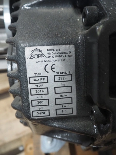 BORA s.r.l. vacuum booster, type: 363 FP, serial number: 2829, year of construction: 2014, 1.5 kW, capacity: 360 m³ per hour, dimensions: 870 mm x 330 mm x 460 mm.