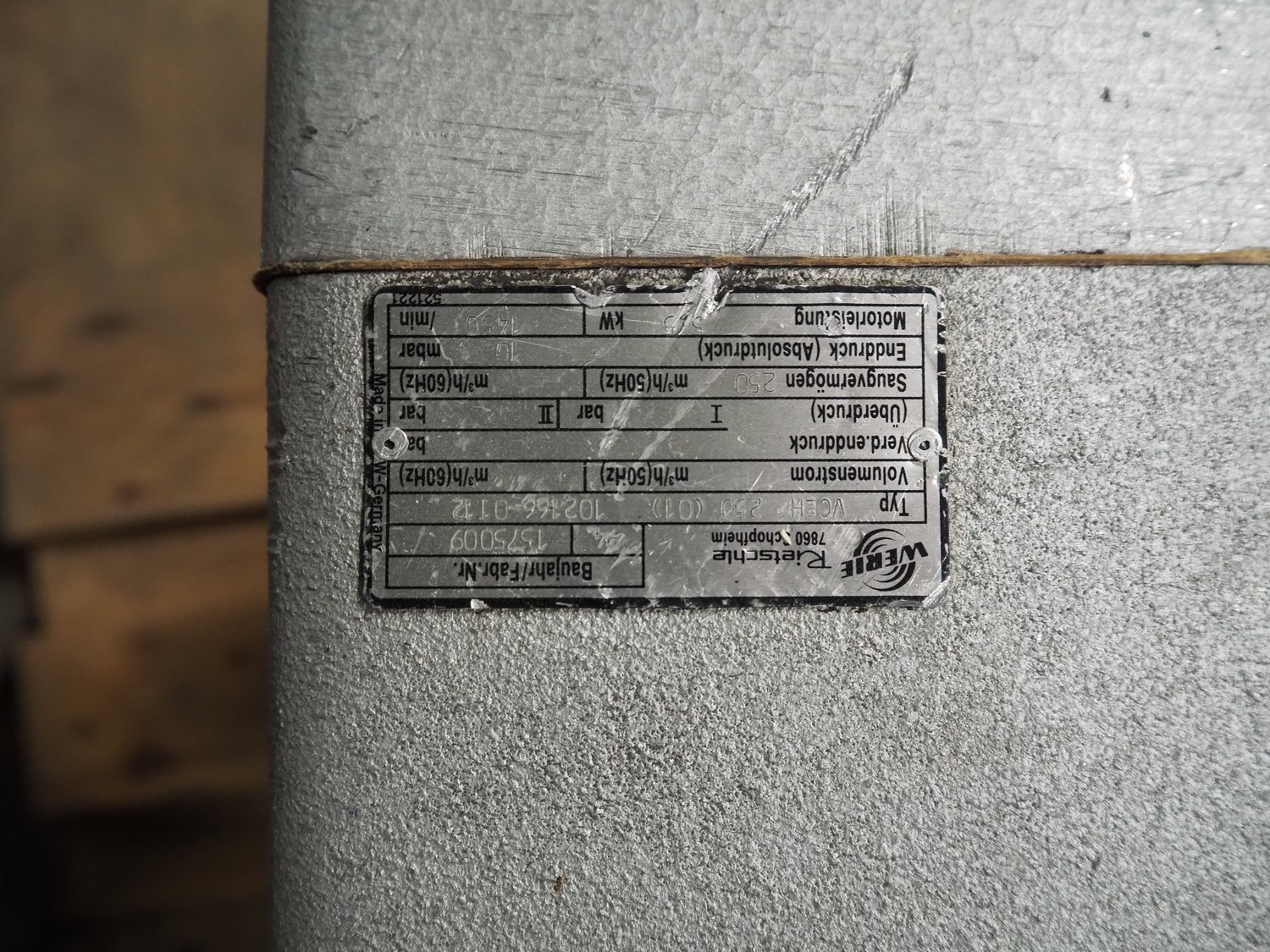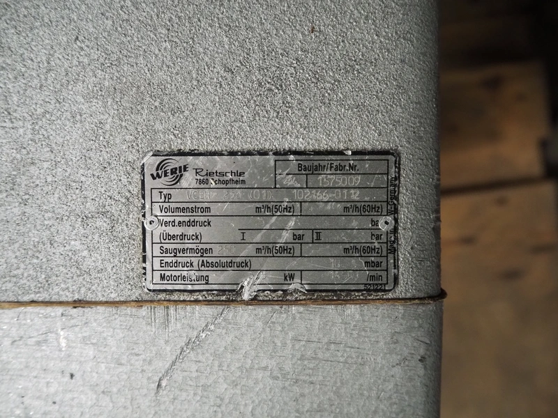 Rietschle vacuum pump, type: VCEH 250(01), number: 1575009, year of construction: 1994, capacity: 250 m³ per hour, dimensions: 900 mm x 650 mm x 460 mm.
