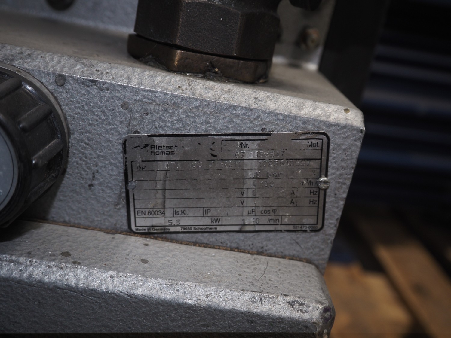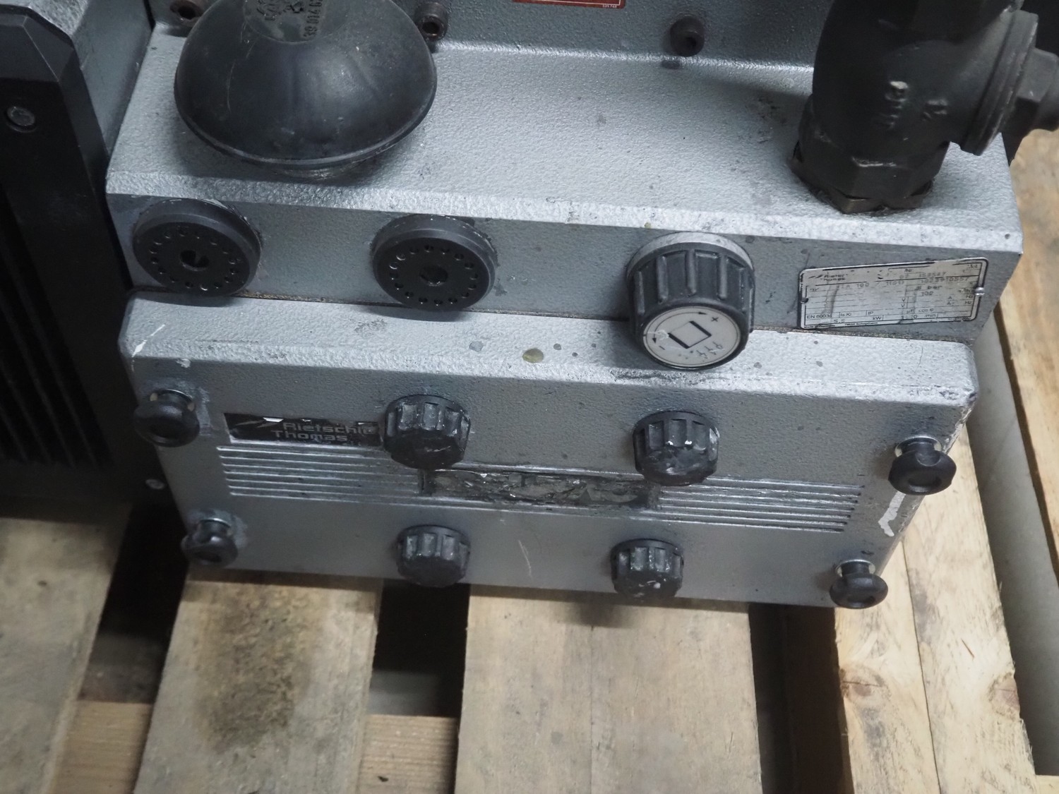 Rietschle vacuum pump, type: DTA 100/1(01), year of construction: 2007, serial number: 2553547, capacity: 100 m³ per hour, dimensions: 950 mm x 450 mm x 600 mm.