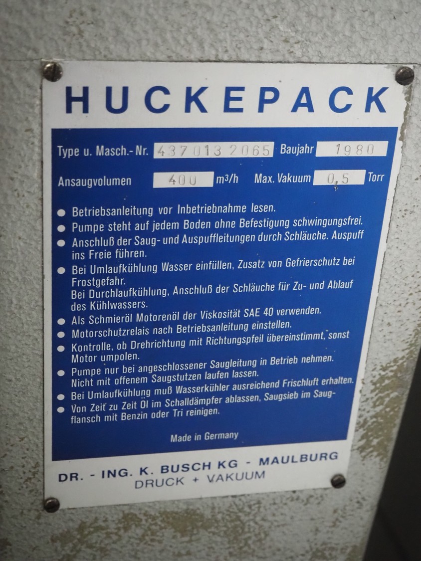 Huckepack vacuum pump, type: 437 013, machine number: 2065, year of construction: 1980, capacity: 400 m³ per hour, dimensions: 1400 mm x 850 mm x 1300 mm.