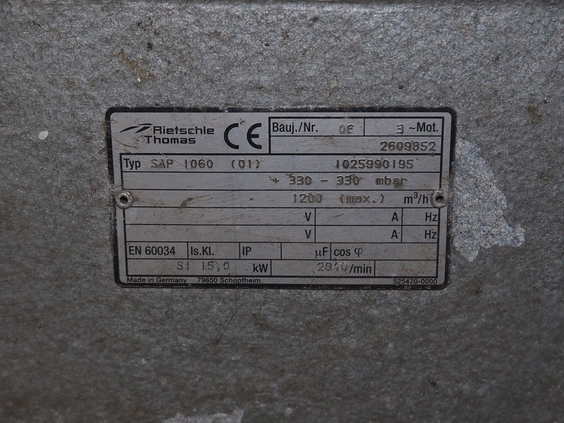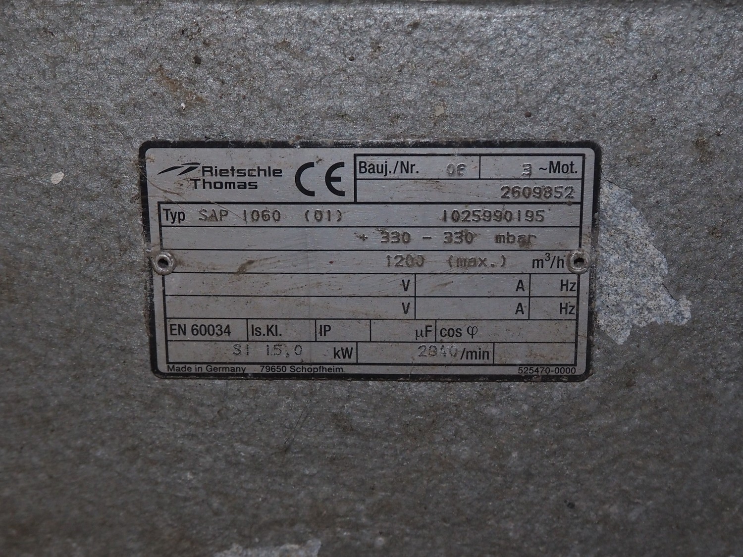 Rietschle Thomas side channel vacuum pump, type: SAP 1060 1012, number: 2609852, 1200 m³ per hour, dimensions: 1050 mm x 600 mm x 750 mm.