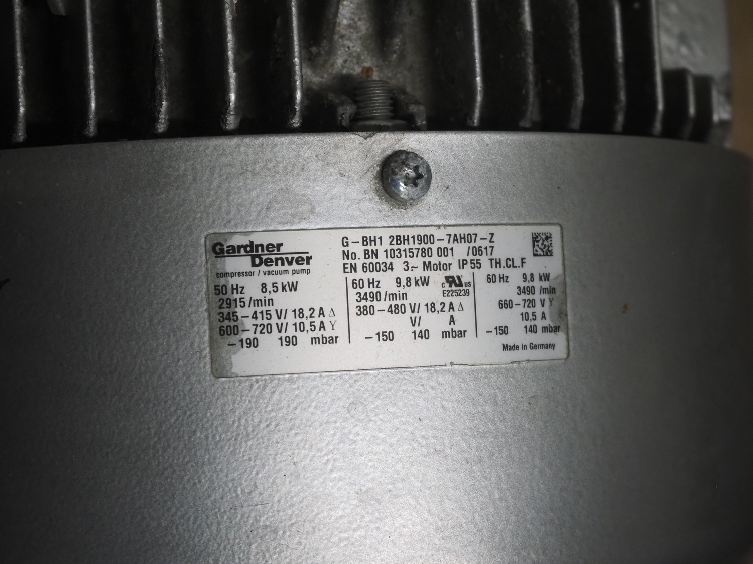Gardner Denver side channel vacuum pump, number: BN 10315780, dimensions: 700 mm x 500 mm x 600 mm.