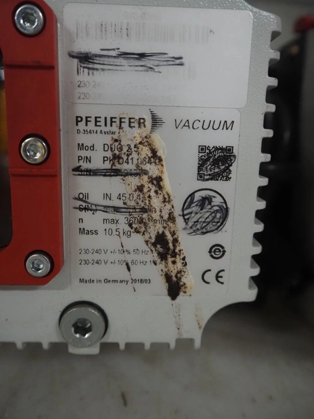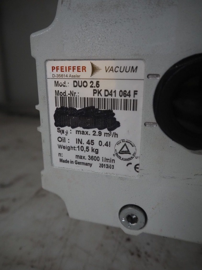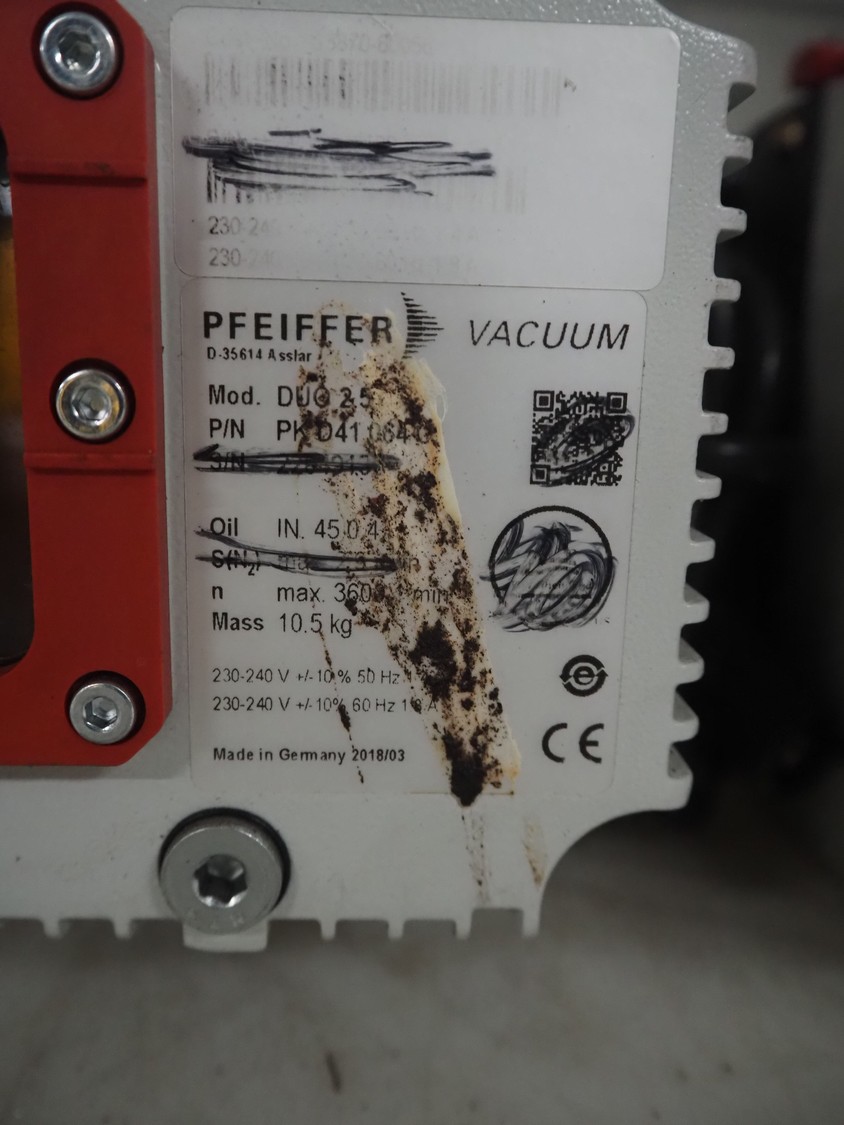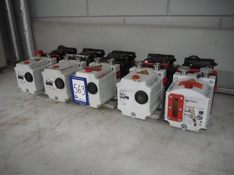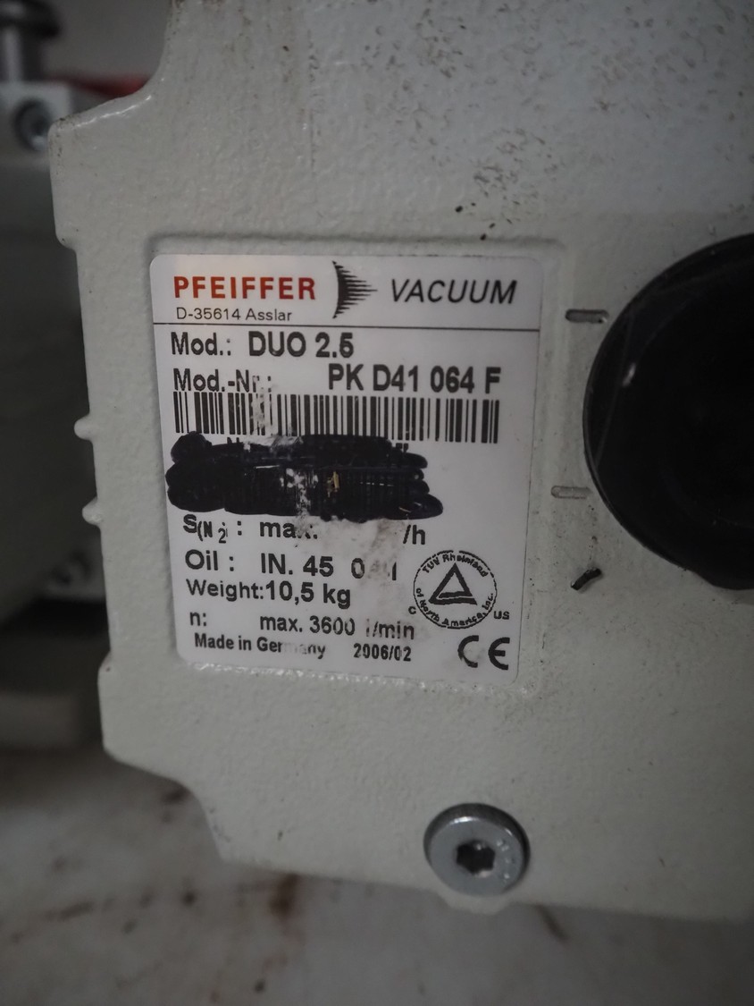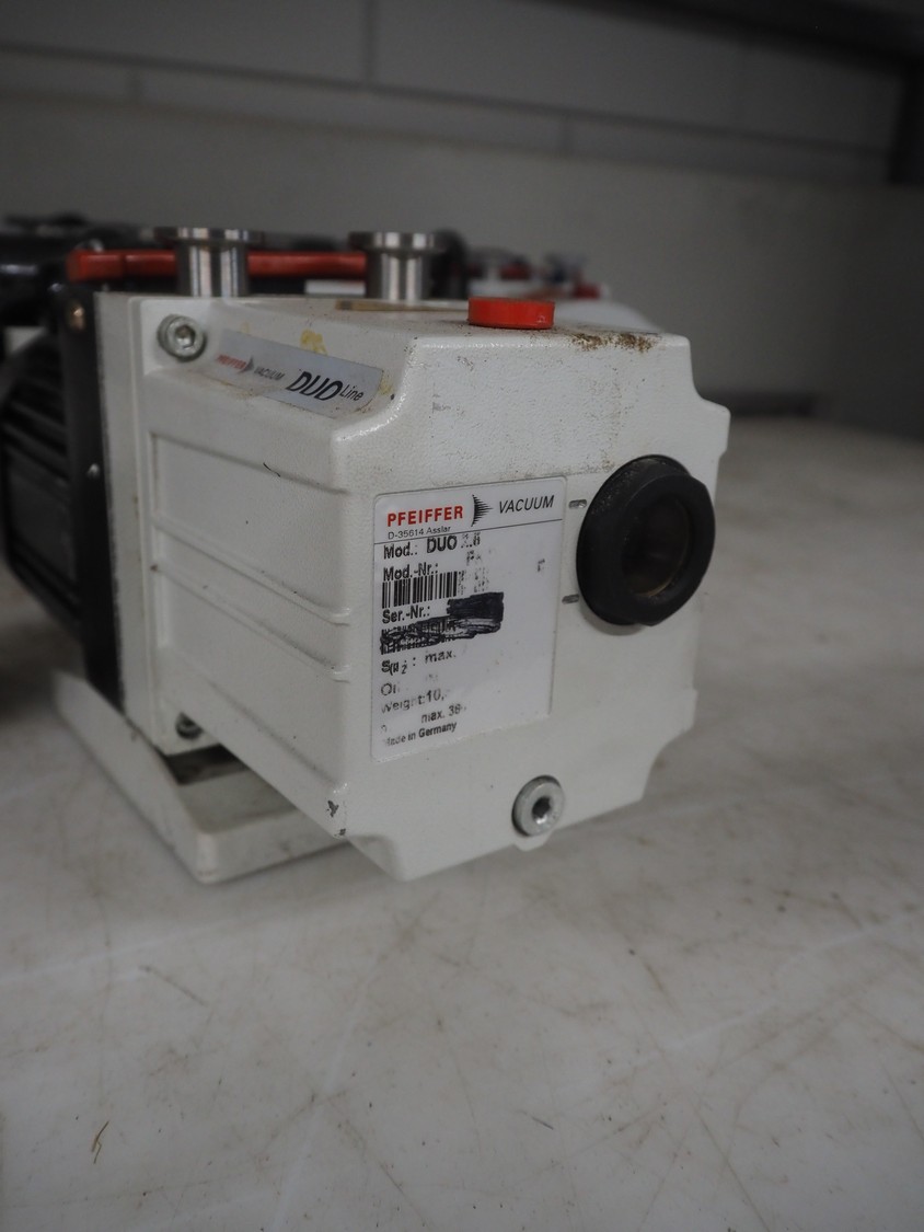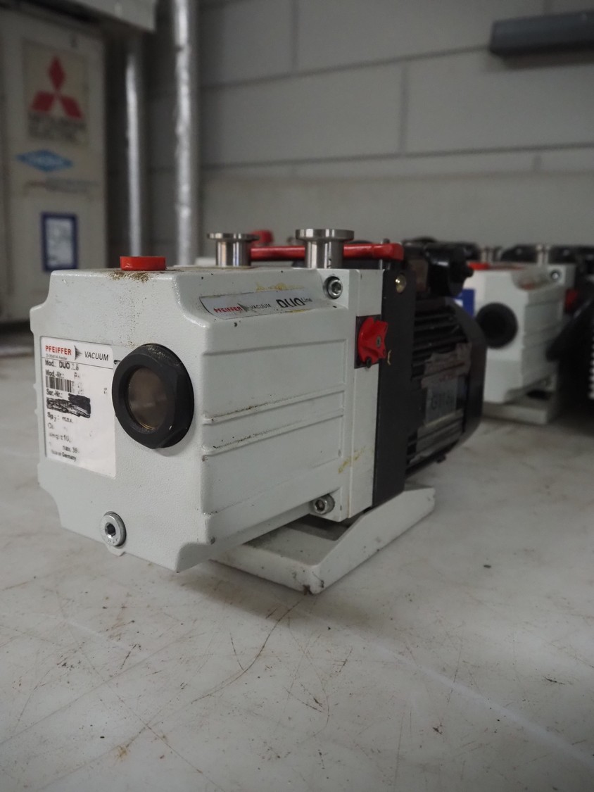 5 Pfeiffer Vacuum pumps, model: DUO 2.5 and DUO 2.6, year of construction: 2018/2013/2006, capacity: 2.9 m³ per hour, weight: 10.5 kg, dimensions: (3x) 310 mm x 120 mm x 190 mm.