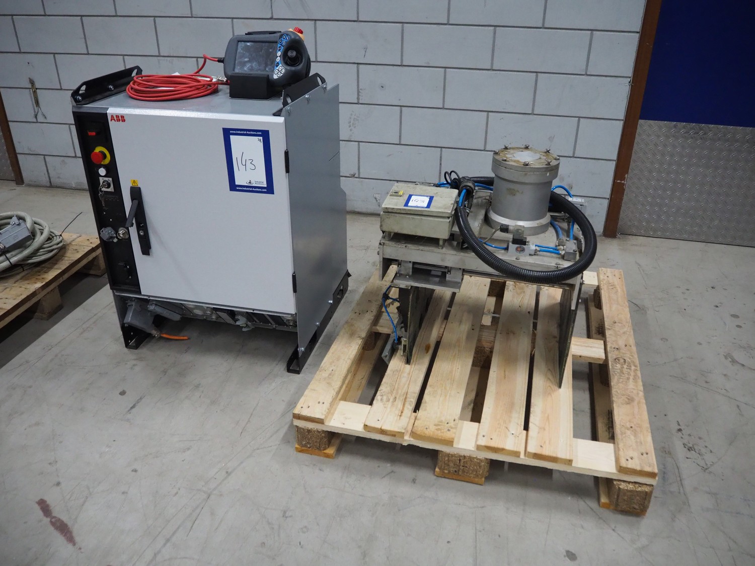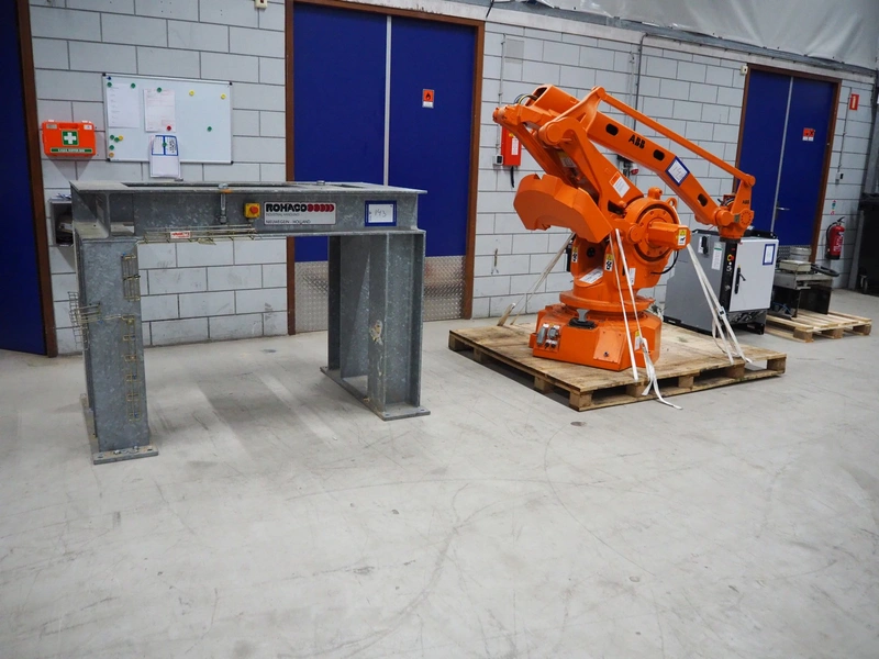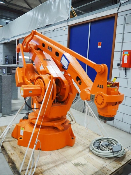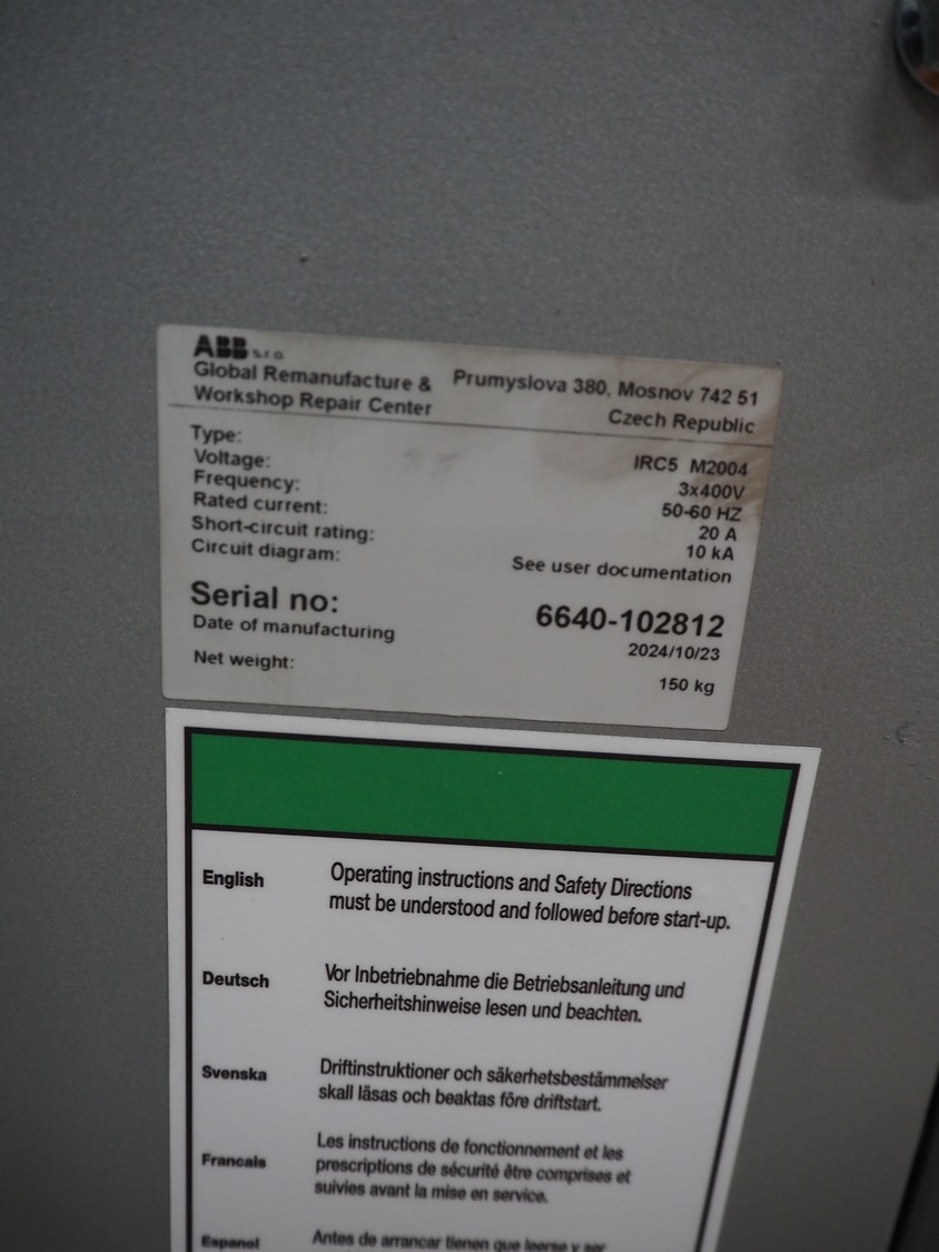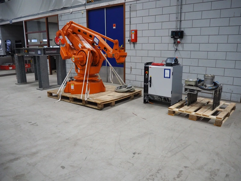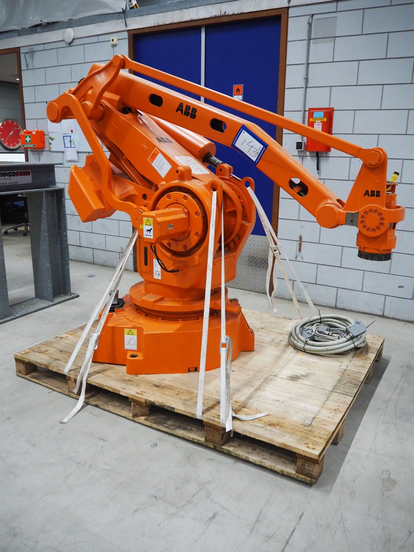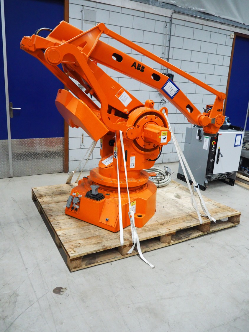 ABB palletizing robot, type robot: IRB 640 M2000, serial number: 64Z-20274, year of construction: 2018/12/12, weight: 1950 kg, type control cabinet: IRC5 M2004, serial number: 6640-102812. year of construction: 2024/10/23, 400 V, 3 Ph, 50-60 Hz, 20 A, weight: 150 kg, dimensions robot: 1800 mm x 950 mm x 1900 mm, dimensions steel frame for robot: 1800 mm x 950 mm x 1300 mm, dimensions control cabinet: 700 mm x 580 mm x 900 mm, dimensions gripper: 600 mm x 550 mm x 600 mm.