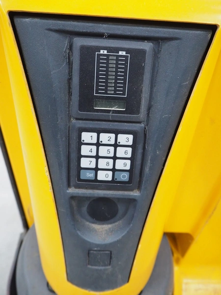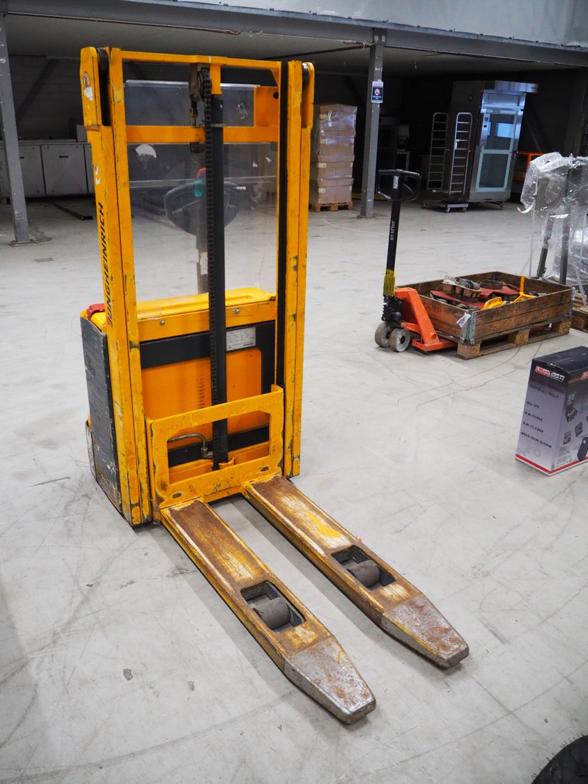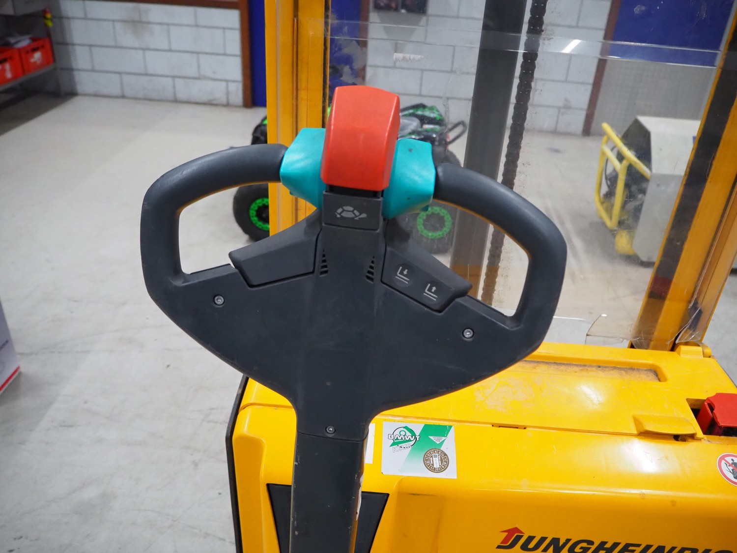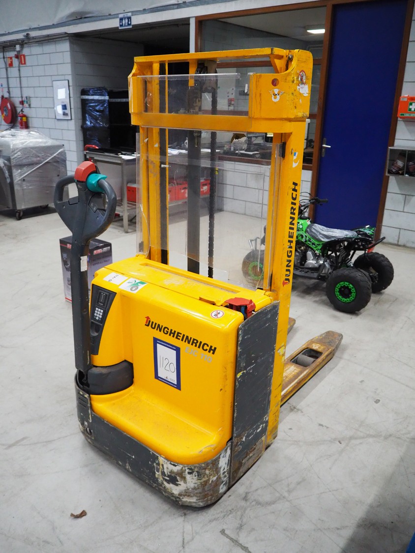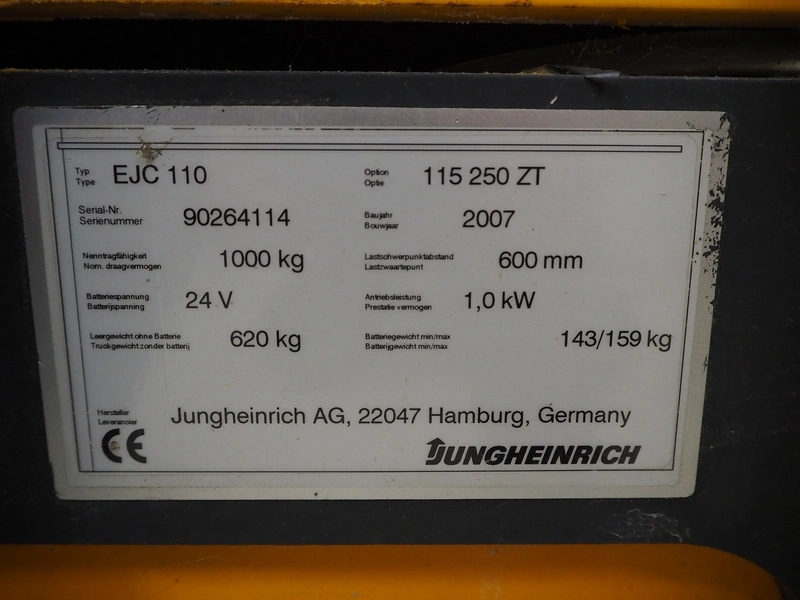 Jungheinrich electric pallet lifter, type: EJC 110, number: 90264114, year of construction: 2007, capacity: 1000 kg, weight without battery: 620 kg, battery weight: 143/159 kg, fork length: 1150 mm, total dimensions: 2050 mm x 850 mm x 1700 mm.