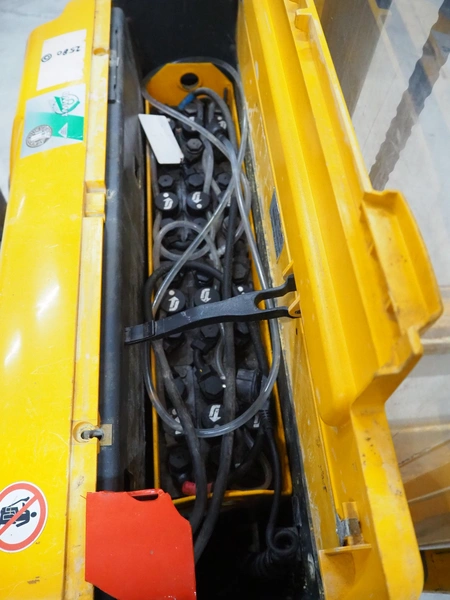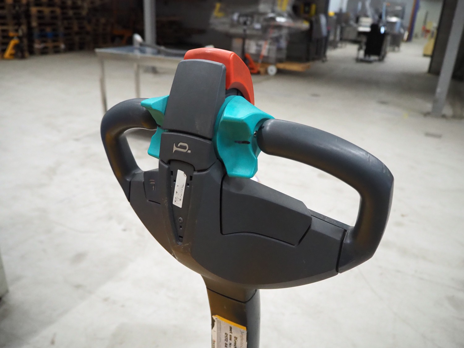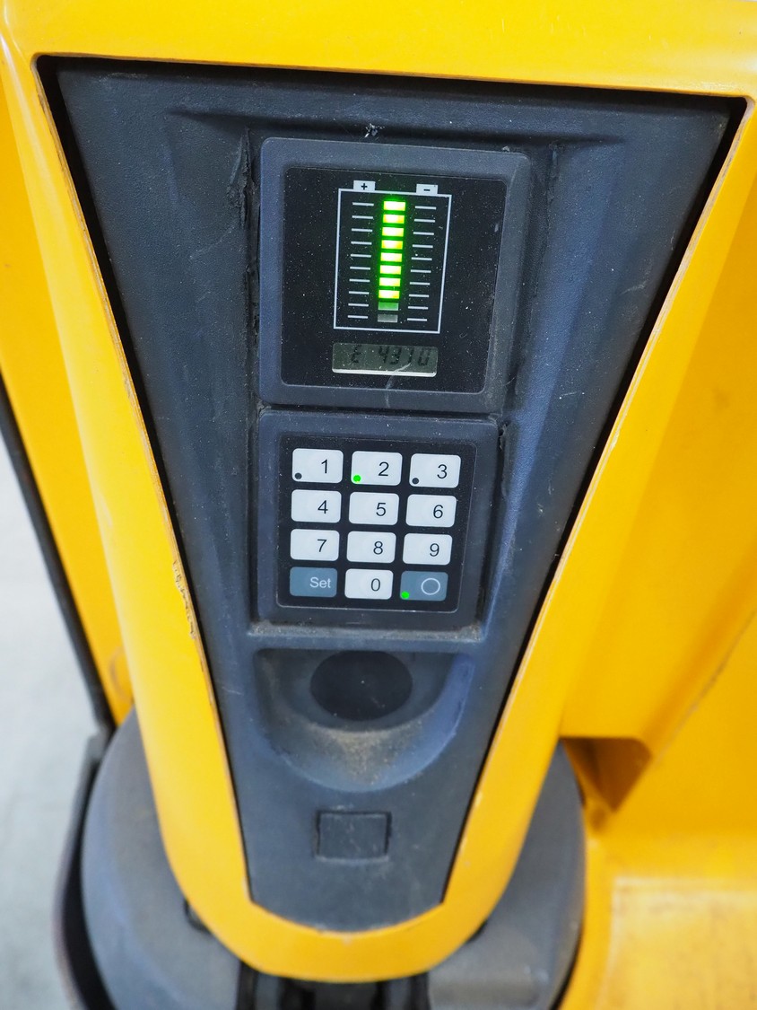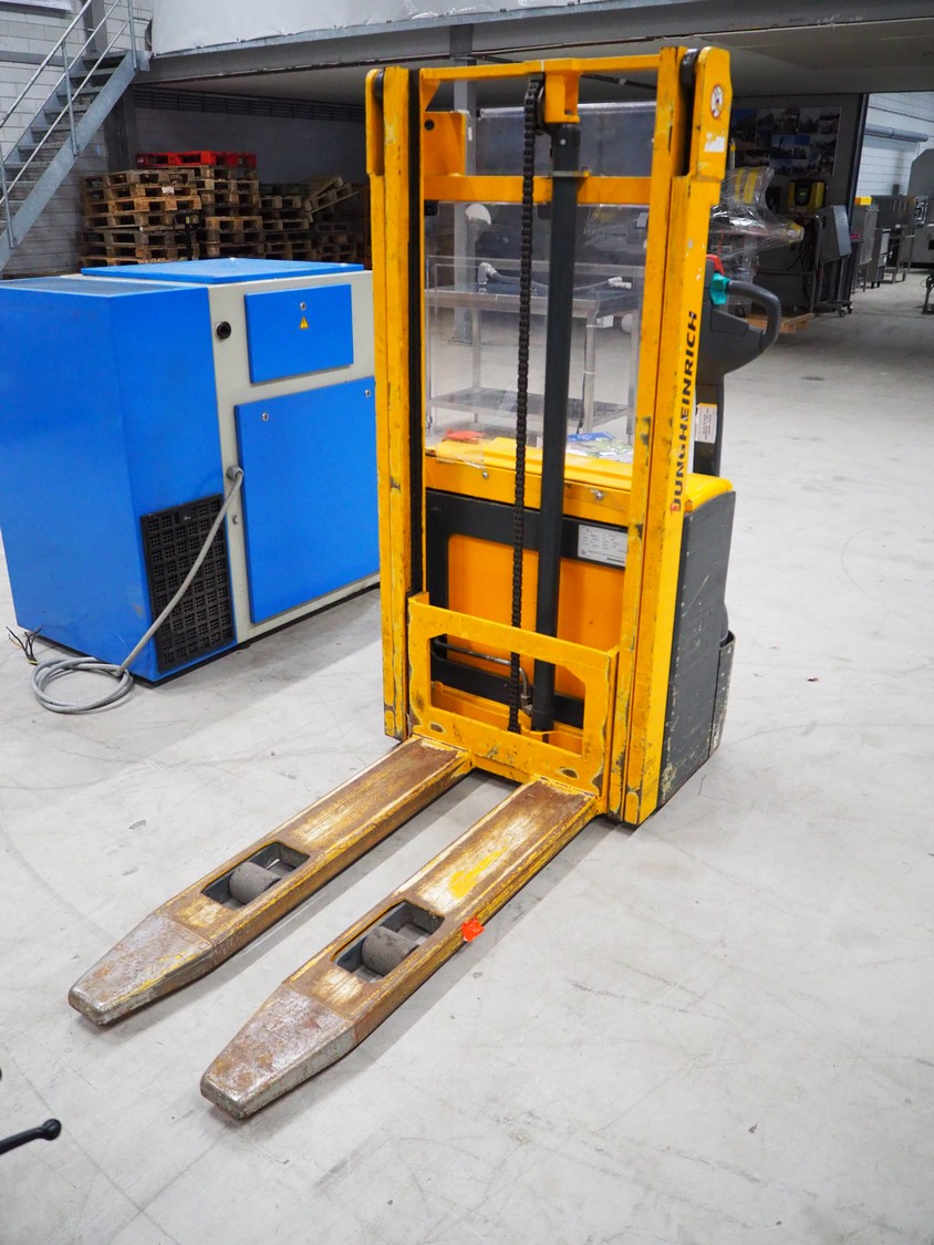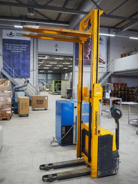 Jungheinrich electric pallet lifter, type: EJC 110, number: 90264114, year of construction: 2007, capacity: 1000 kg, weight without battery: 620 kg, battery weight: 143/159 kg, fork length: 1150 mm, total dimensions: 2050 mm x 850 mm x 1700 mm.