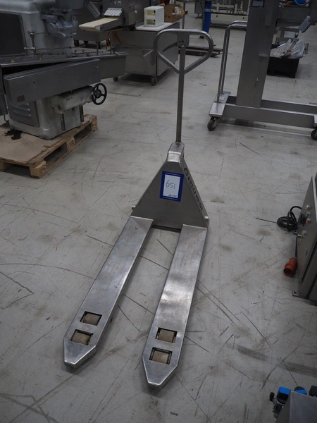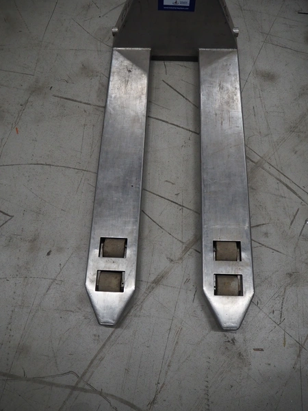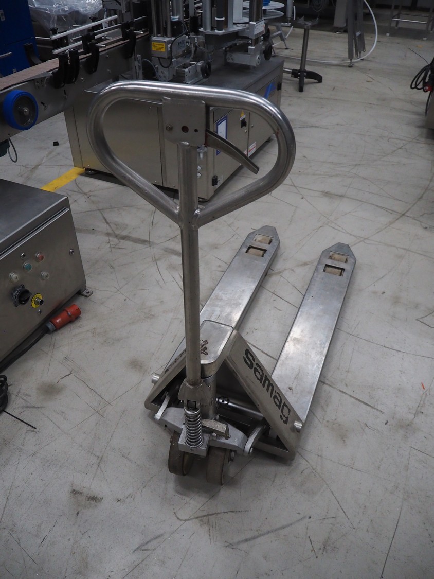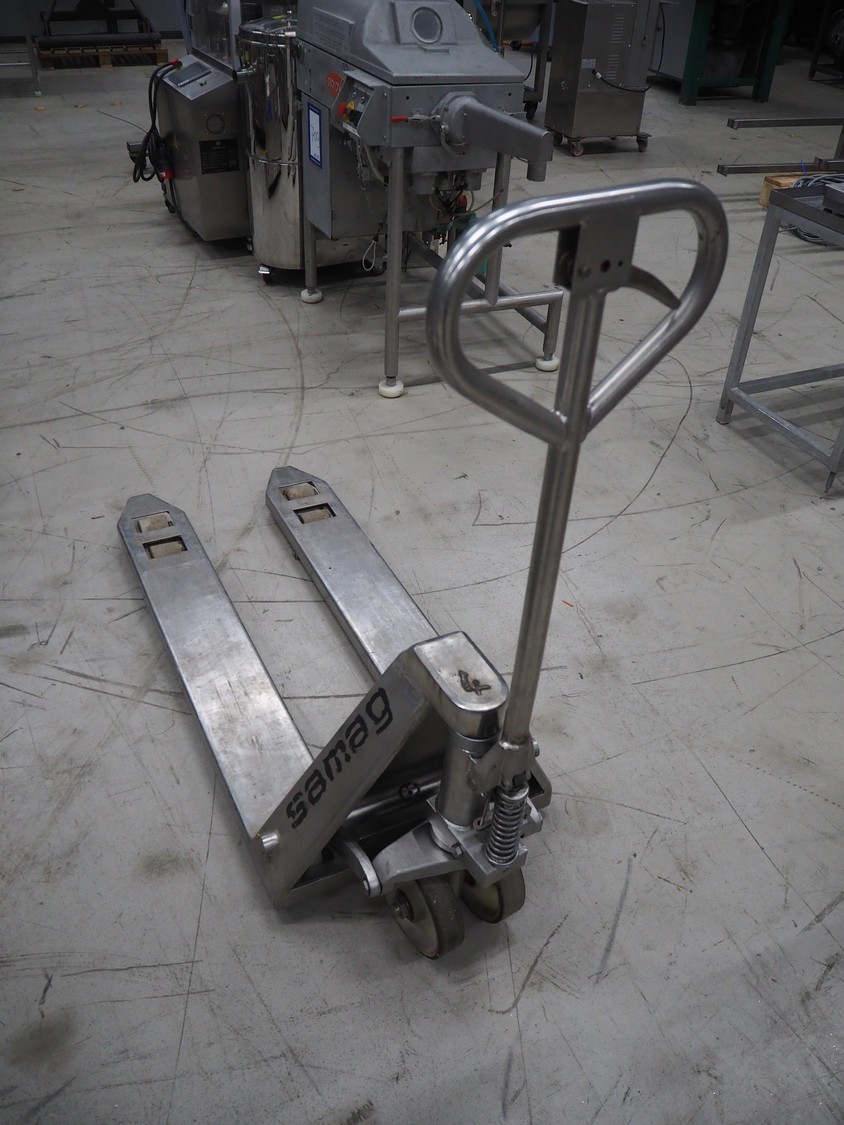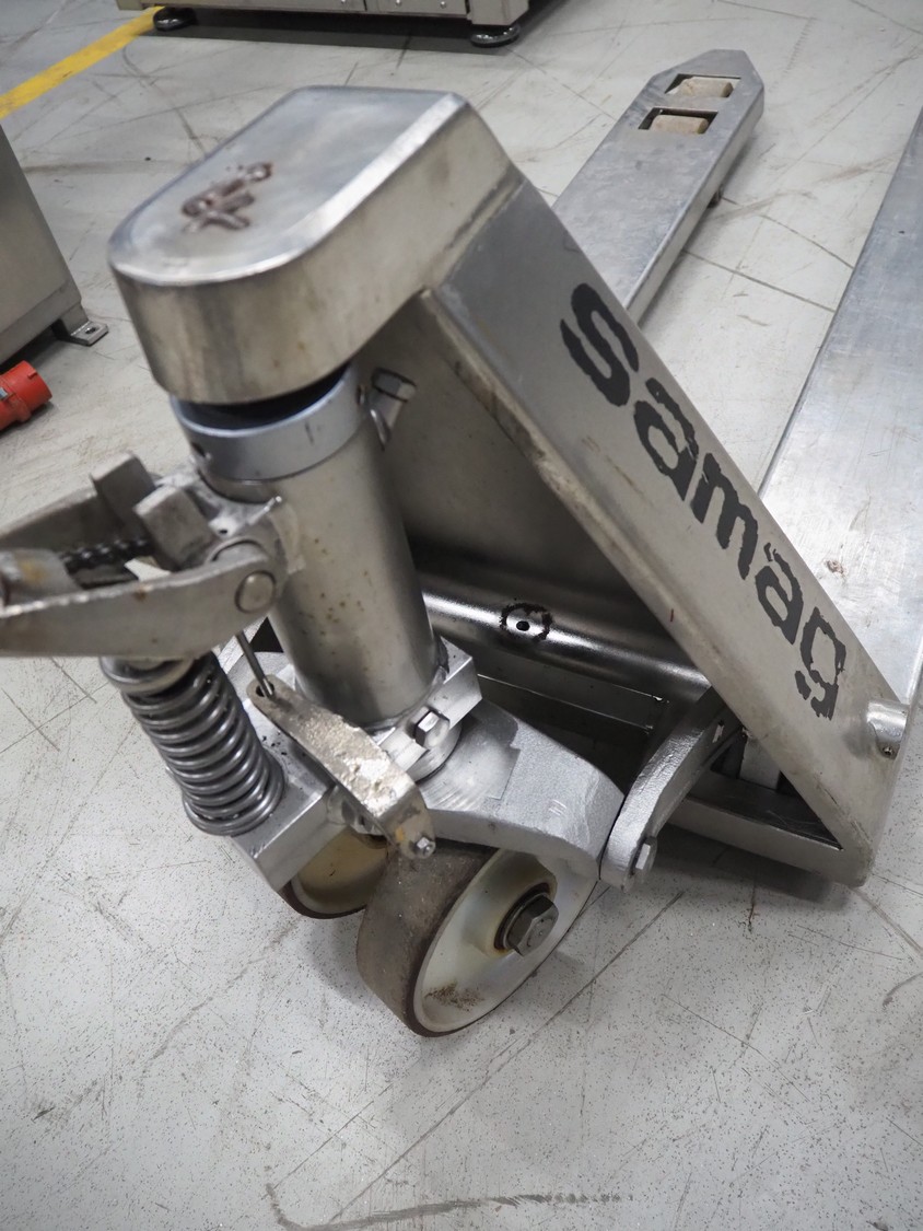 Samag s/s pallet lifter, fork length: 1150 mm, total dimensions: 1450 mm x 470 mm x 170 mm. Defect.