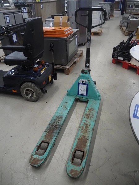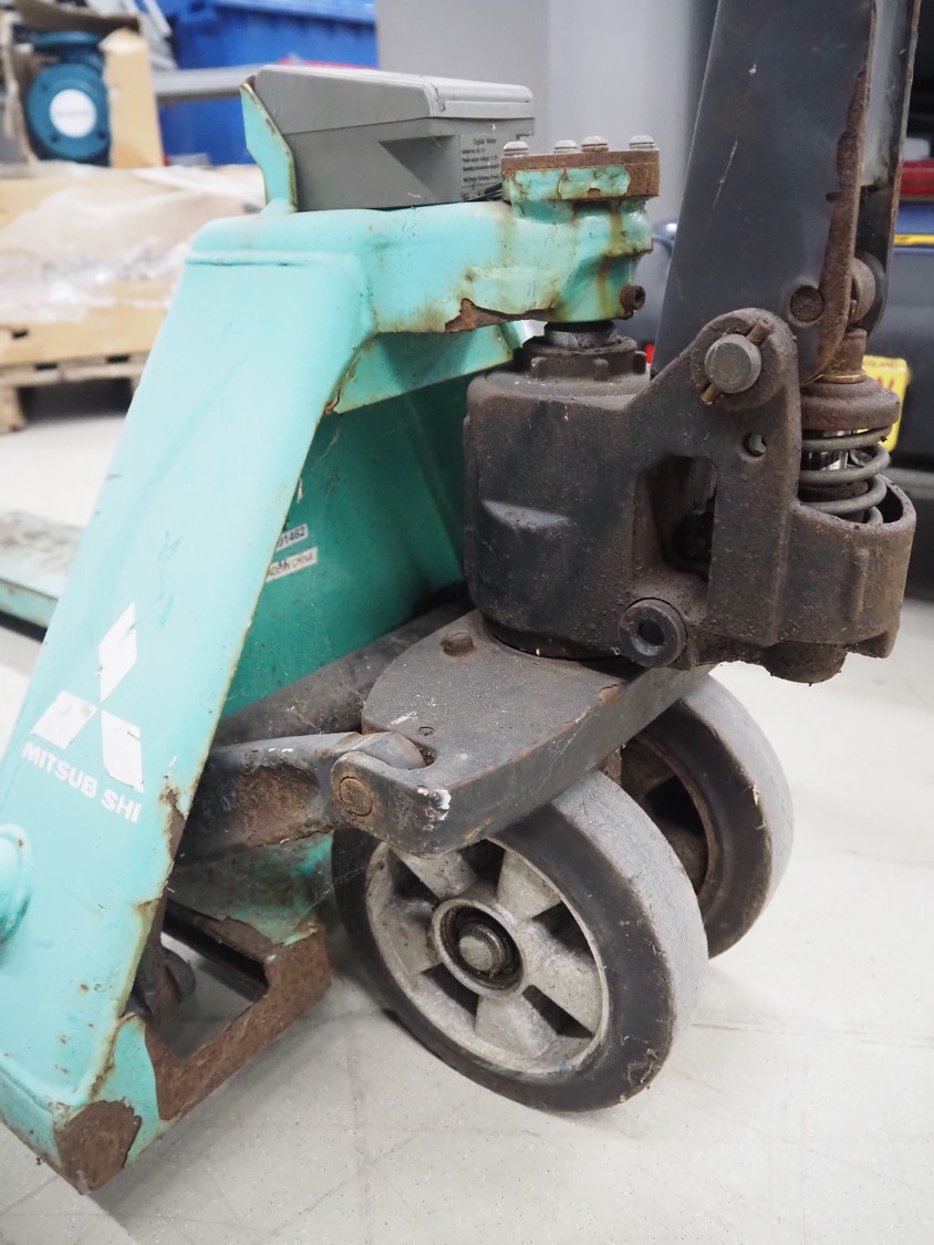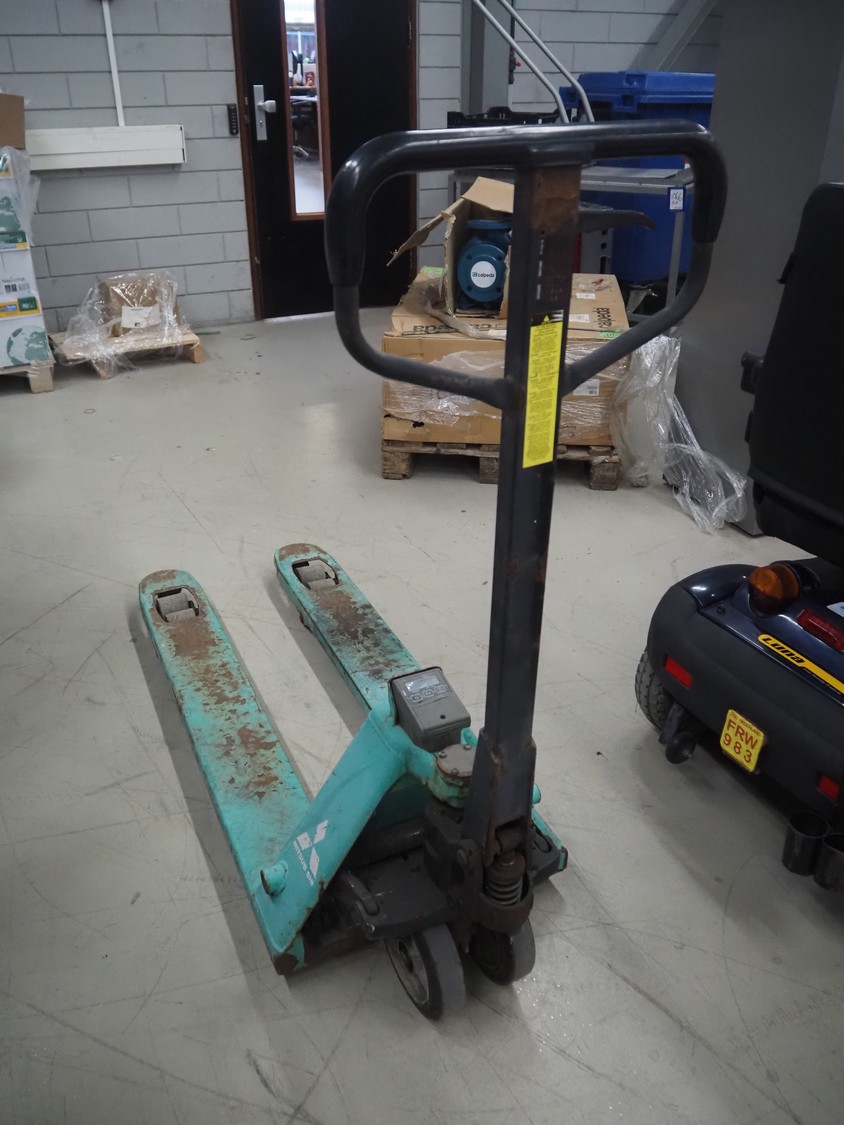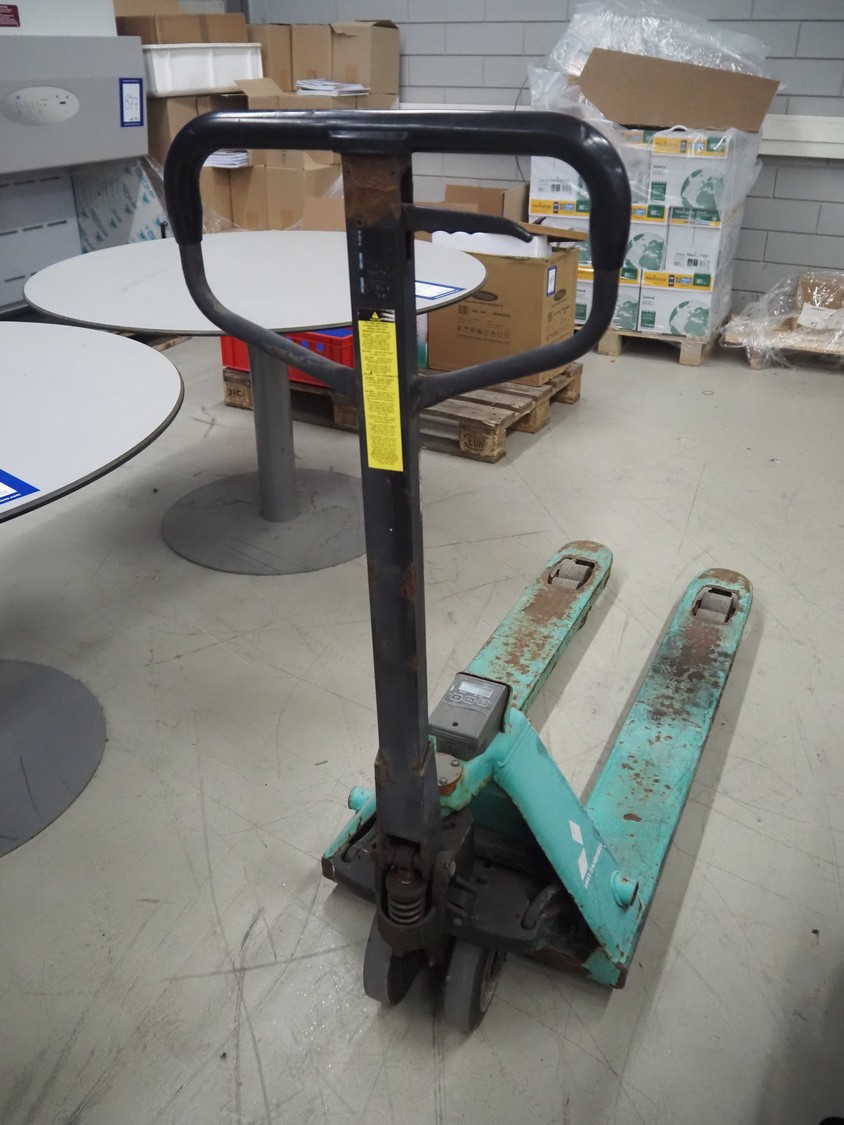 Mitsubishi pallet lifter with weighing option, number: 201501462, fork length: 1150 mm, total dimensions: 1500 mm x 520 mm x 1220 mm. Technical condition unknown.