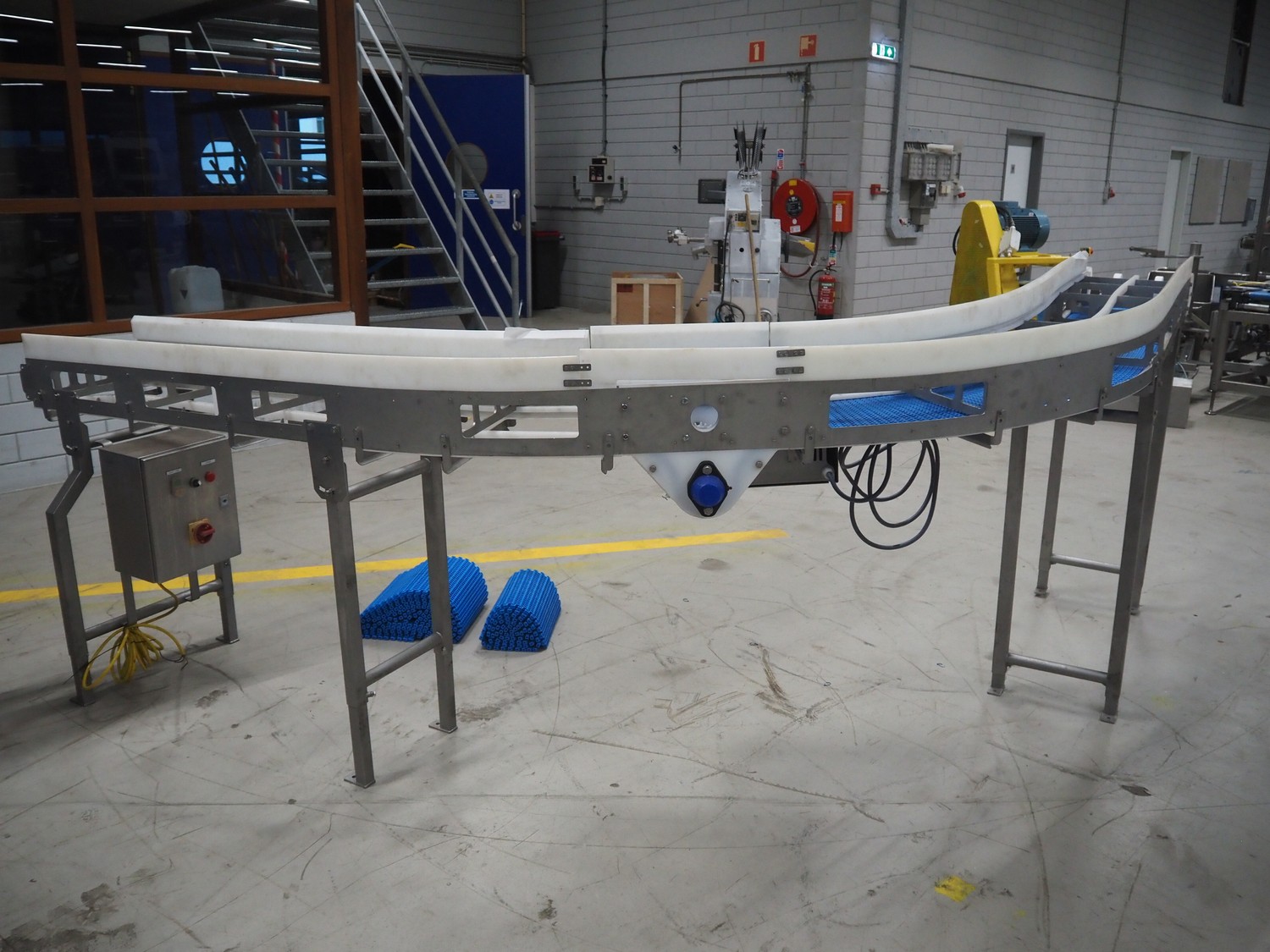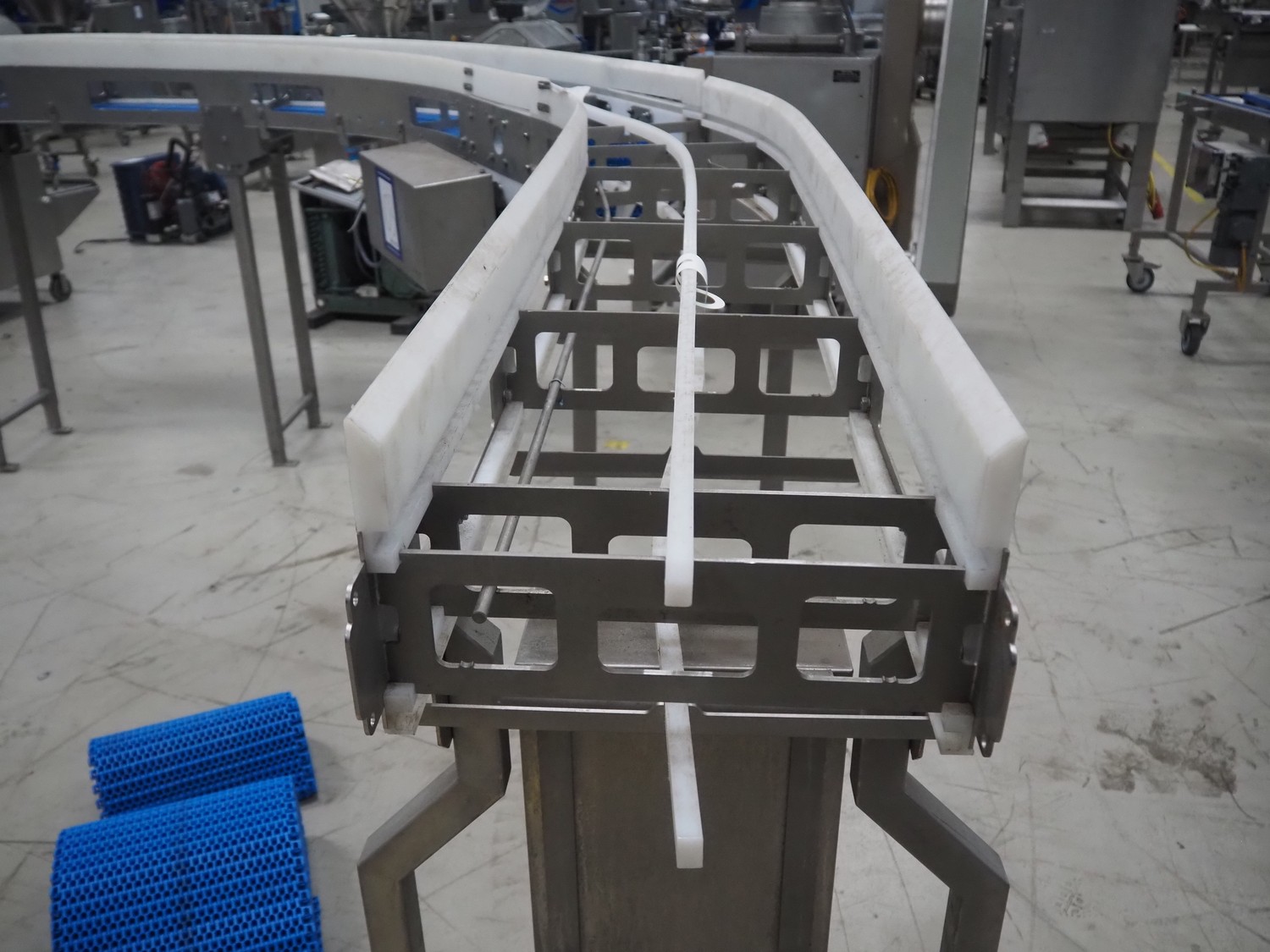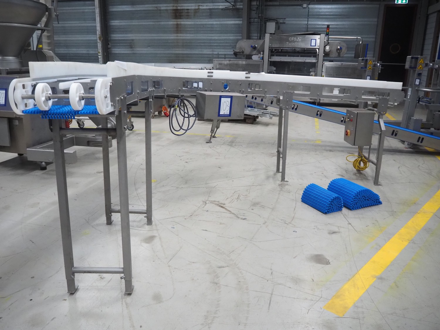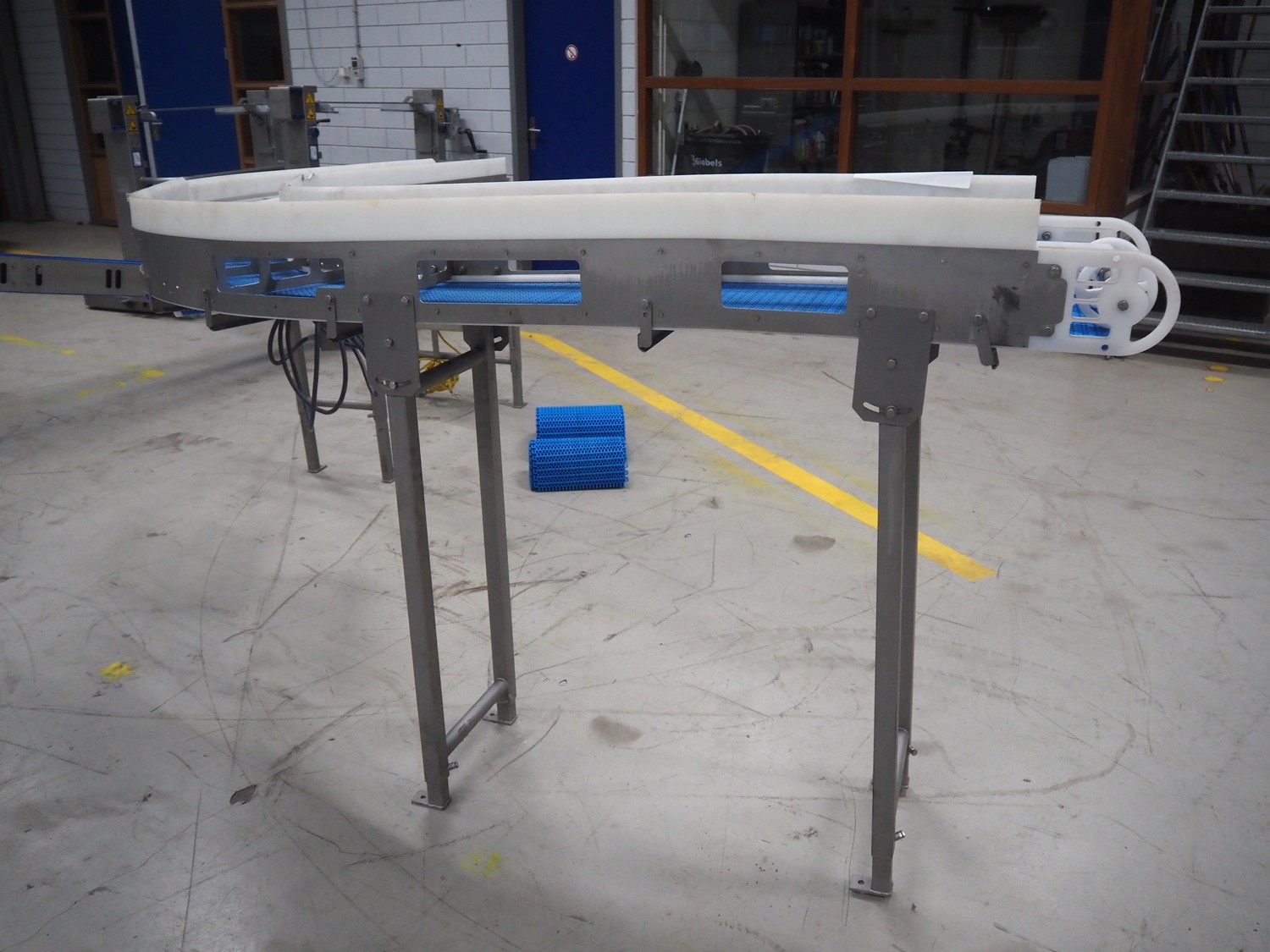 Marvu 90° curve conveyor, s/s frame, plastic mesh belt, belt width: 350 mm, total dimensions: 3500 mm x 2300 mm x 1250 mm.