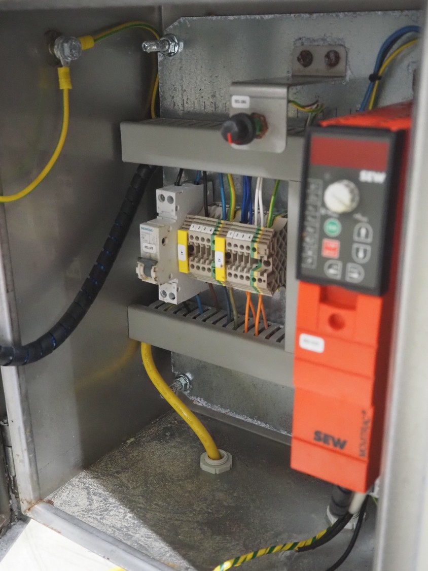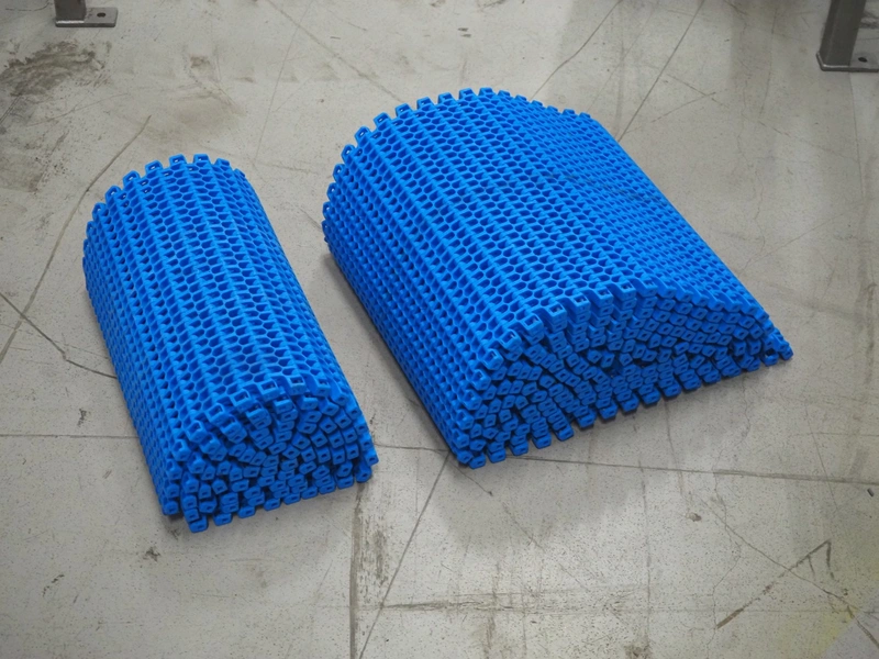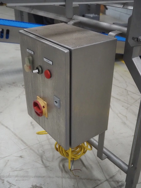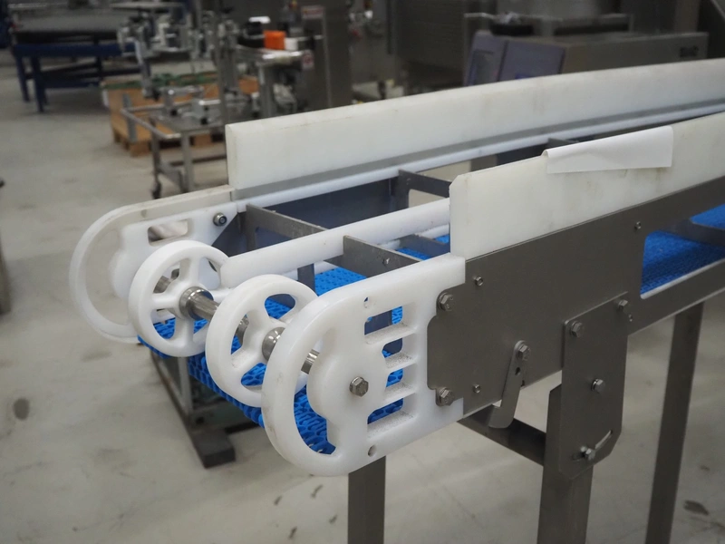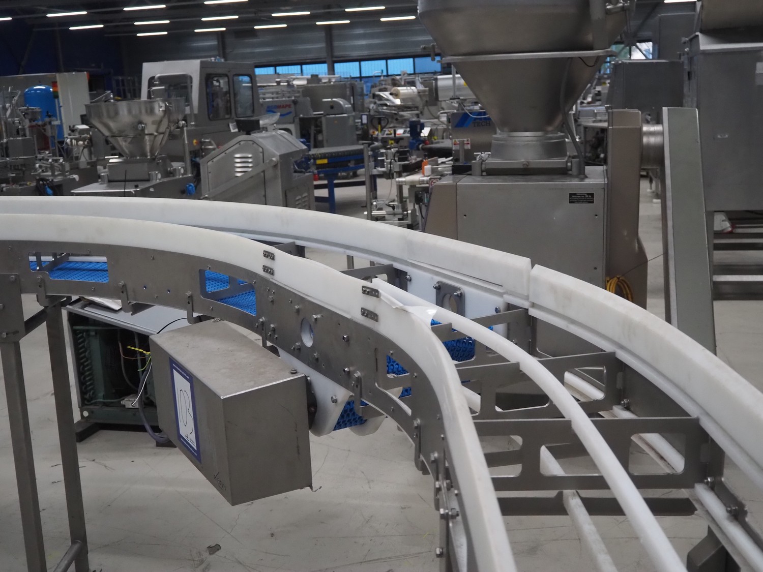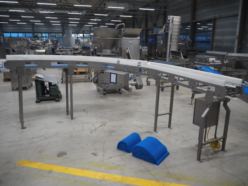 Marvu 90° curve conveyor, s/s frame, plastic mesh belt, belt width: 350 mm, total dimensions: 3500 mm x 2300 mm x 1250 mm.