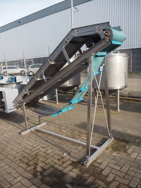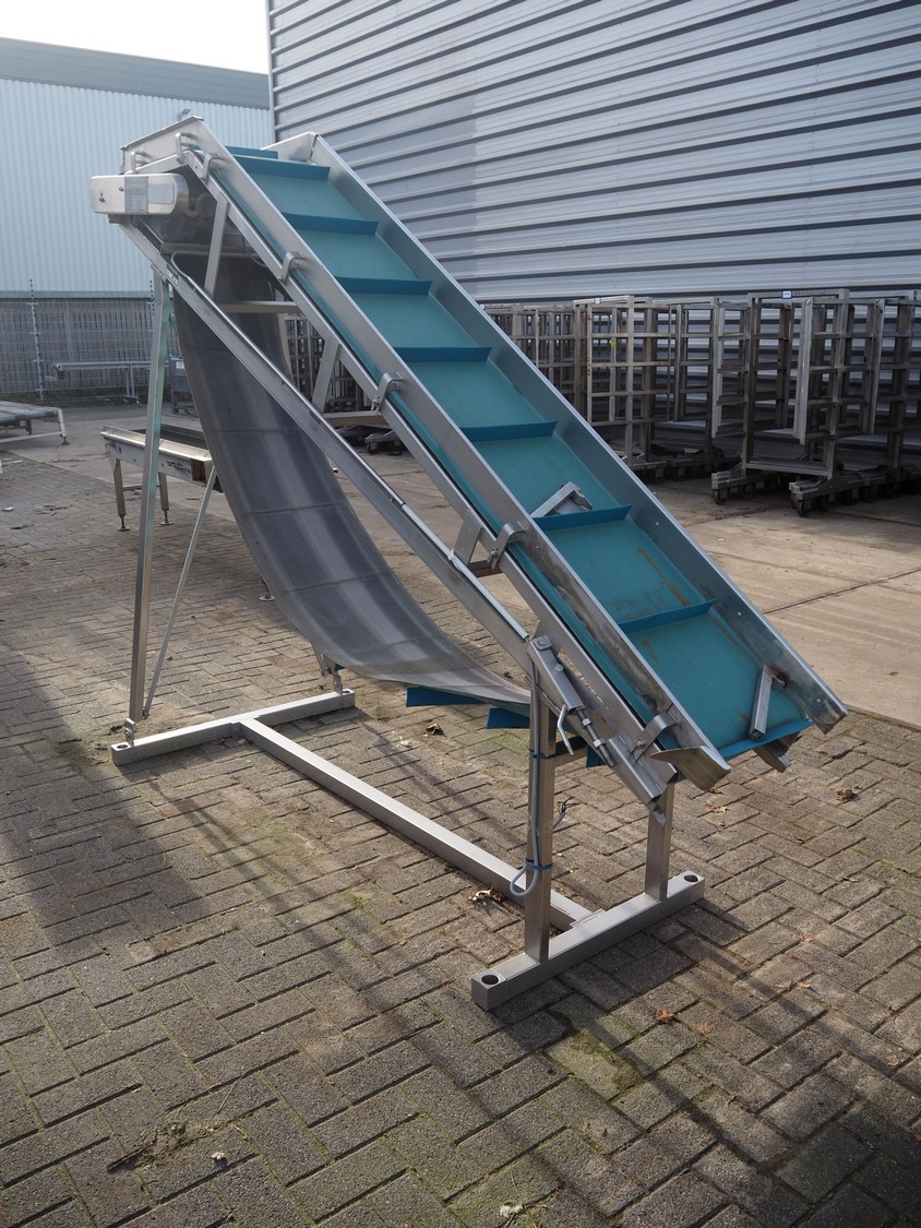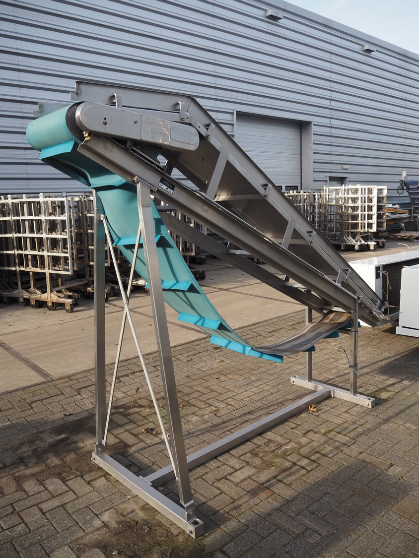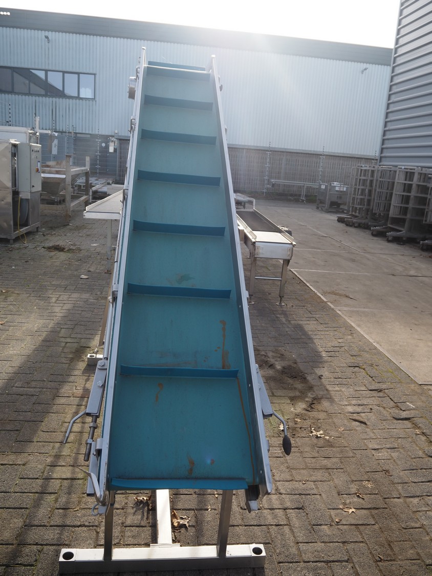 Koppens elevating belt with dividers, s/s frame, plastic belt, type: AVK 3200/450, machine number: AVK 3200/450-94, 380 V, 3 Ph, 50 Hz, 0.87 A, 0.18 kW, weight: 185 kg, belt width: 450 mm, distance between dividers: 330 mm, divider height: 50 mm, elevating height: 2100 mm, total dimensions: 3000 mm x 1100 mm x 2200 mm.