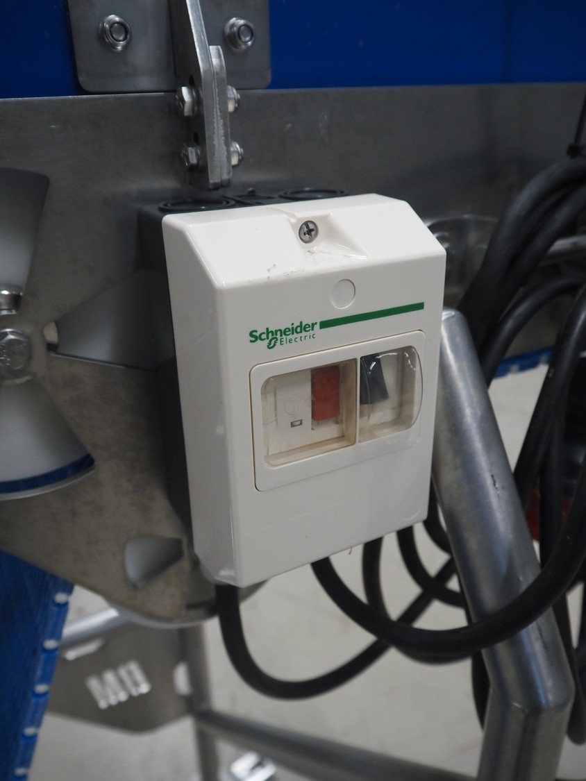 BM mobile elevating belt, s/s frame, plastic mesh belt with dividers, belt width: 215 mm, divider height: 30 mm, distance between dividers: 245 mm, elevating height: 1110 mm, total dimensions: 2550 mm x 600 mm x 1170 mm.