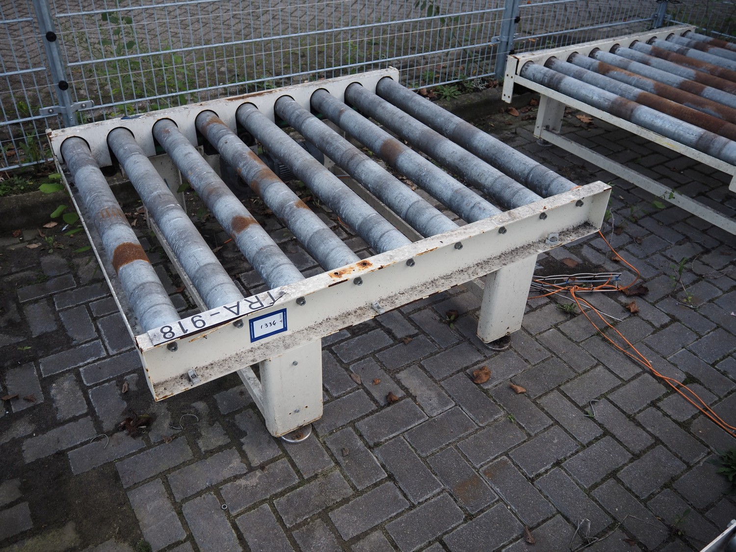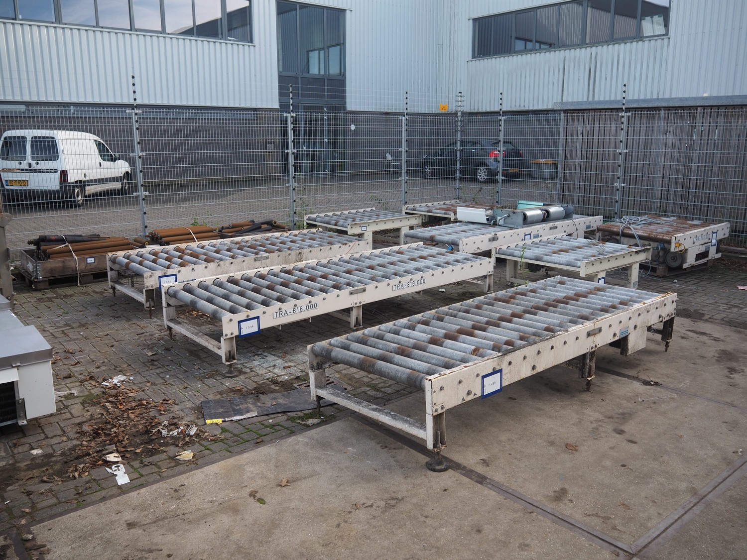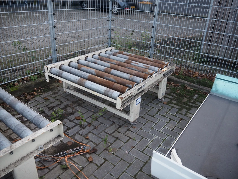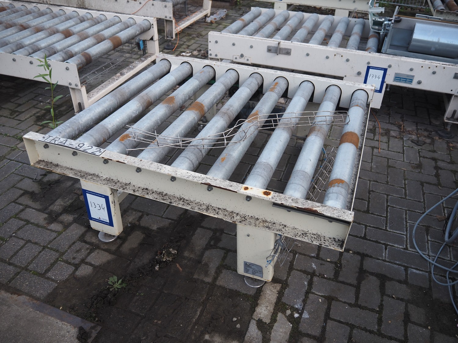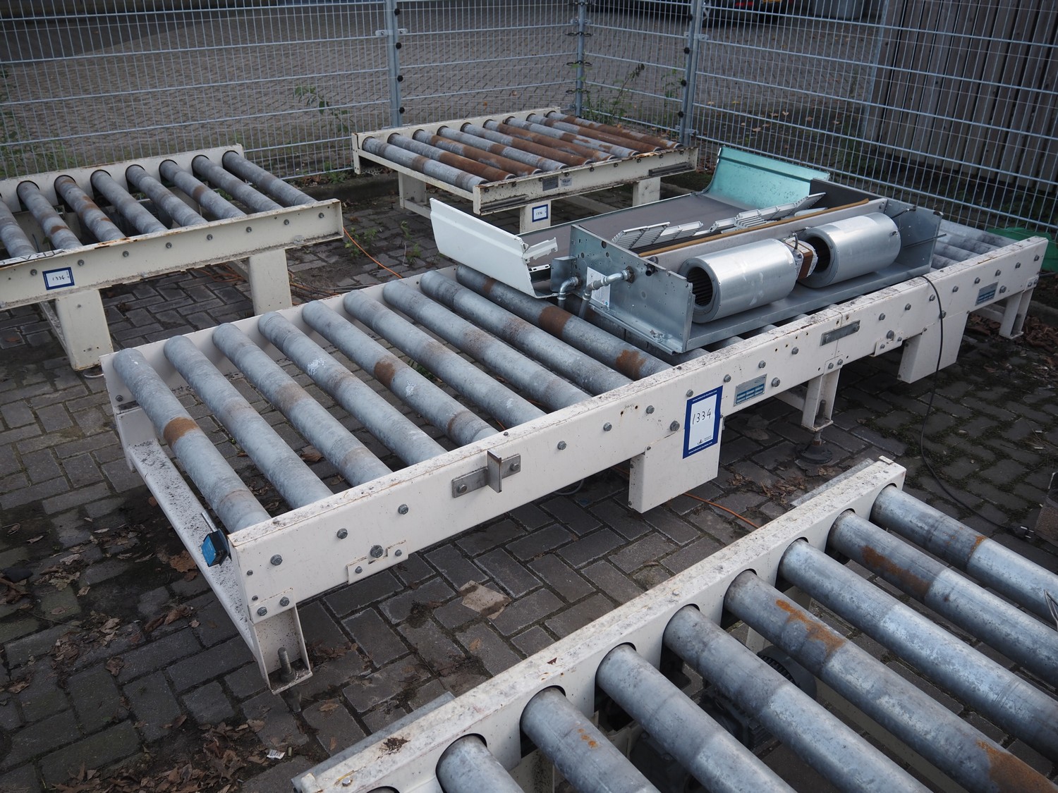 Apollo VTS B.V. / Zlatorog Oprema d.o.o. driven roller conveyor system for pallets, steel rollers, roller width: 1080 mm, total dimensions: (2x) 3300 mm x 1150 mm x 530 mm, 1500 mm x 1300 mm x 620 mm, (2x) 3000 mm x 1150 mm x 530 mm, (2x) 1450 mm x 1300 mm x 530 mm and 1200 mm x 800 mm x 550 mm. With 3 pallets with rollers.