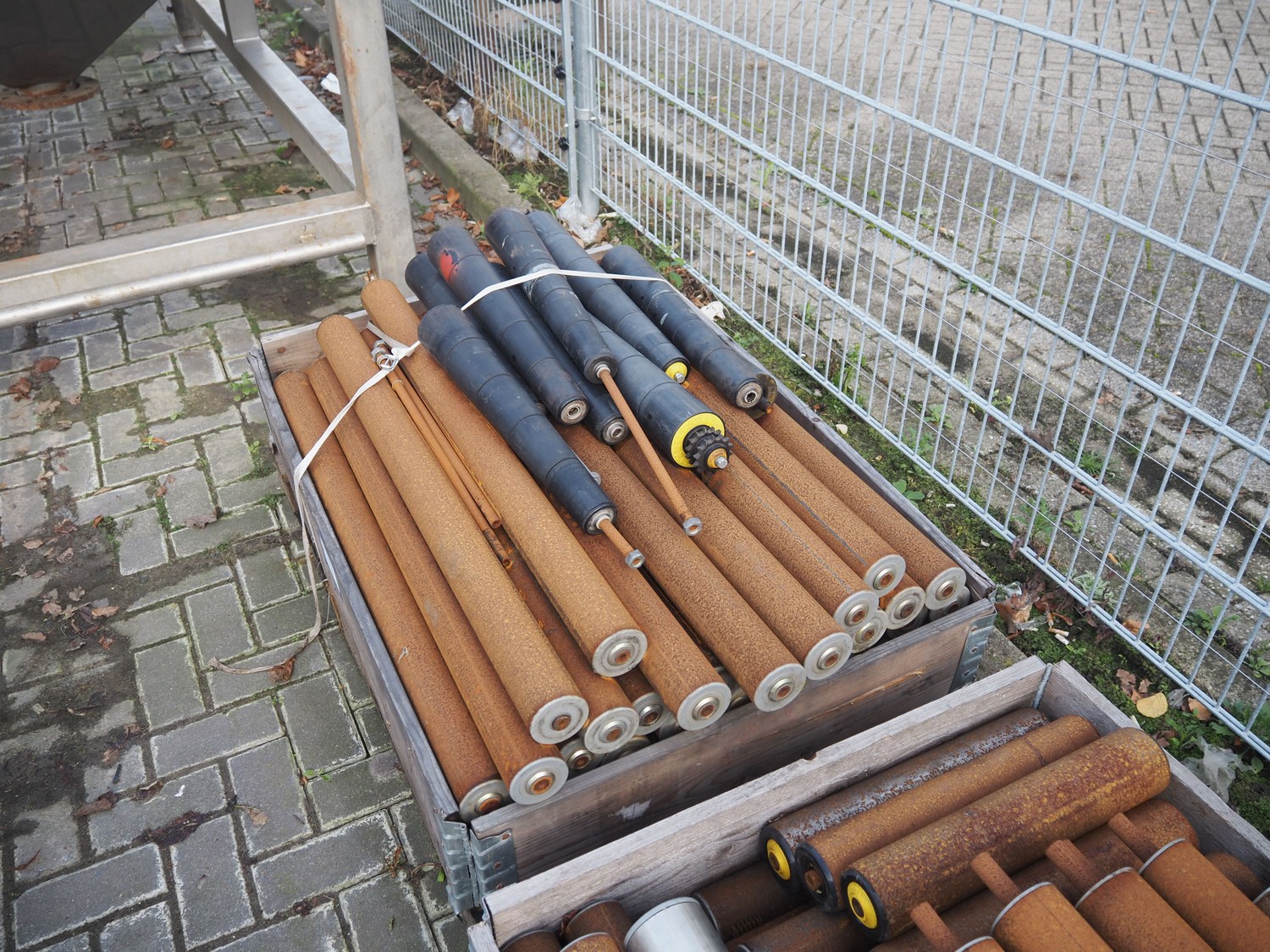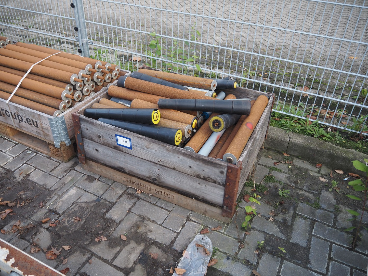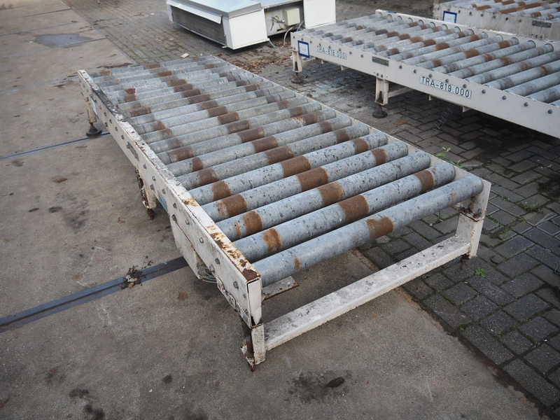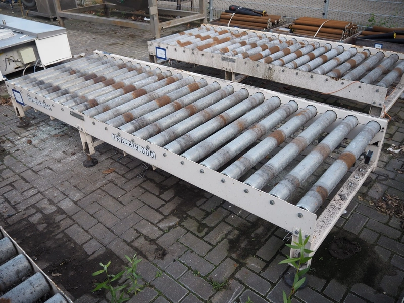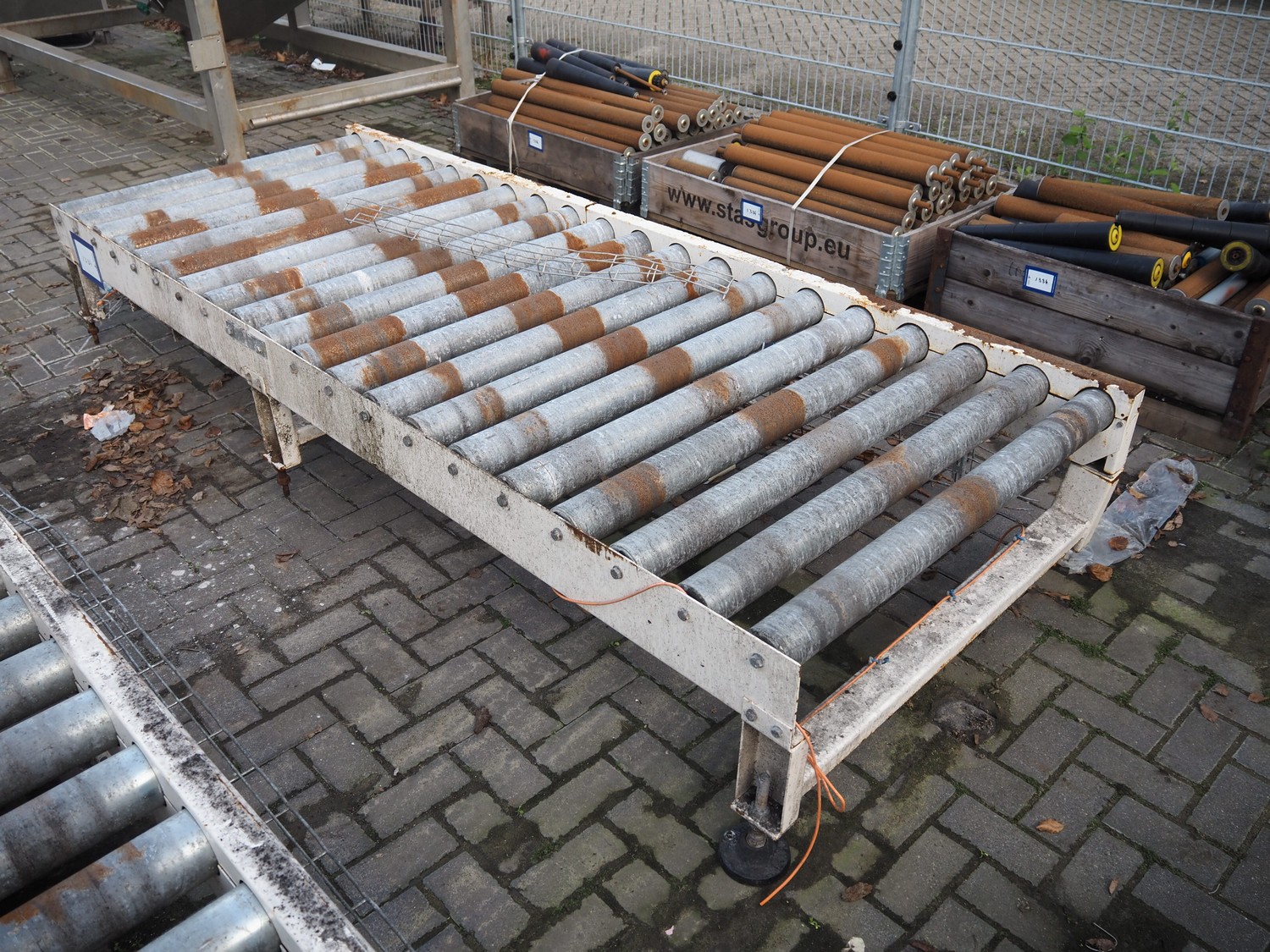 Apollo VTS B.V. / Zlatorog Oprema d.o.o. driven roller conveyor system for pallets, steel rollers, roller width: 1080 mm, total dimensions: (2x) 3300 mm x 1150 mm x 530 mm, 1500 mm x 1300 mm x 620 mm, (2x) 3000 mm x 1150 mm x 530 mm, (2x) 1450 mm x 1300 mm x 530 mm and 1200 mm x 800 mm x 550 mm. With 3 pallets with rollers.