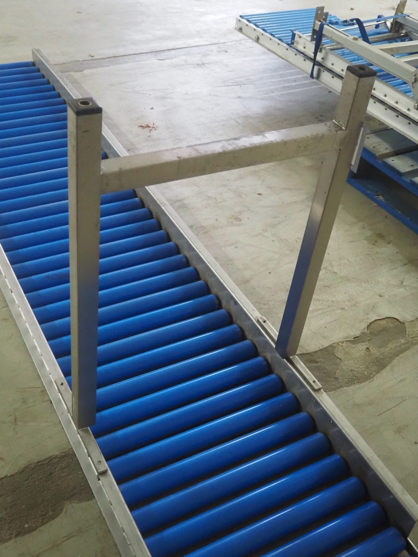 Roller conveyor, s/s frame, plastic rollers, roller width: 495 mm, total dimensions: 2570 mm x 560 mm x 830 mm.