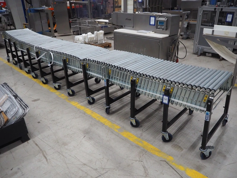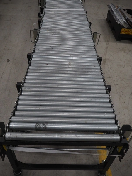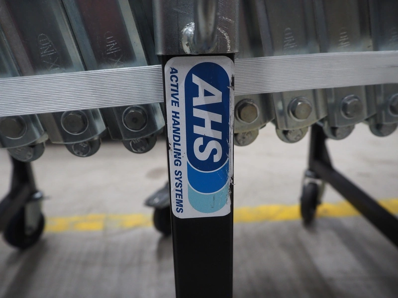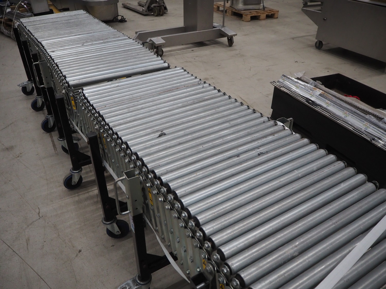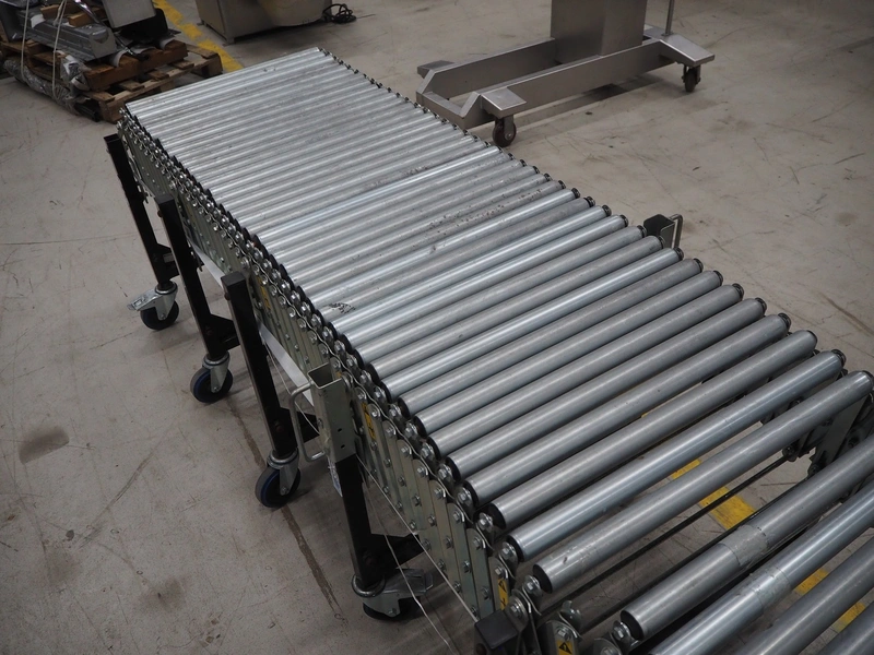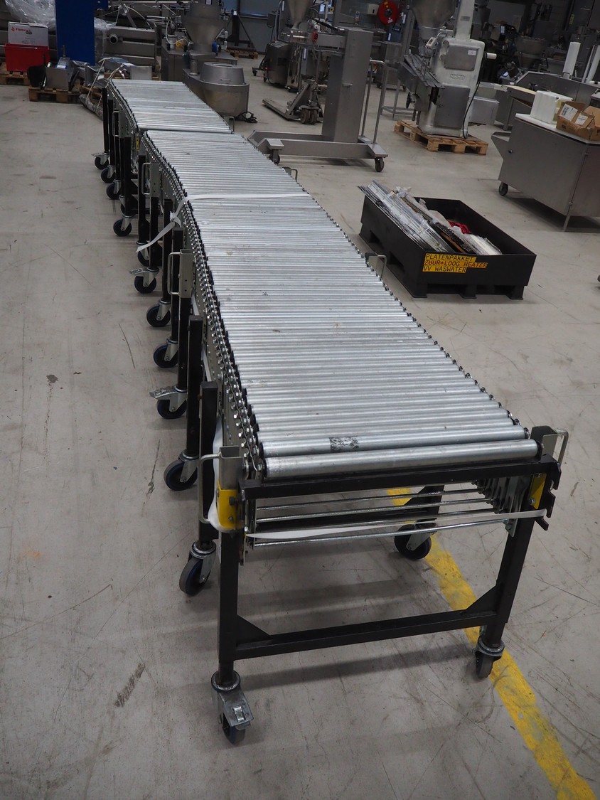 AHS mobile extendable roller conveyor, s/s rollers, roller width: 600 mm, total dimensions: 13500 mm x 870 mm x 830 mm.